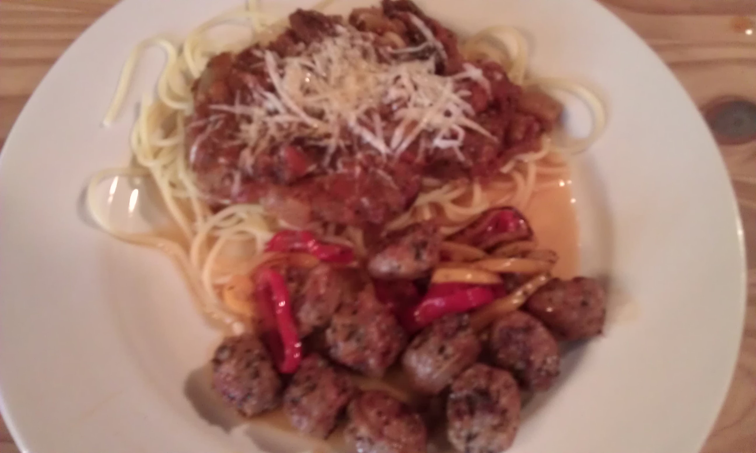 Eggplant and Olive Pasta Sauce with Fried Peppers and Onions