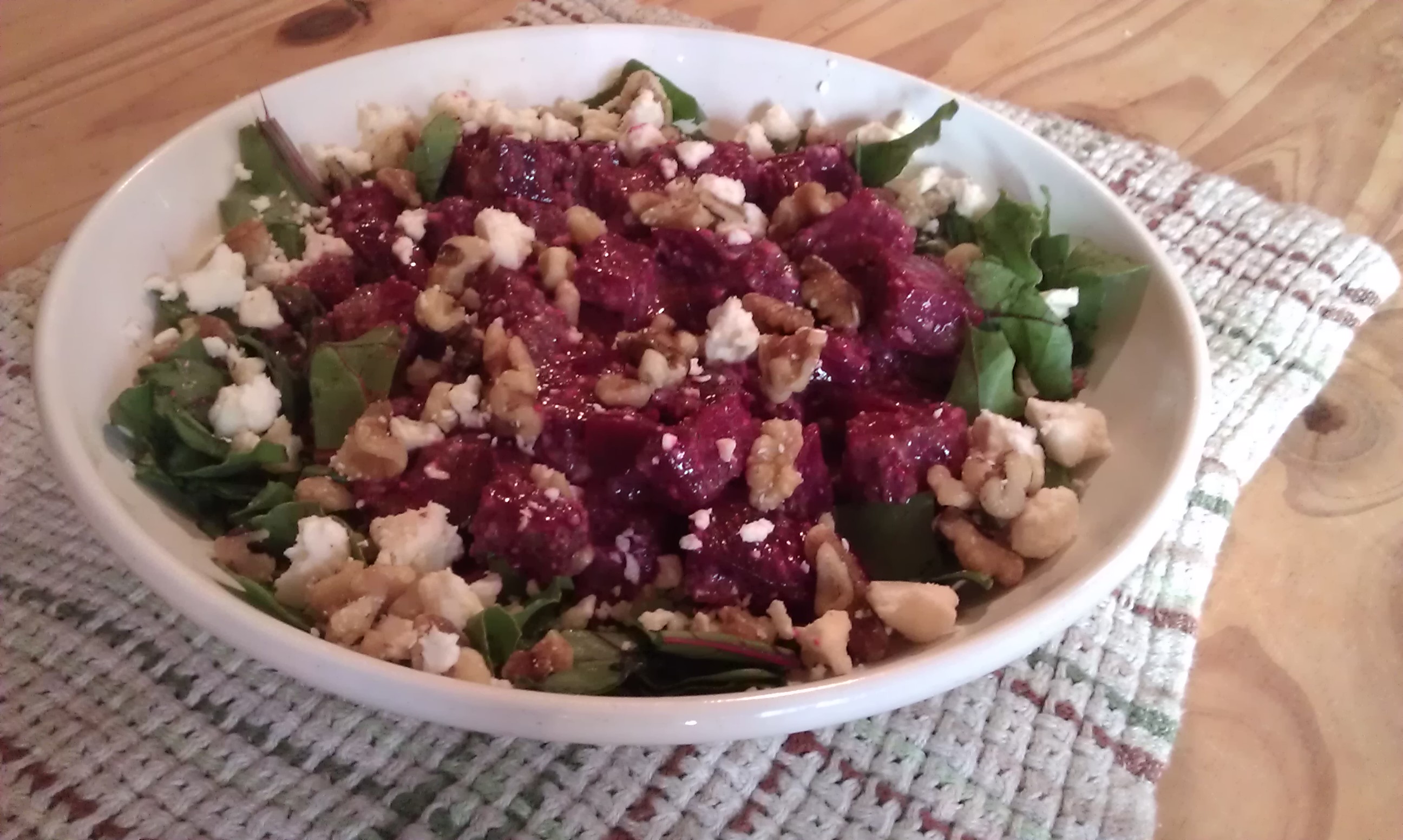 An earthy, sensuous dish — these beets could  stand on their own as a main dish salad, or in smaller portions as a first course.  You might also want to try the Sage Pesto with pasta or as part of a summer salad. (serves 4)