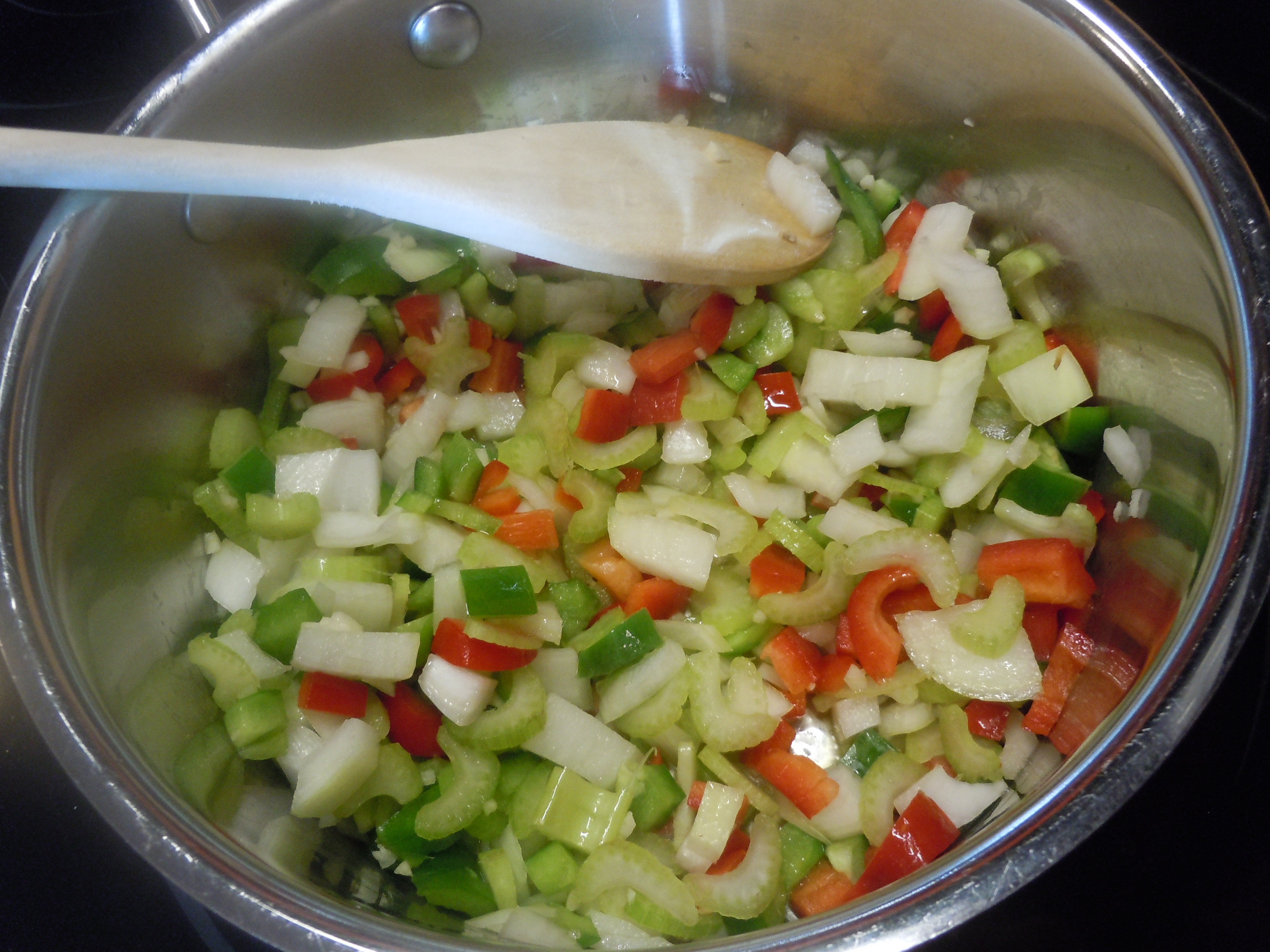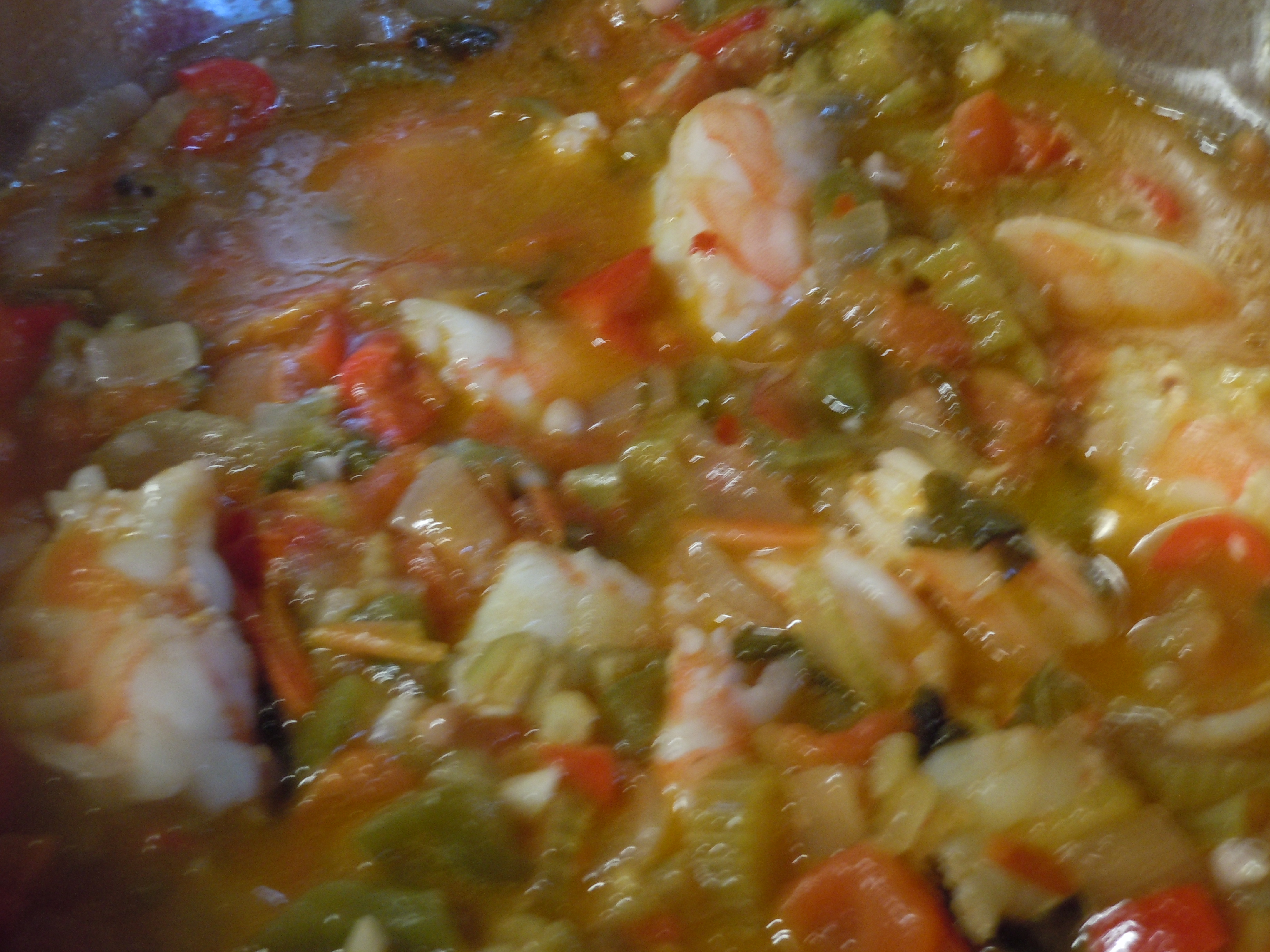 This vegetarian version is perfect for days of abstinence and meatless Fridays. It’s quick and easy, uses a small amount of shrimp and makes up the difference in substance with garden fresh vegetables. You can even omit the shrimp altogether to make the dish vegan. The addition of fresh basil and dry white wine imparts a slightly sweet finish to this otherwise spicy dish. Interestingly, left-overs (if there are any!) acquire a savory flavor. ~ Glyn