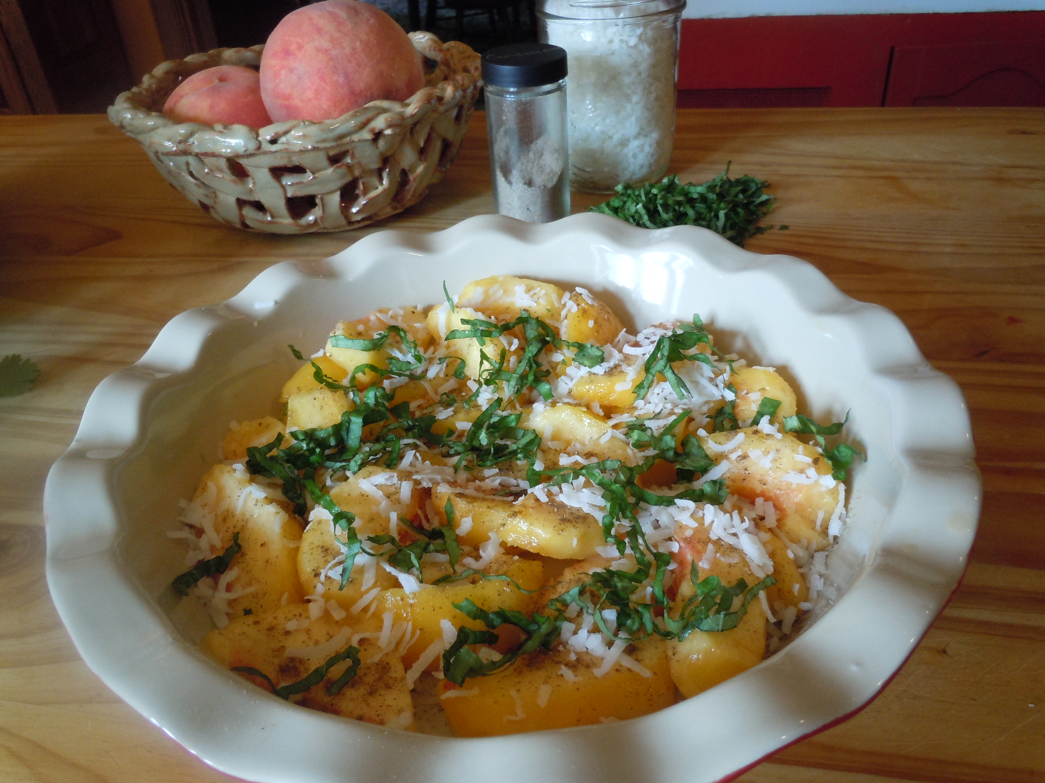 Preheat the oven to 375. Slice and layer 3 of the peaches in a 9 inch pie plate. Sprinkle with cardamom. Top with half the coconut and half the shredded basil. Repeat with the remaining peaches, cardamom, coconut and basil. The pie plate should be full, with the top slightly rounded.