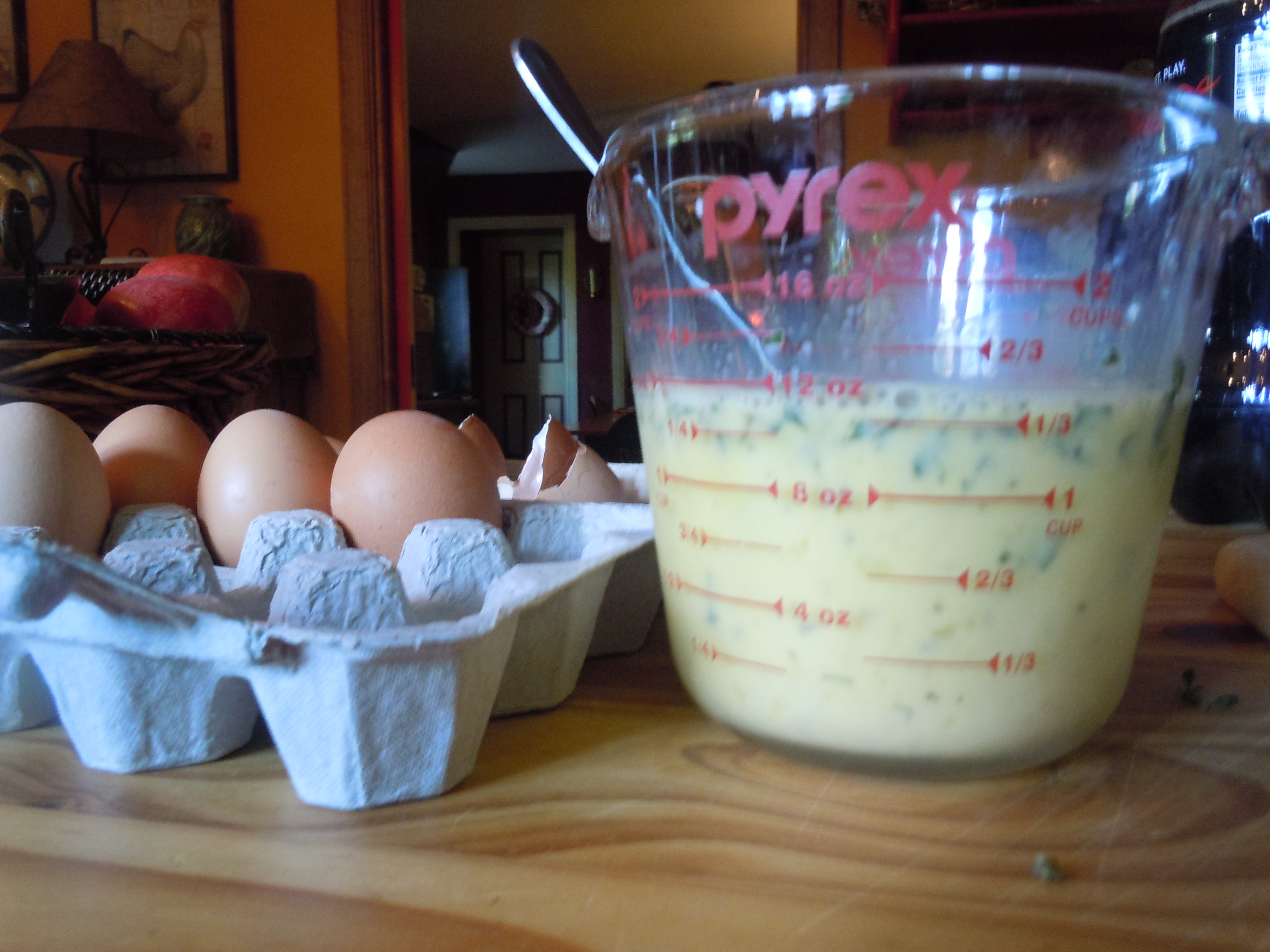 Preheat the oven to 425. In a medium bowl, beat the eggs well. Add the milk, salt, pepper and herbs.