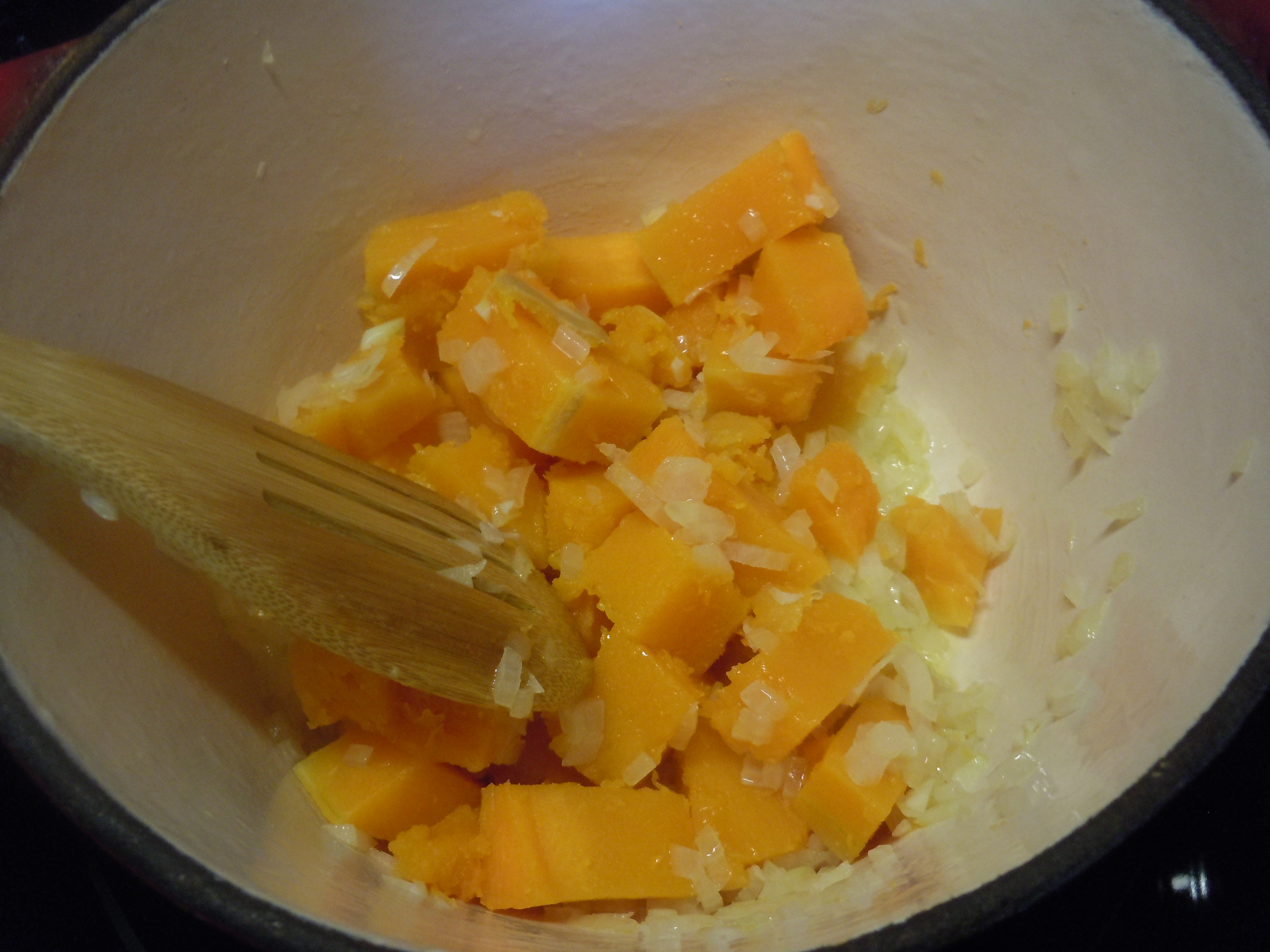 Preheat the oven to 350. With a small sharp knife, pierce the squash on all sides. Place on a foil covered baking sheet and roast the whole squash for one hour or until it yields to gentle pressure. Cool enough to handle, then halve lengthwise. Scoop out the seeds and fibrous pulp at the base of the squash. Remove the peel and cube the squash. (it may be soft enough to simply spoon into a bowl.