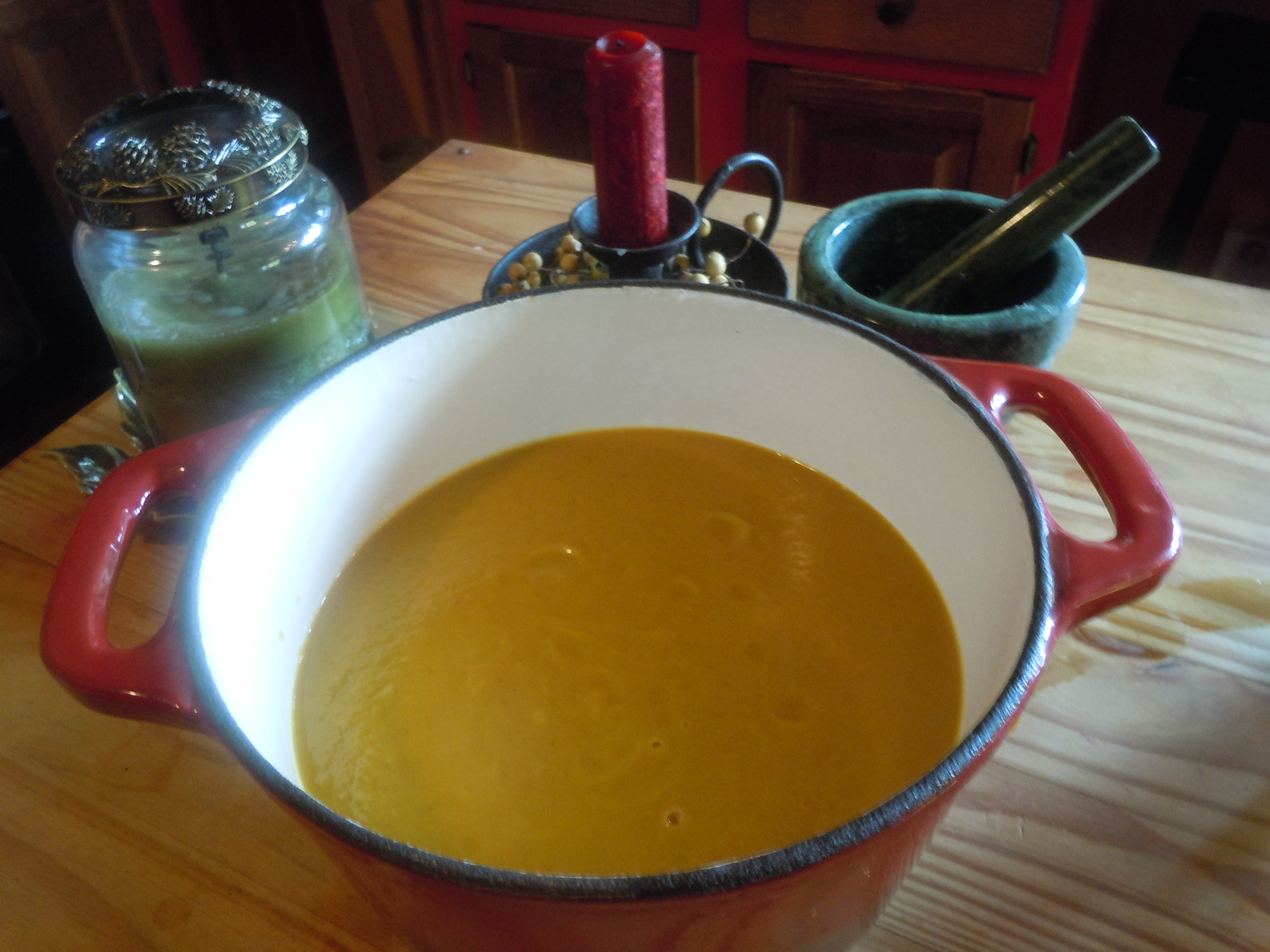 Saute the garlic and onion in the olive oil. Add the squash. Stir in 4 cups of vegetable broth and the spices. Bring to a boil, reduce the heat and cook at a slow boil for 45 minutes. Stir occasionally to keep it from sticking. The squash should be completely cooked and dissolved and the liquid reduced a bit. Cool a bit and puree in batches. Return to the pan. Taste and adjust the seasoning, adding salt as desired. If necessary thin with additional broth or apple juice. Let sit on warm for the afternoon, reheating before serving. Or, refrigerate overnight and reheat when ready to serve.