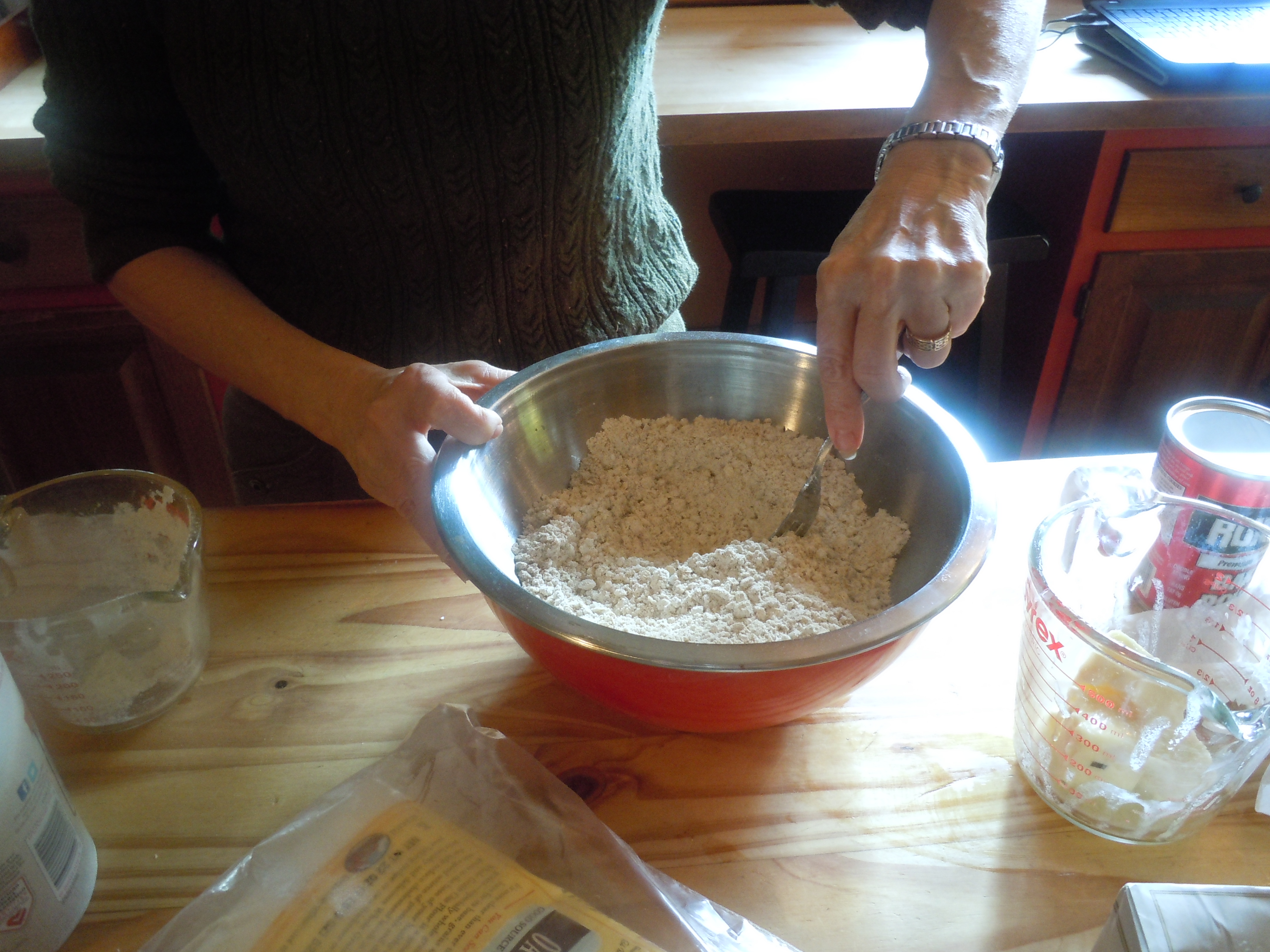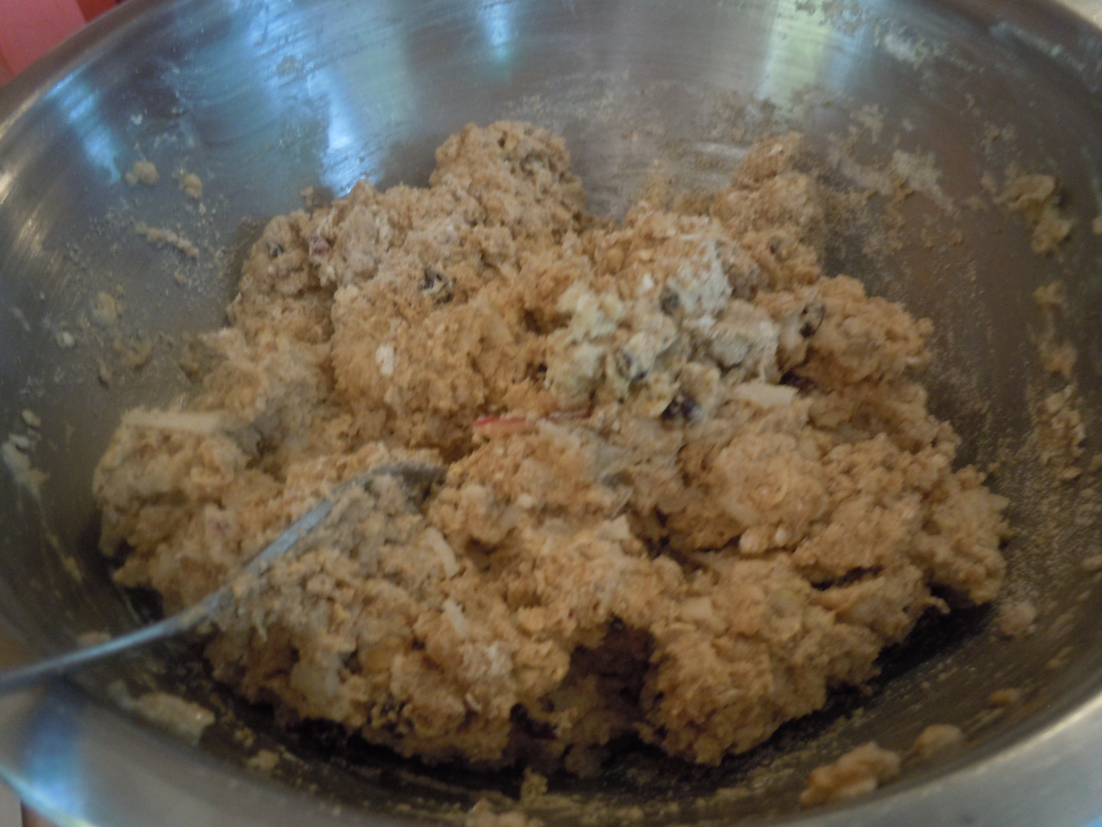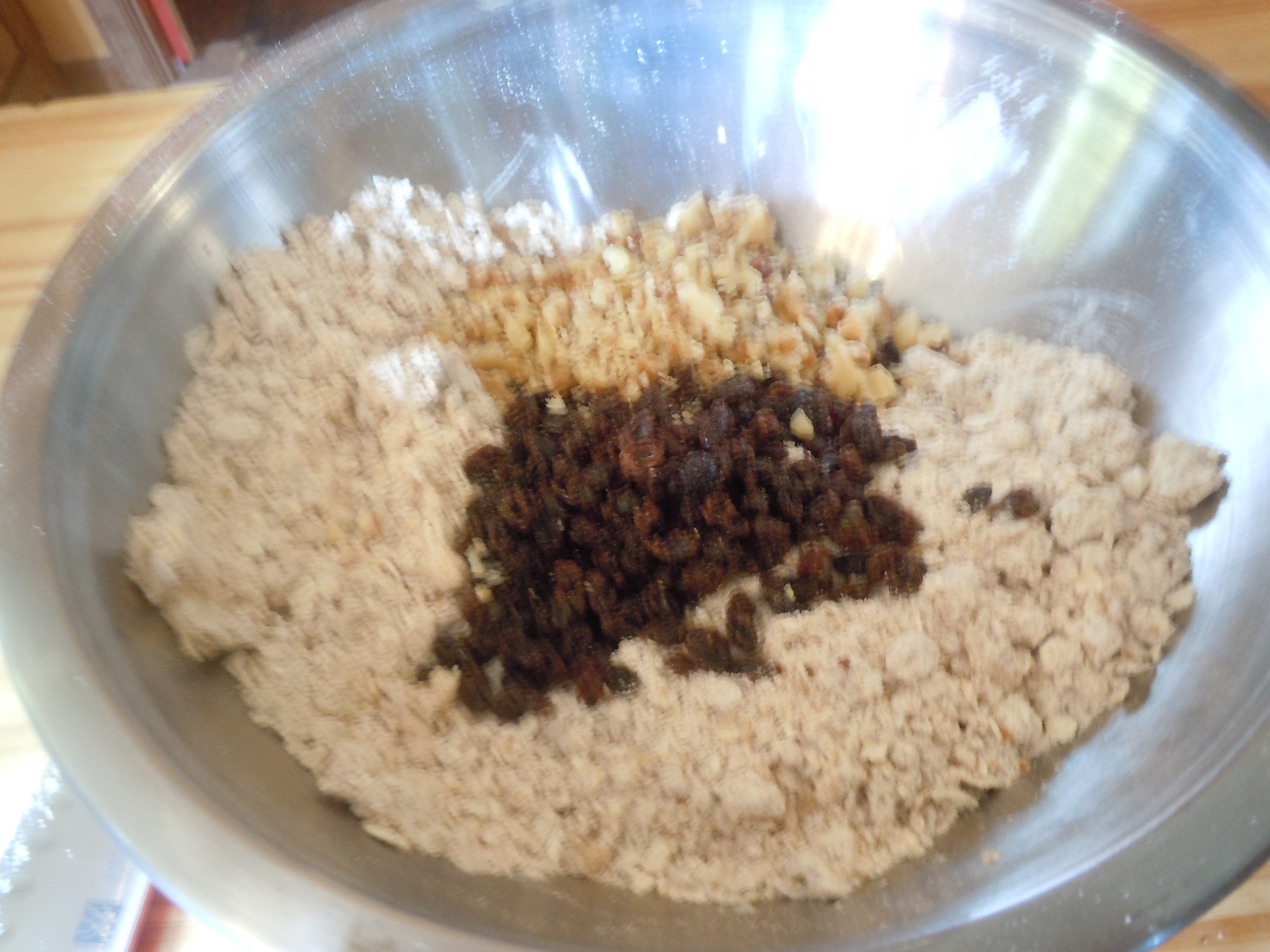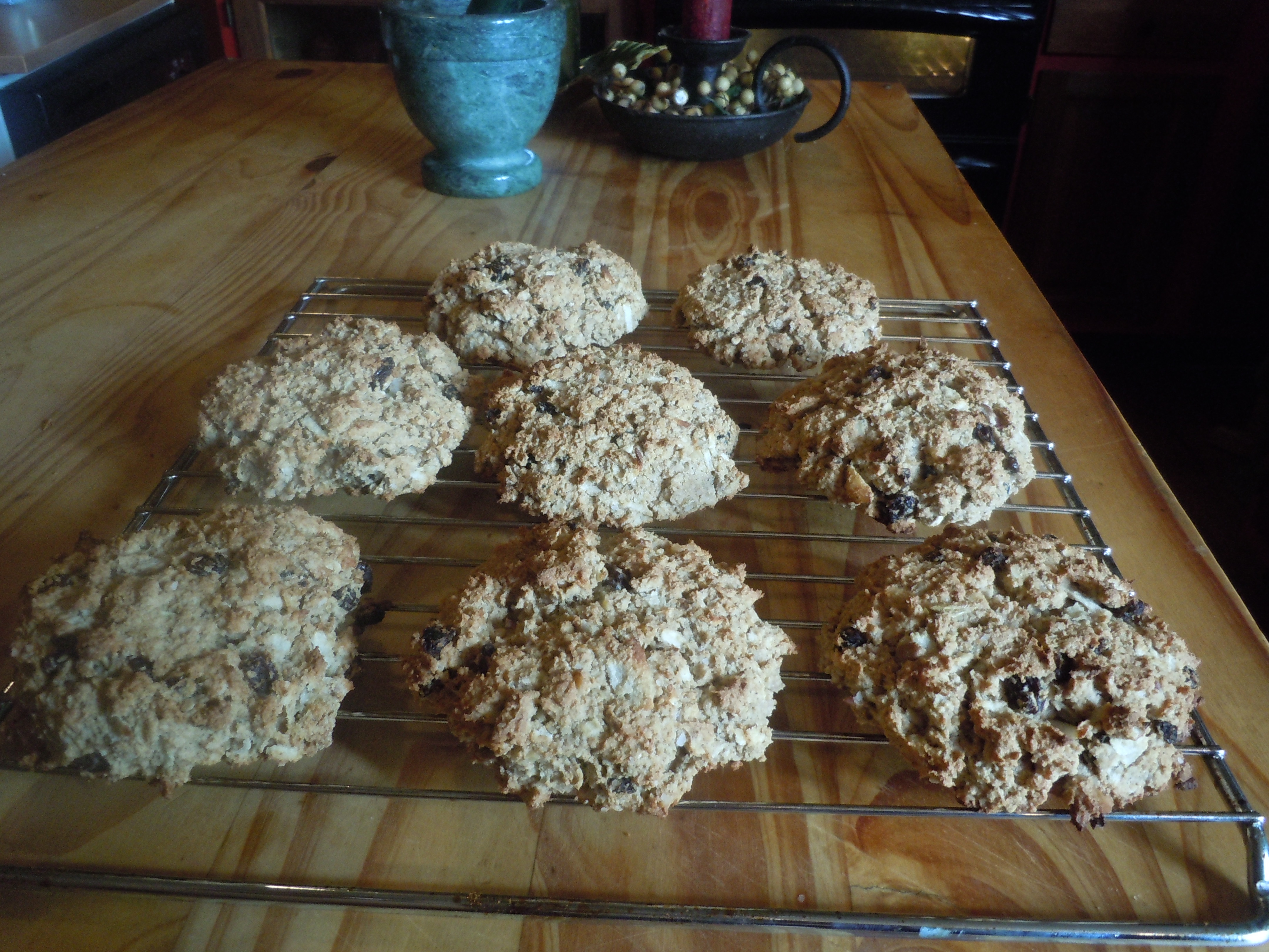 Preheat the oven to 425. Stir together the oat flour, the oats, salt baking soda and spices. Cut in the butter with two knives or a pastry blender. Stir in the nuts and currants. Add the egg, cream and grated apple to make a soft dough. If necessary, add additional cream or milk. With floured hands, form the dough into 8 cakes. Place on a nonstick cookie sheet and bake or 18-20 minutes, or until golden. Cool on a rack.