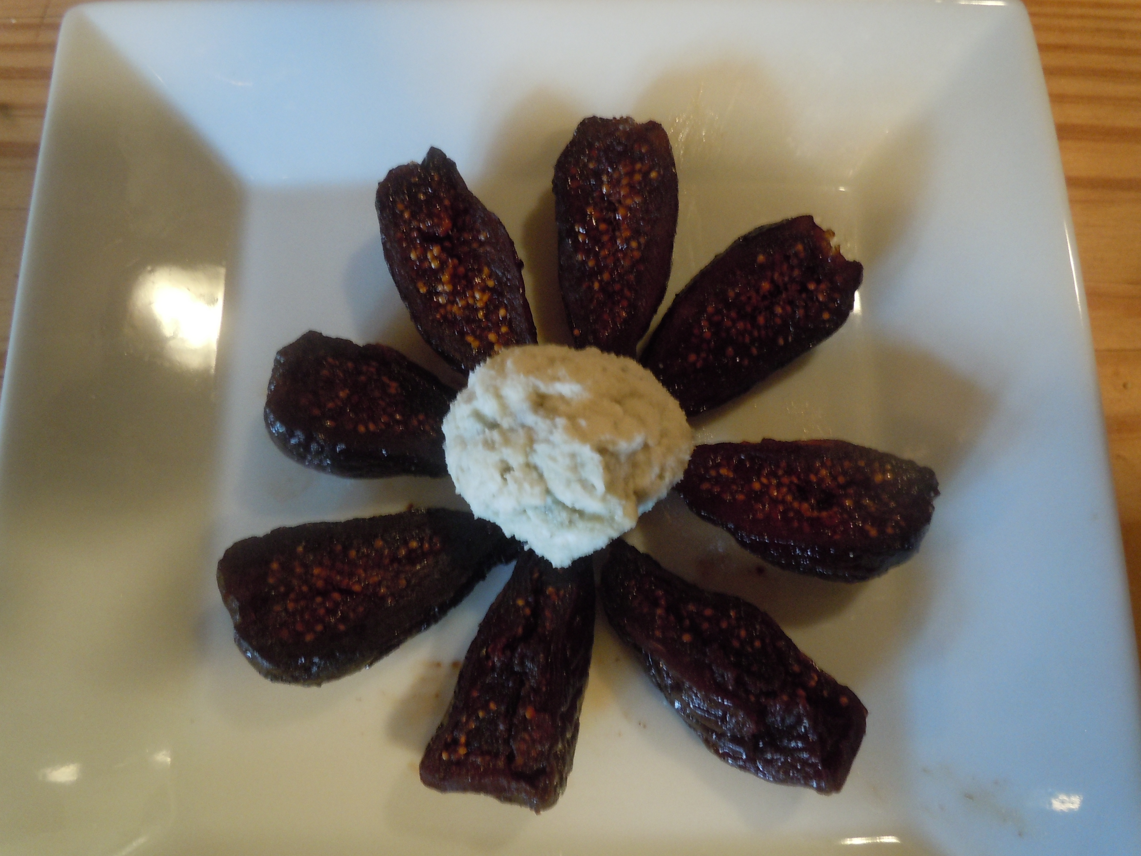 To assemble: For each serving, slice 4 figs in half lengthwise. Arrange in a petal shape on the small dessert dish. Place cheese balls in the center of the petals. Gently dribble the chocolate sauce over the figs and the cheese balls. Sprinkle with chopped pistachios.