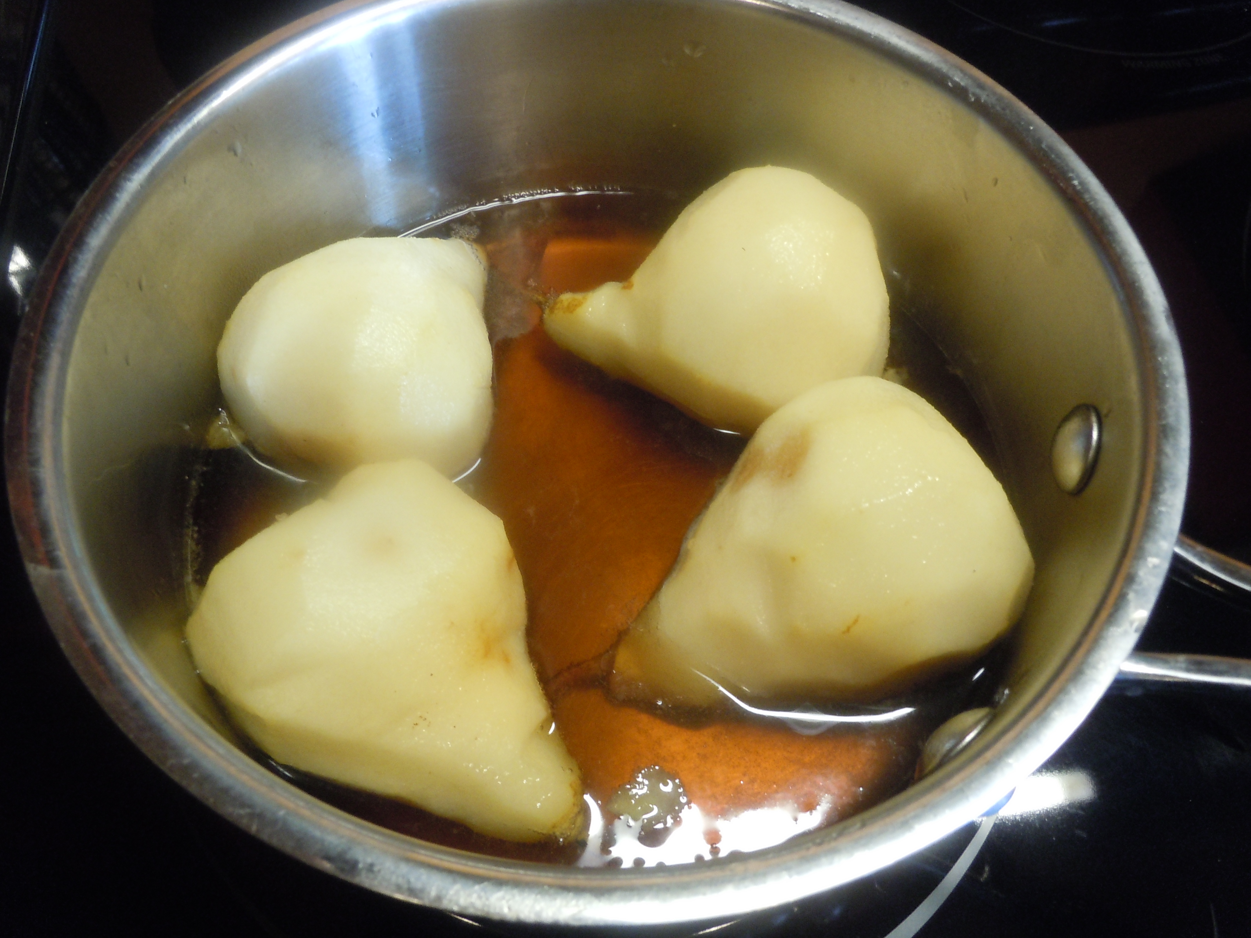 Lay the peeled pears on their side in a medium saucepan. Add the wine and spices. Bring to a boil. Reduce the heat and poach for 30 minutes turning the fruit occasionally to cook and color evenly.