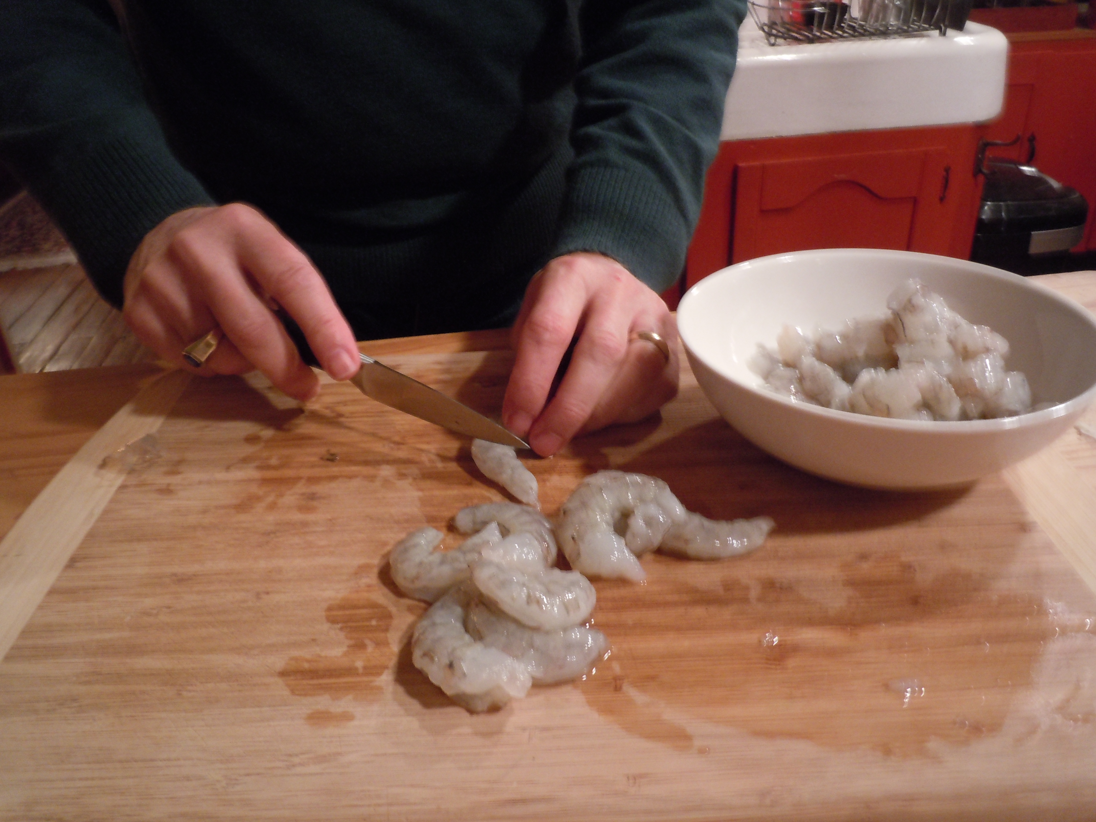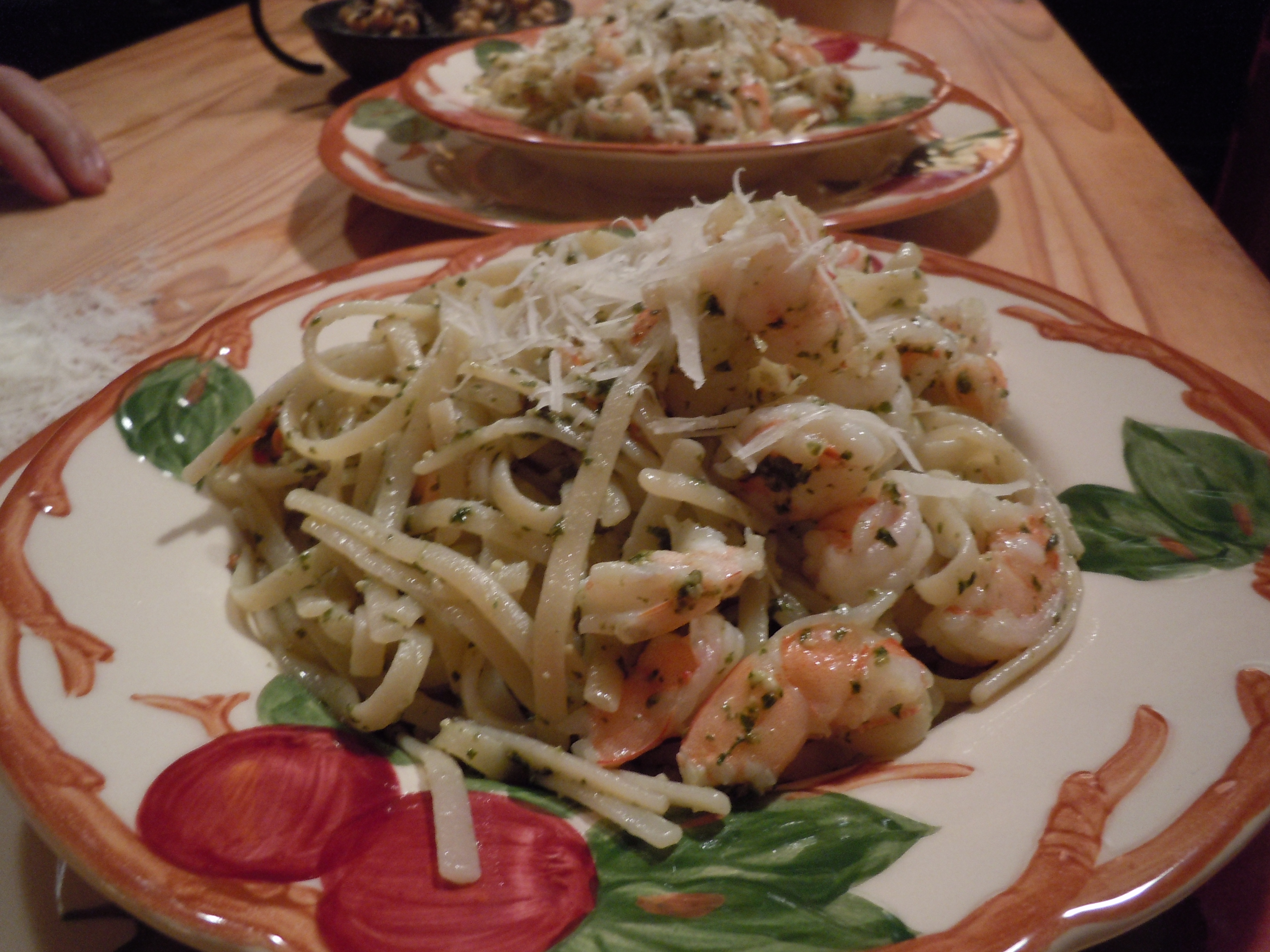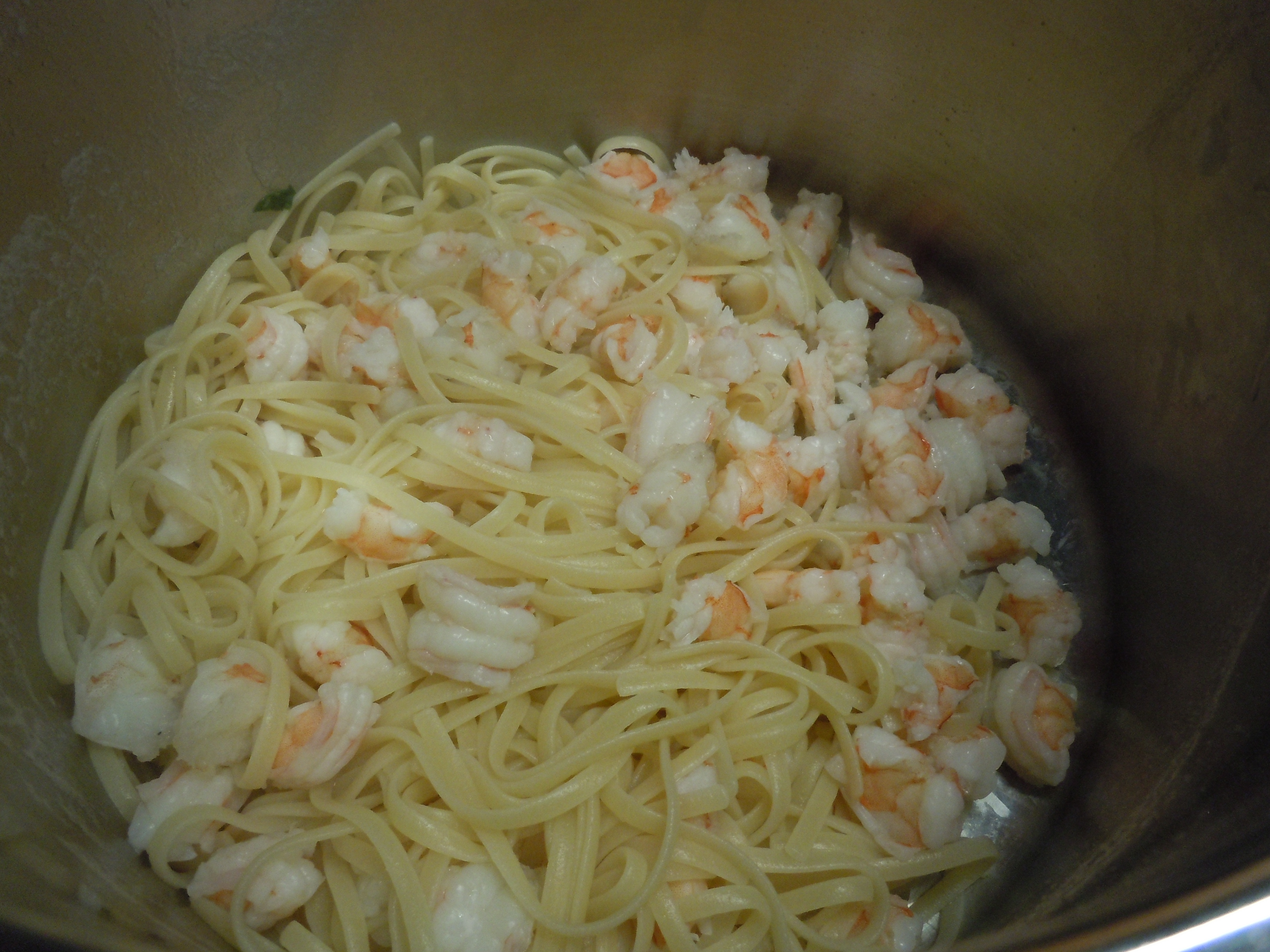 Meanwhile, cook the pasta. When the pasta is nearly done, add the shrimp and cook until the shrimp floats.