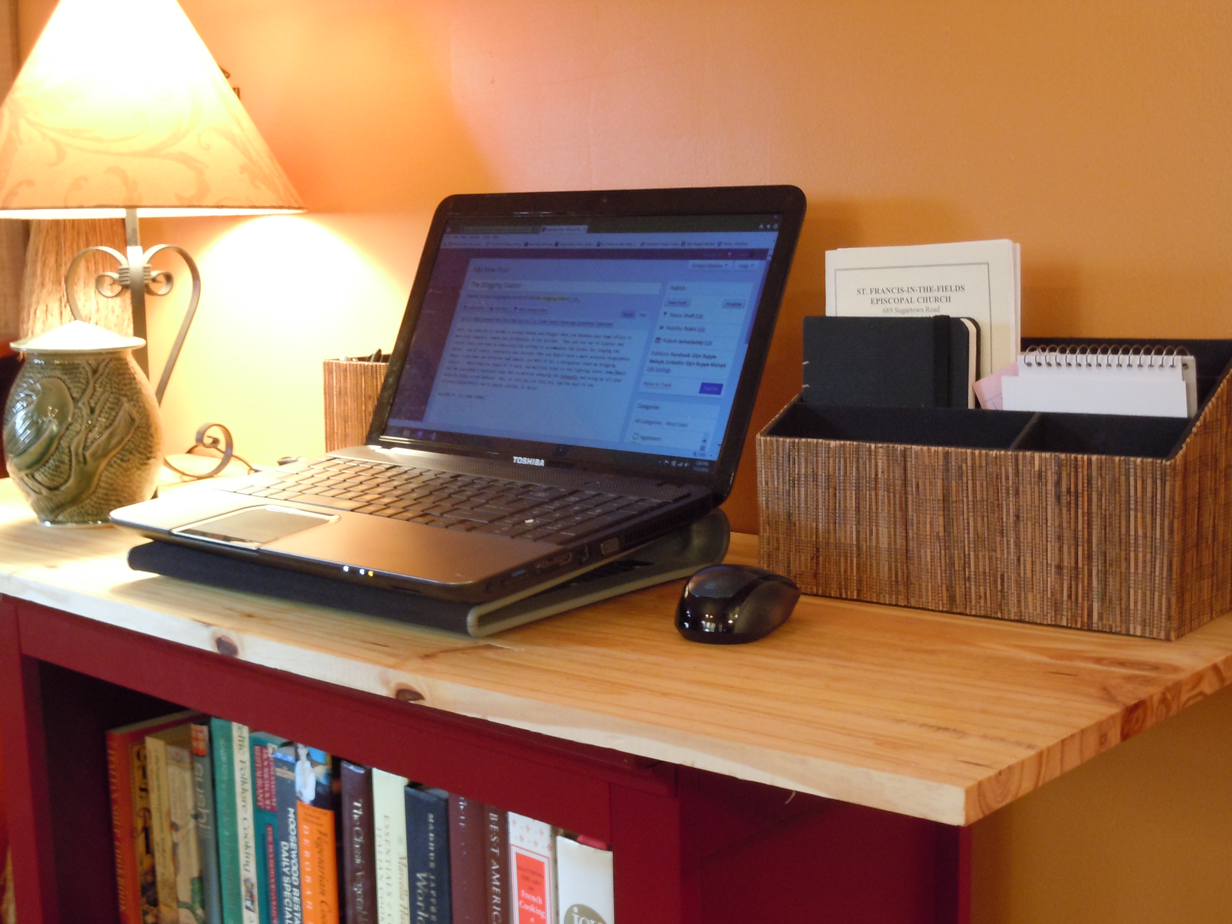 Because, you know you don’t become a serious foodie and food blogger until you’ve abandoned your home office to move your computer, camera and peripherals to the kitchen. With all that stuff in the kitchen you run out of counter and cabinet space and have to redecorate to accommodate the dishes you need for staging the photos.