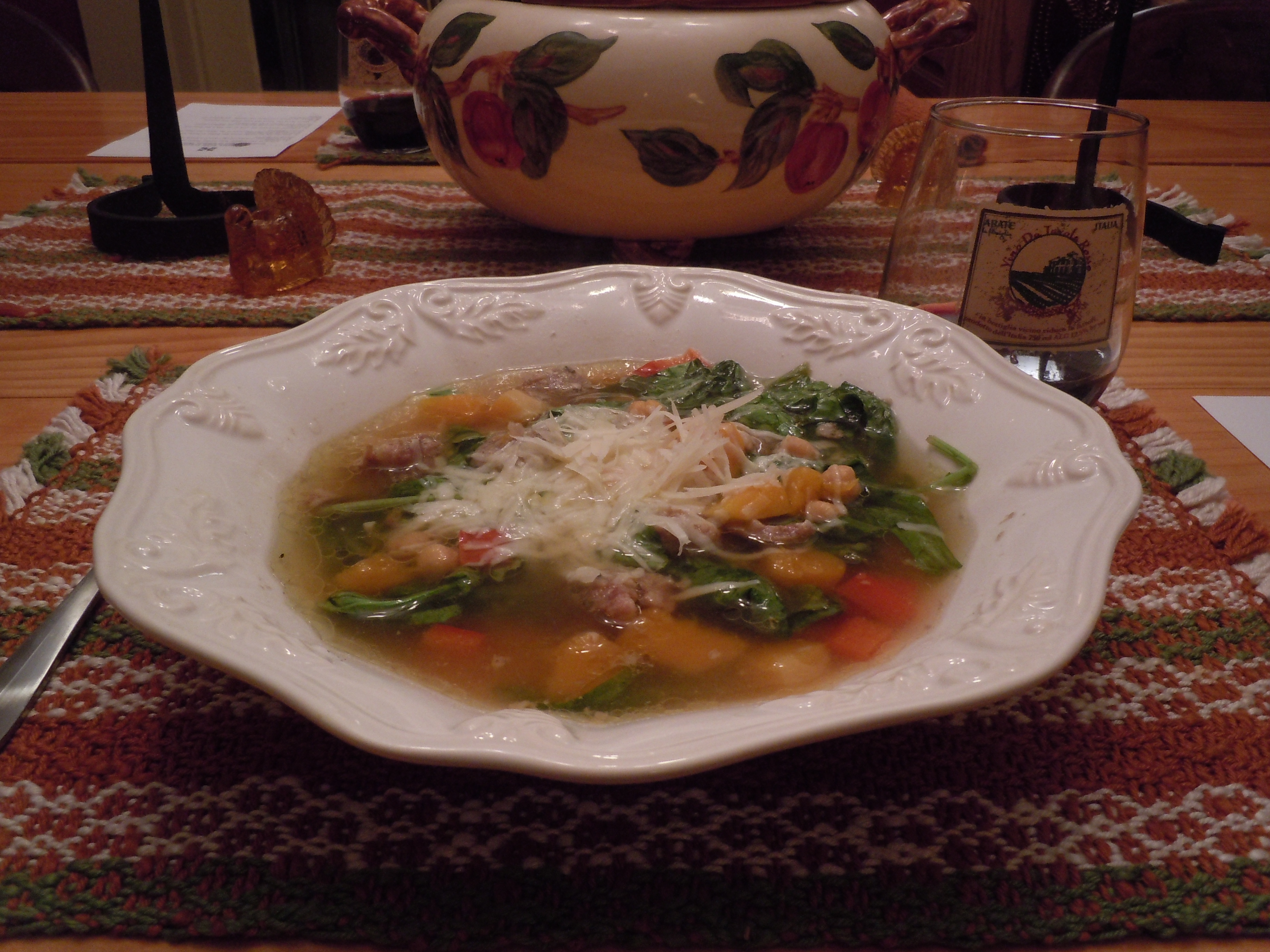 Bring the stock to a boil, add the hot pepper, sausage and the chickpeas. Reduce heat and simmer until the sausage is done, about 15 minutes. Add the squash and the red pepper and cook an additional 15 minutes. Add the greens and cook about five minutes. Hold on warm until ready to eat, or refrigerate overnight. Serve in warmed bowls, topped with the cheese.