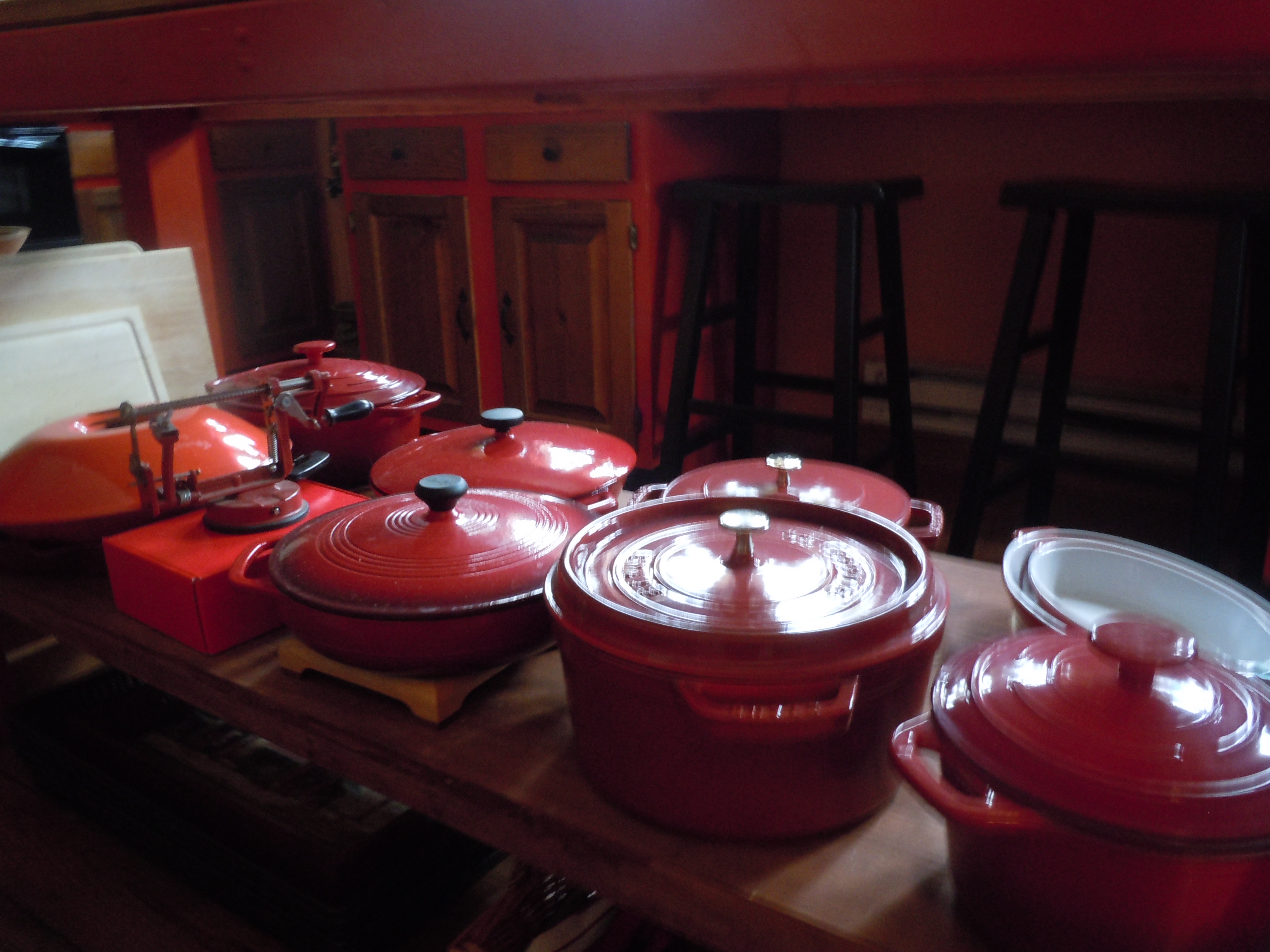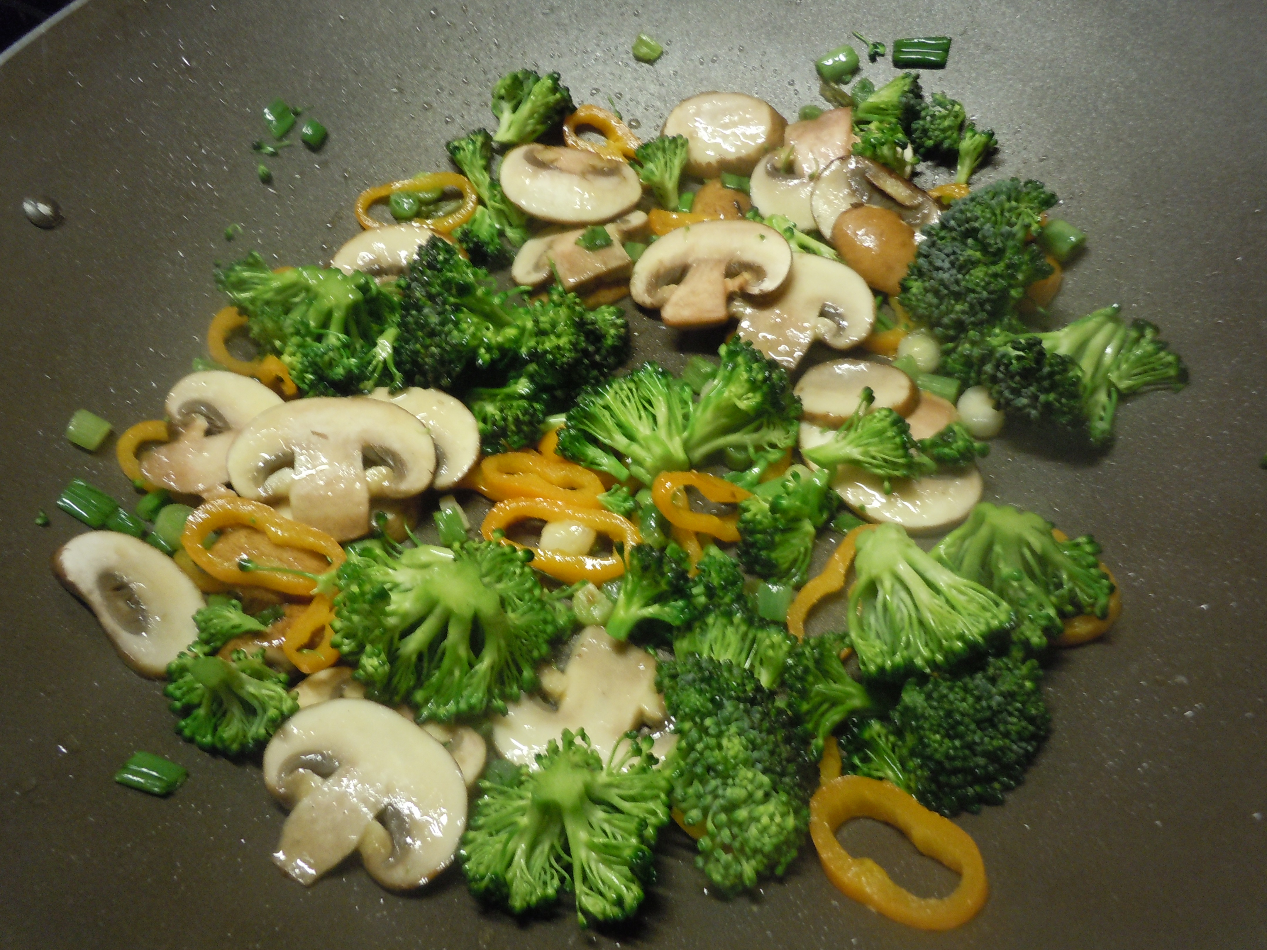 One of the few kitchen utensils Will brought to our marriage some 30 years ago was a red enameled wok. It had seen yeoman service in his bachelor days but very little since then. Now that we are eating whole foods and doing our best to cook them without added oil, the wok has moved onto the “frequent-use” shelf of the kitchen island (far left in the photo, next to the cutting boards.)
