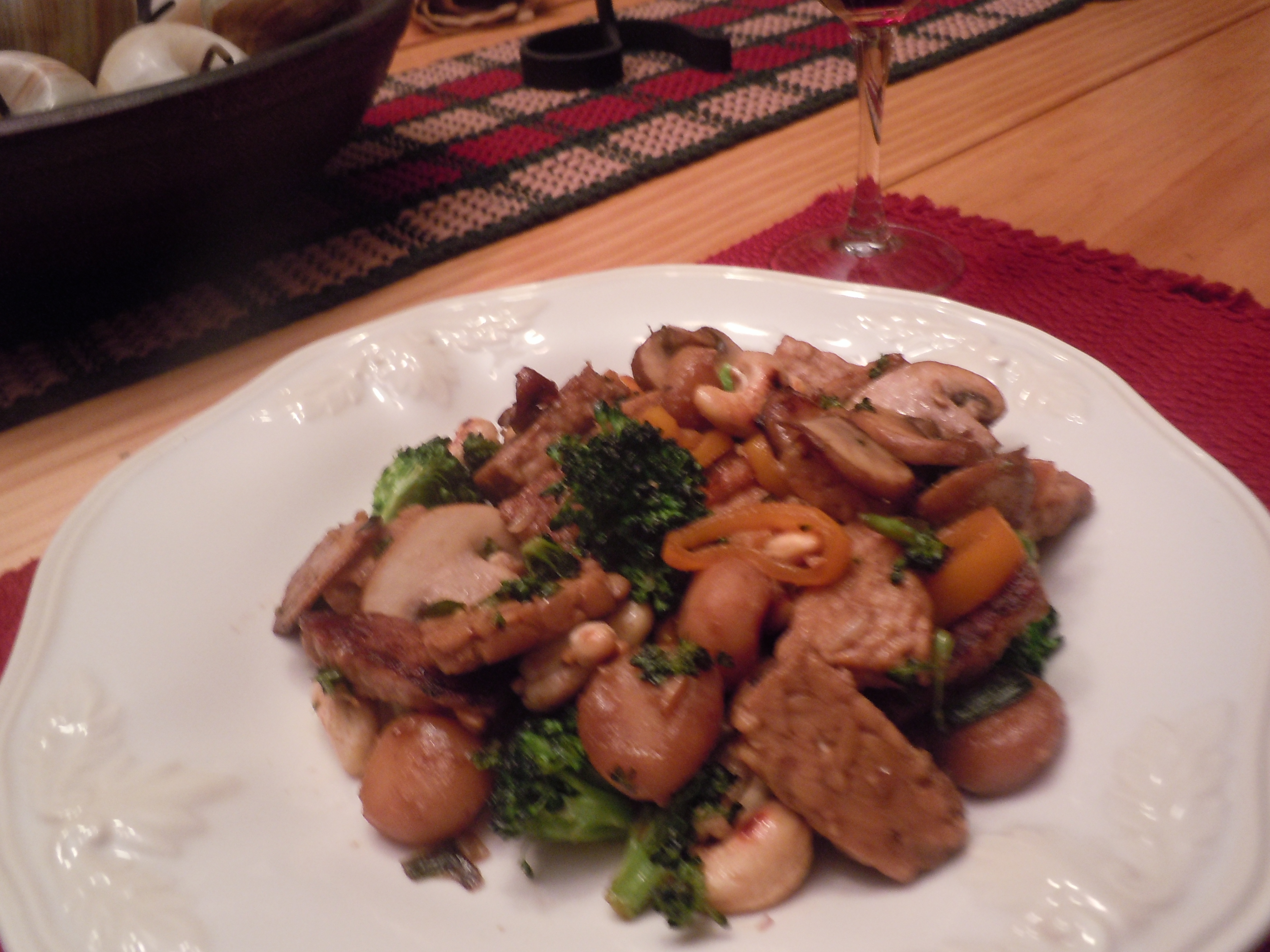 This recipe would work well with rice or with Asian noodles, but we found it perfectly adequate and filling on its own. A bowl of strawberries for dessert made it a lovely dinner. ~ Glyn