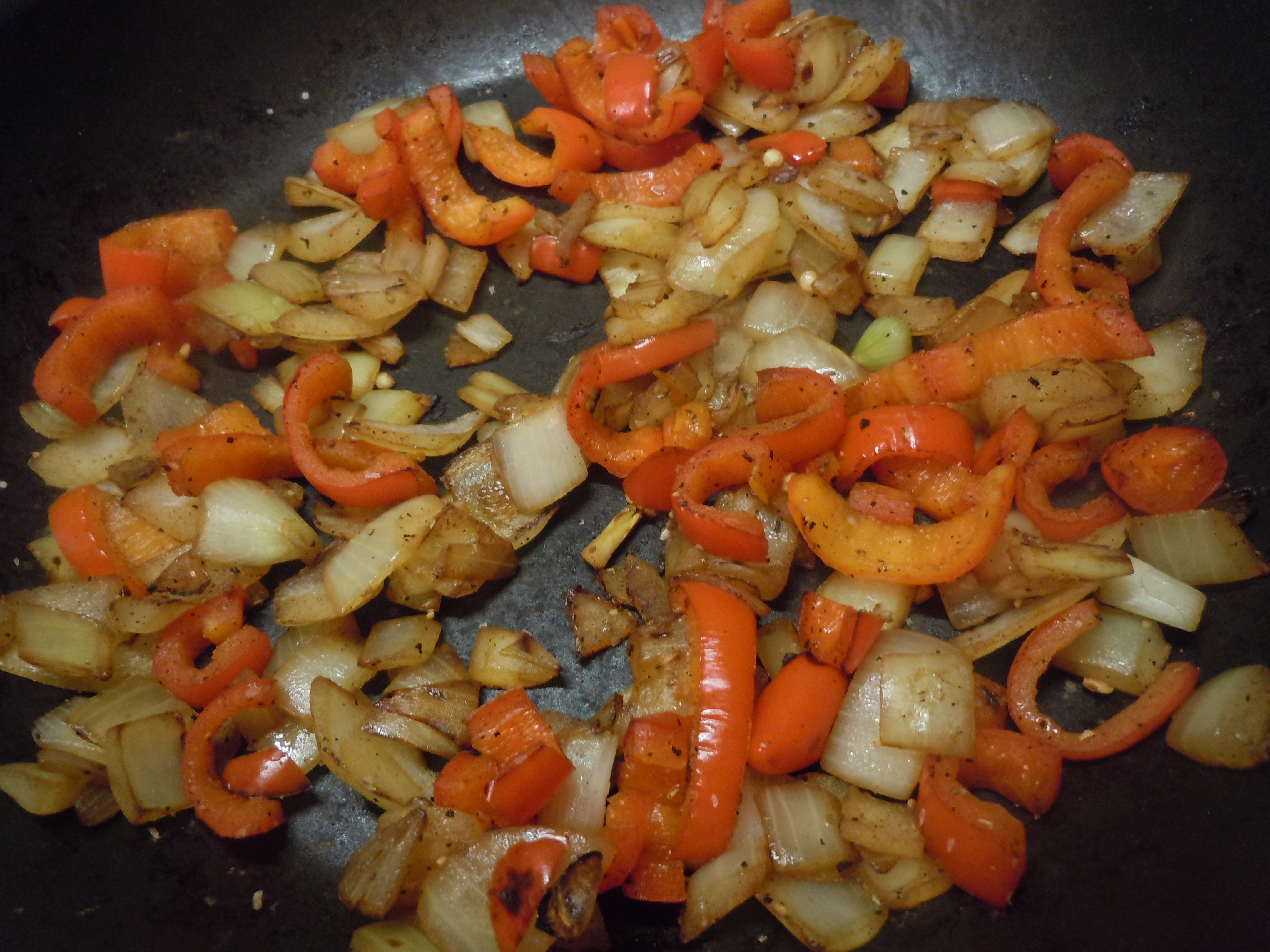 Dry sauté the red pepper. When it begins to char, add the spinach and cook until most of the liquid is evaporated. Add the hummus and the garlic, and stir to combine. Season with the salt, pepper and nutmeg.