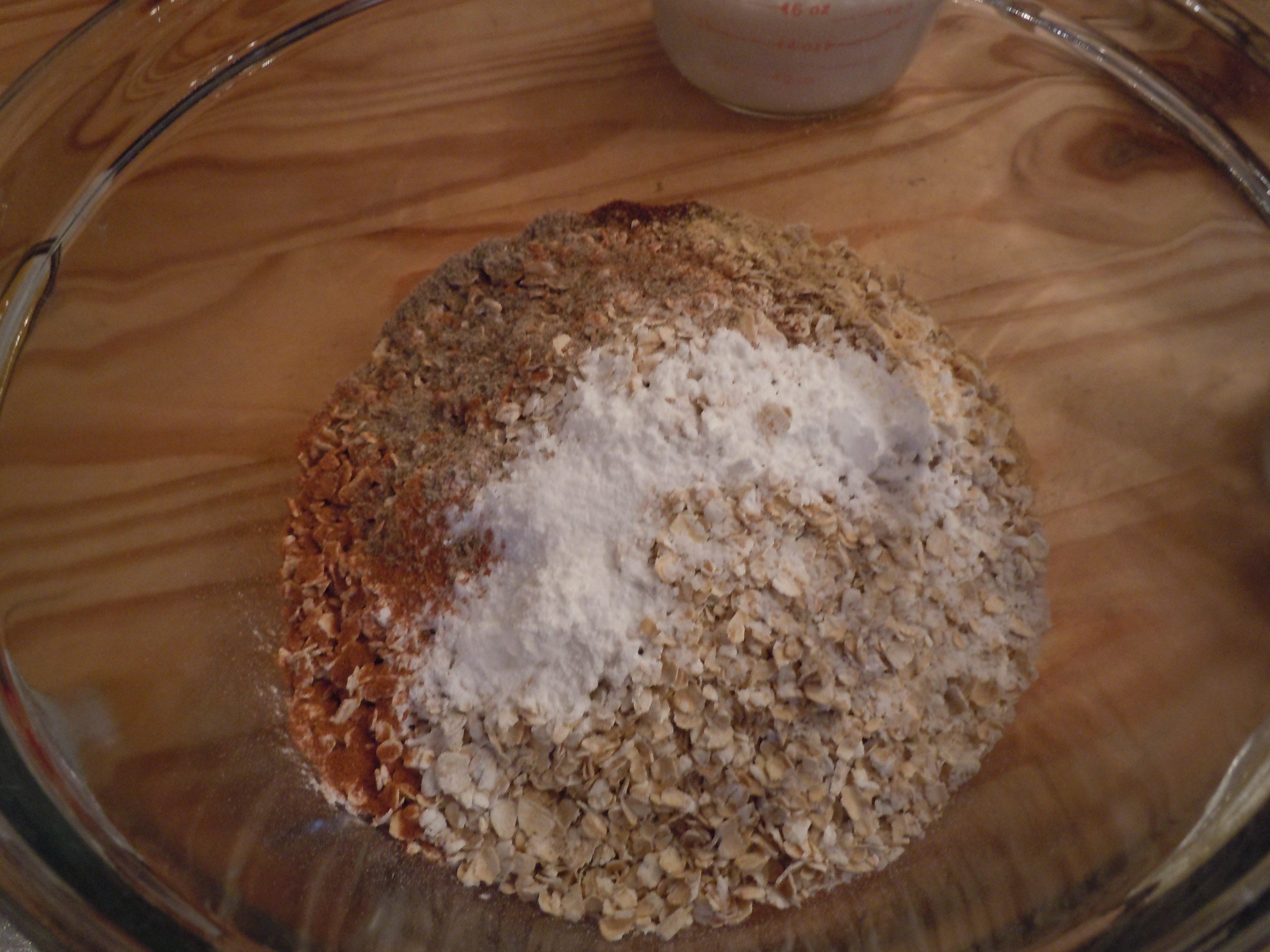 Combine oatmeal and oat flour with the baking powder, salt and spices.