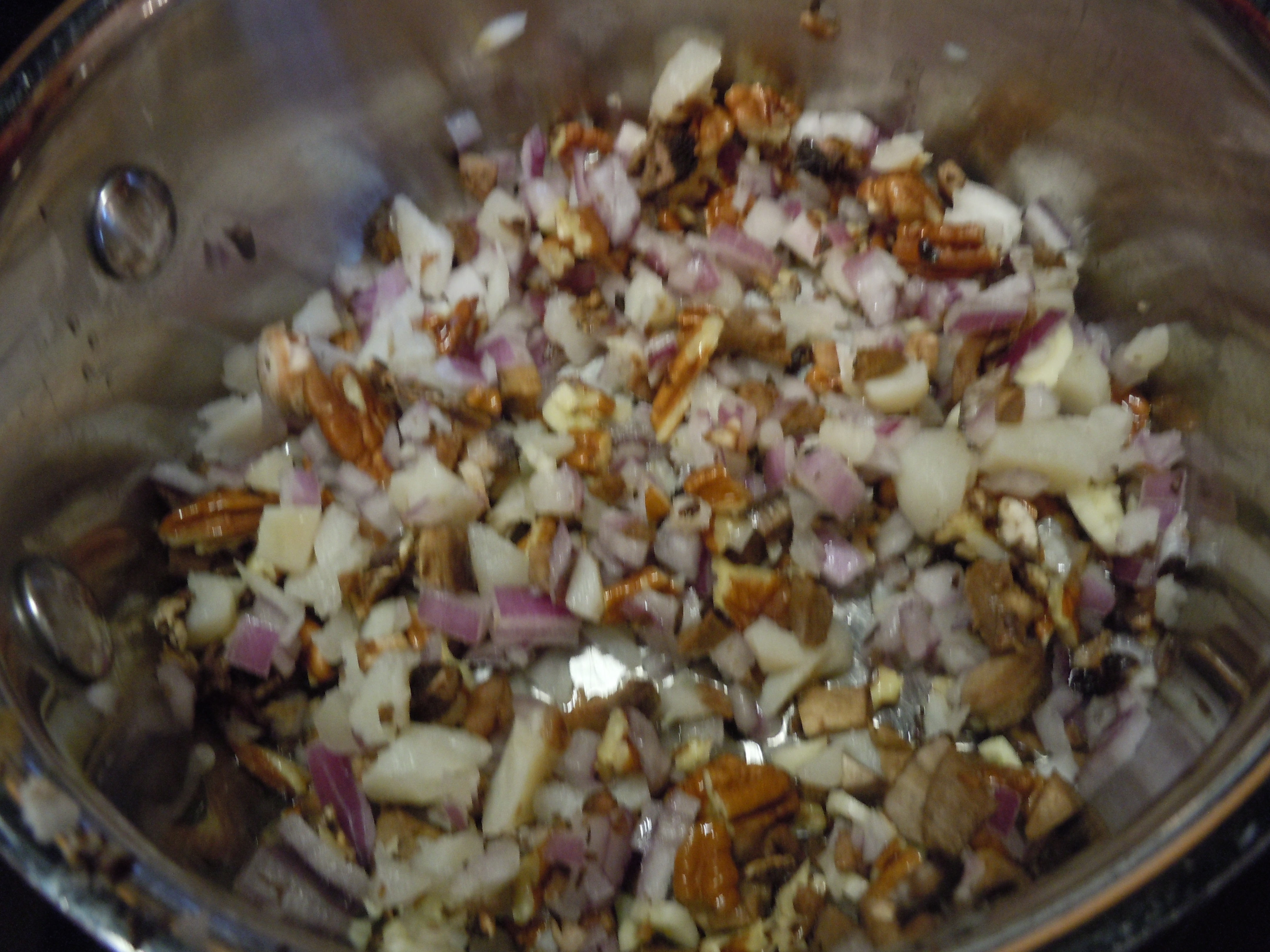 Chop the stems finely. In the olive oil, sauté the onion, mushroom stems, garlic, chopped pecans and water chestnuts.