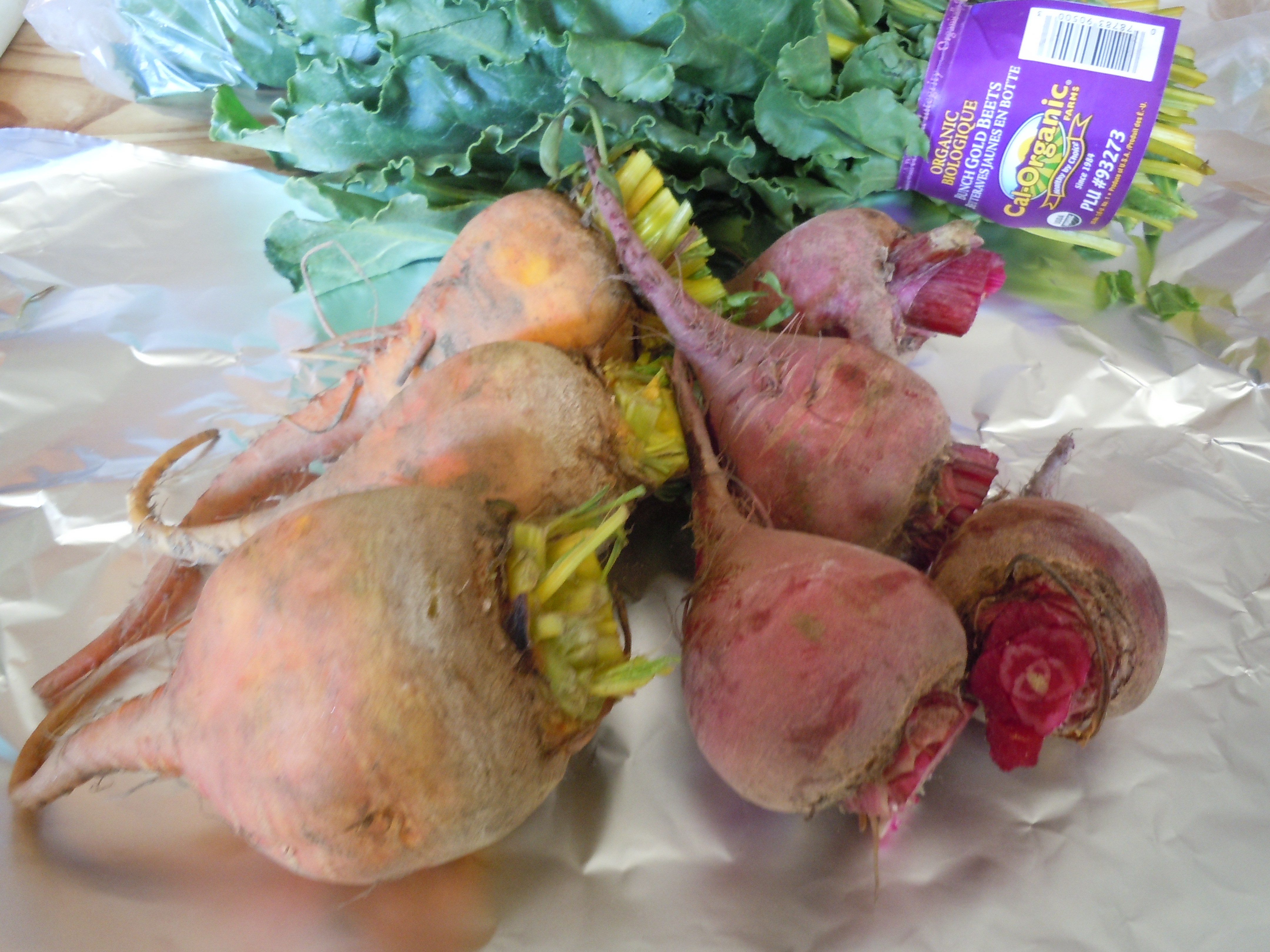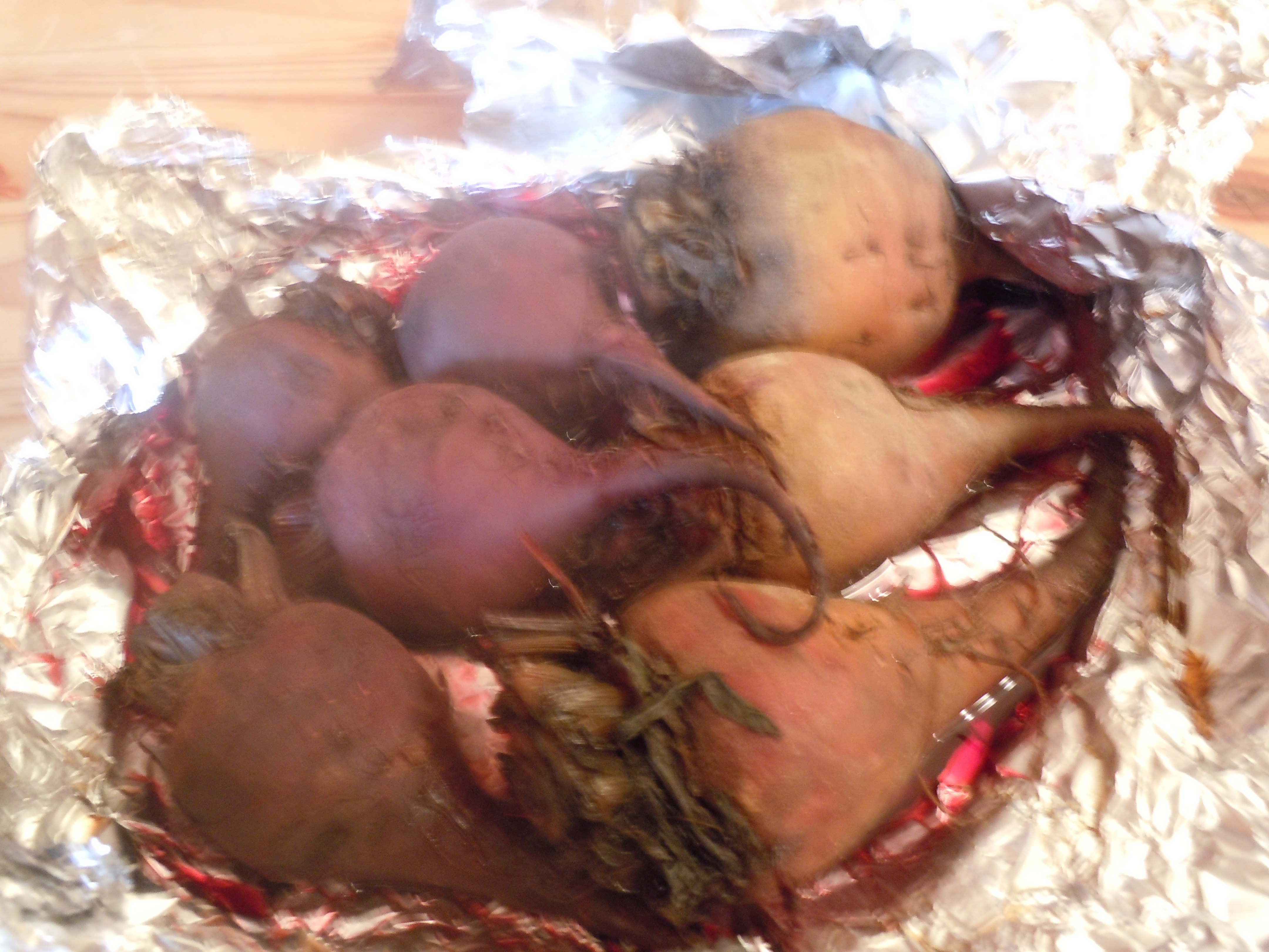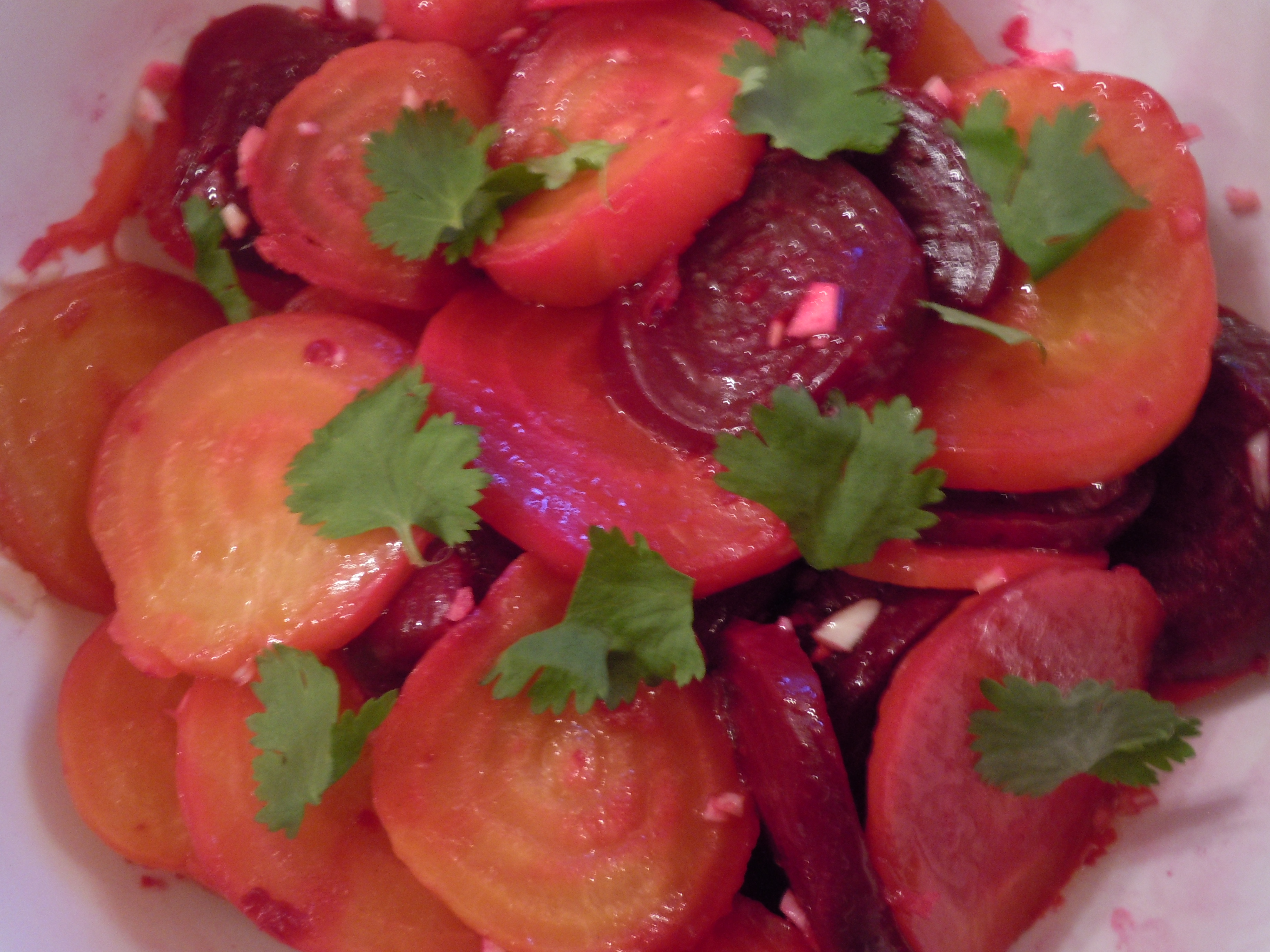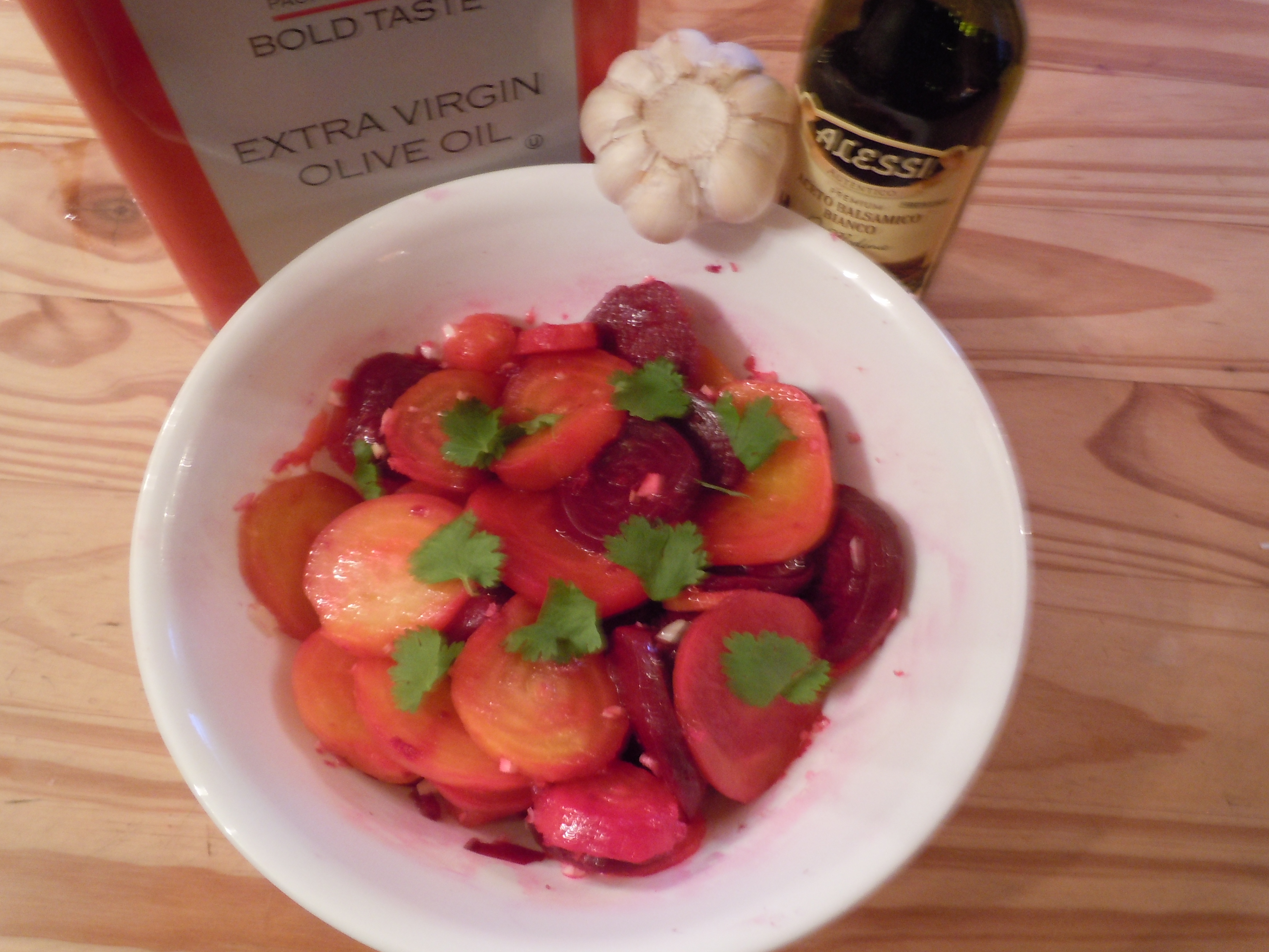 Wrap the beets in foil and roast at 350 for 1.5 hours. Cool slightly, peel and slice. Combine with the oil, vinegar and minced garlic. Let rest while the quinoa cooks. Season to taste with salt and pepper and serve.