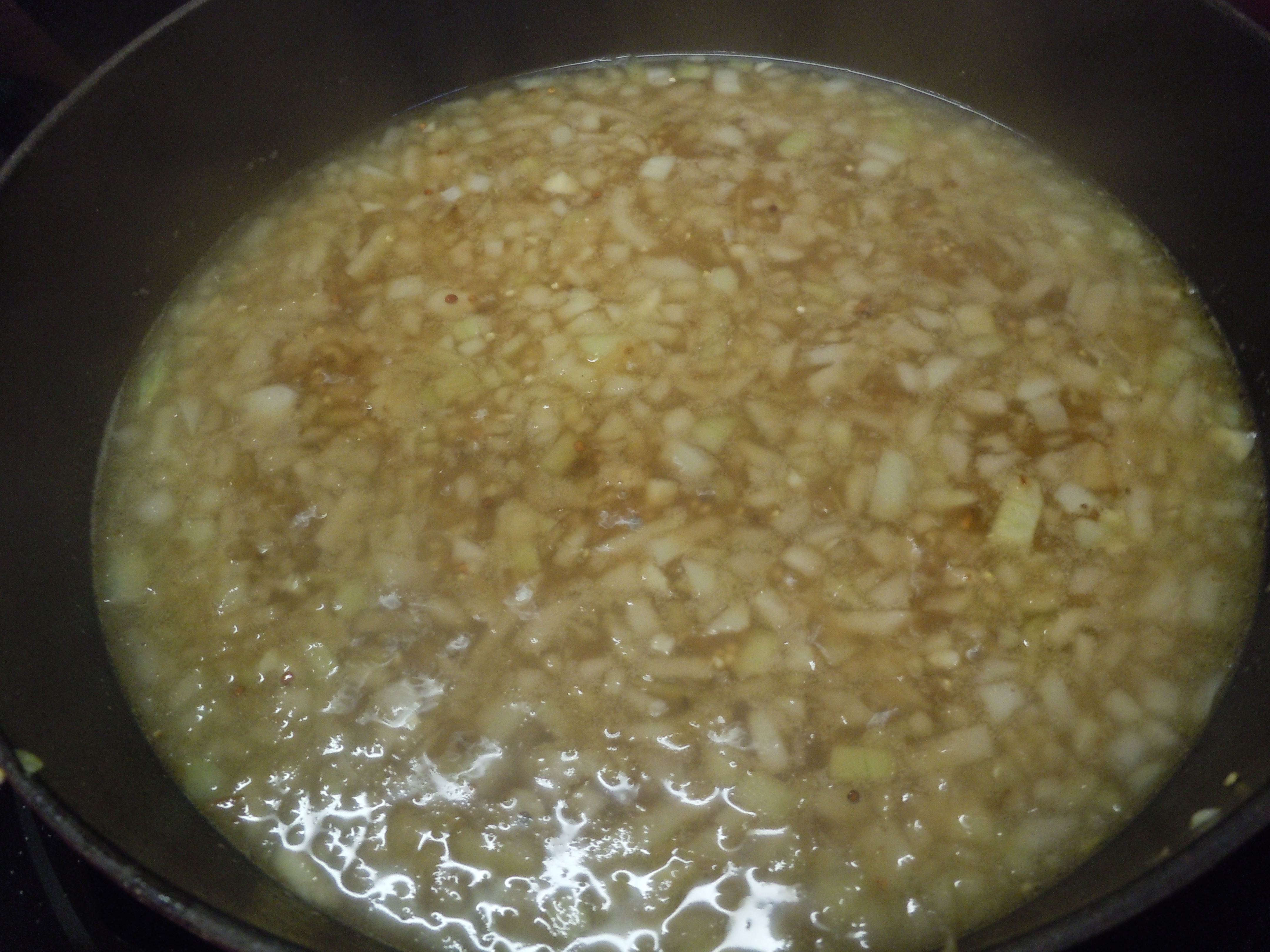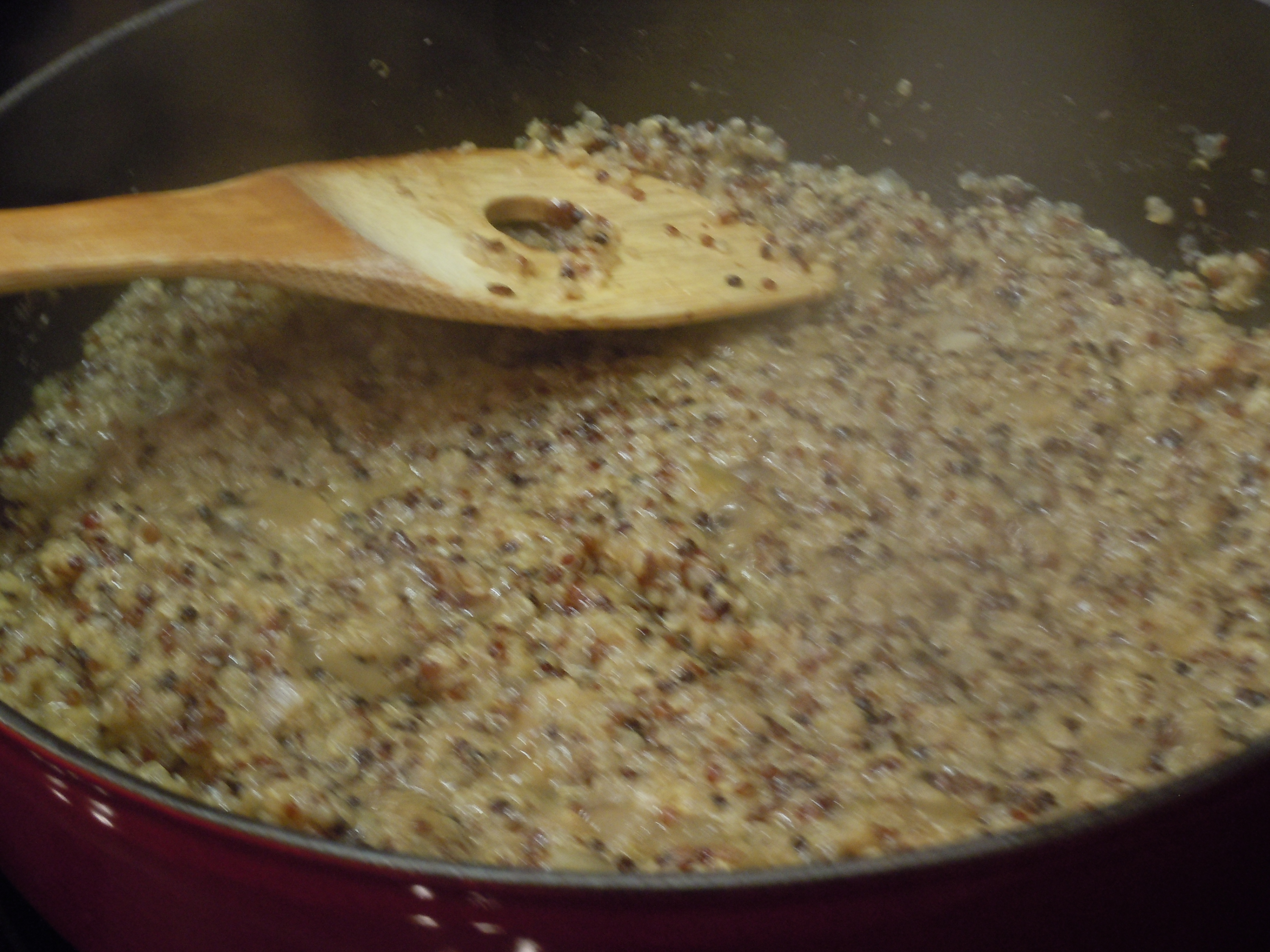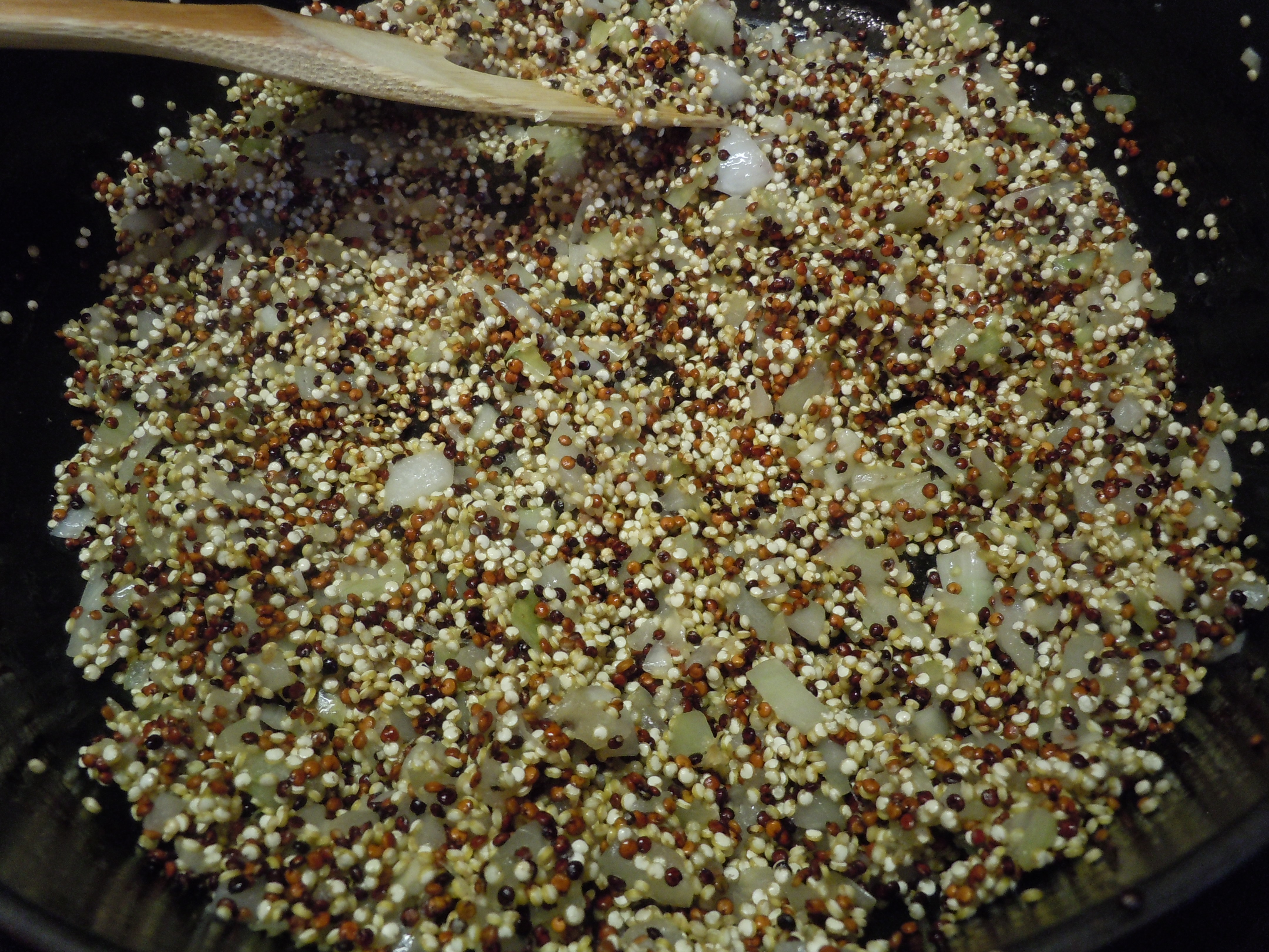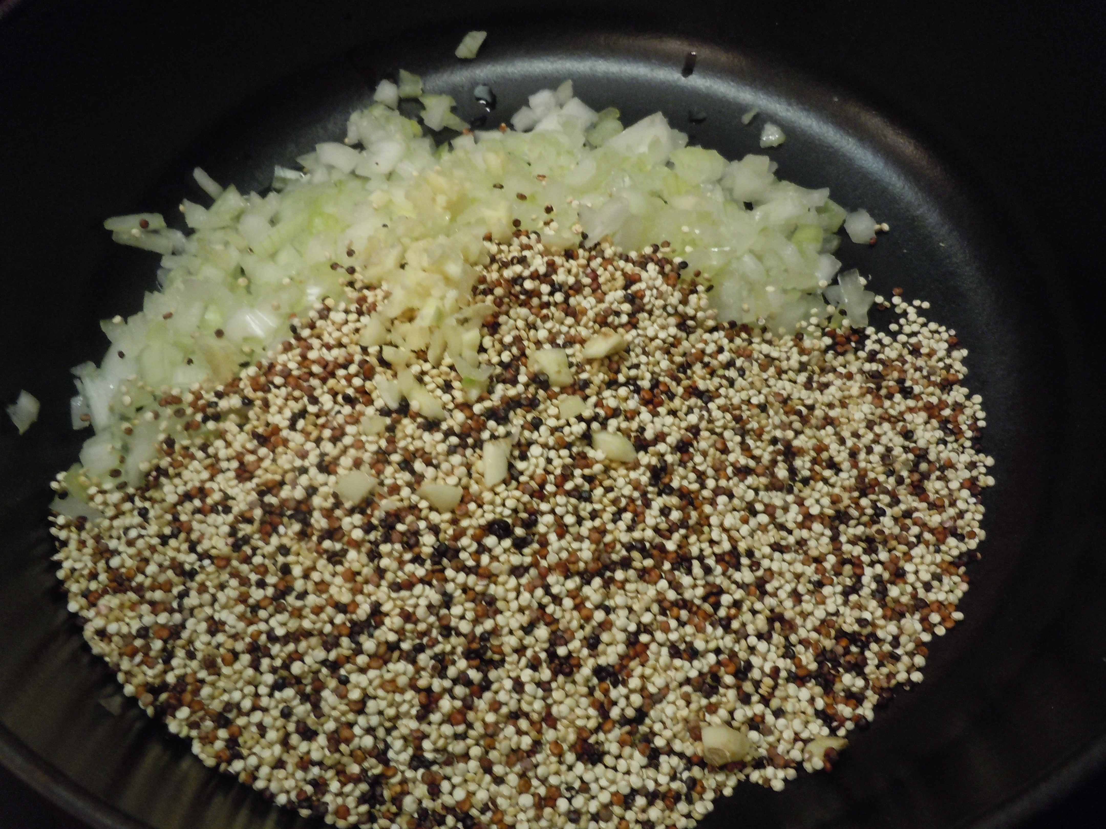Saute the onion garlic and quinoa in the olive oil until the onions are translucent and the quinoa lightly browned. Stir in the vegetable stock. Add the flax egg and the soy sauce. Cover tightly and cook about 15-20 minutes.