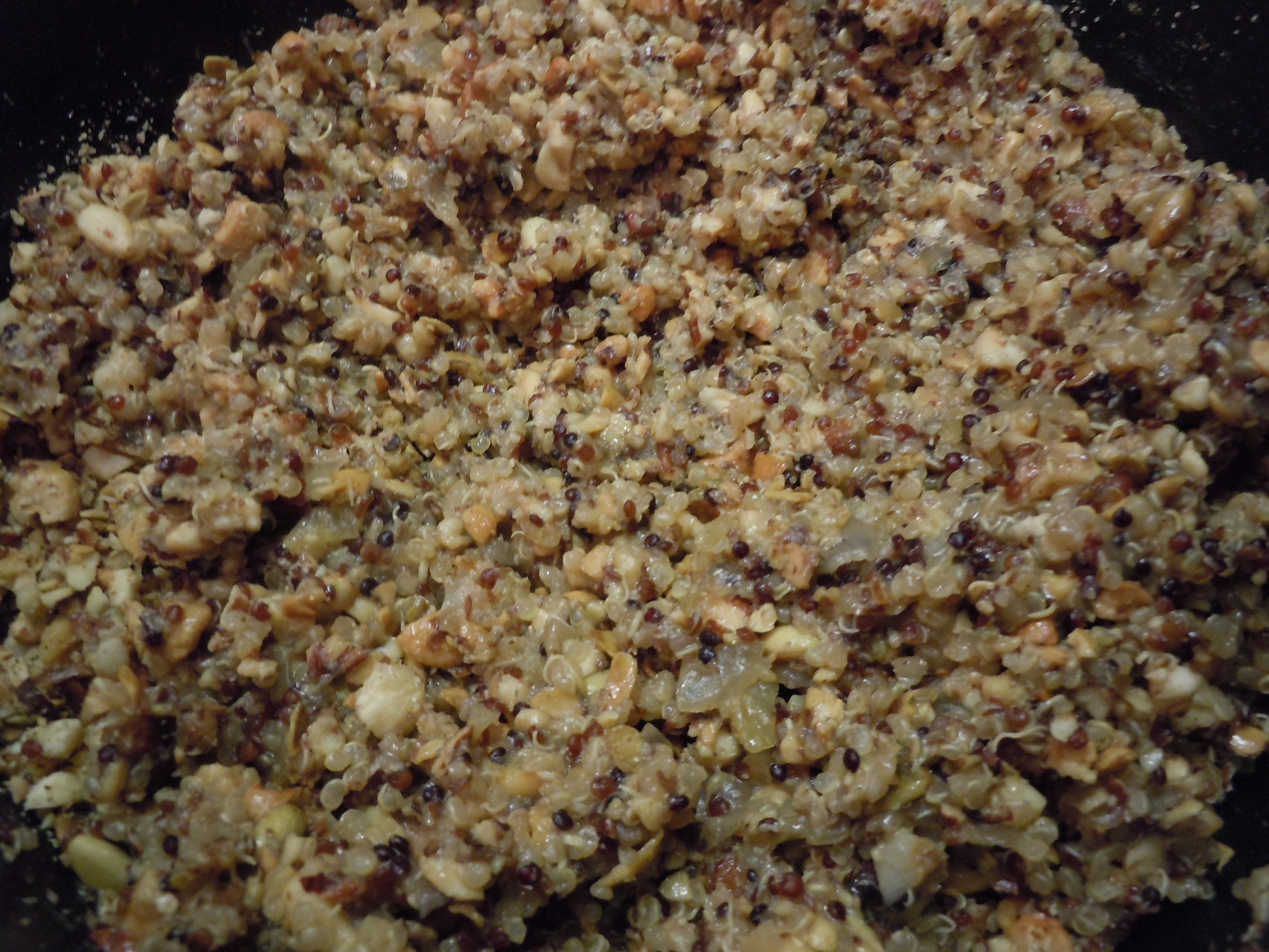 During a recent visit to the All Hallows’ Guest House in Norwich, England, Sr. Pamela (the Guest Mistress) served her own version of a nut loaf. It was fantastic, and inspired me to create my own. While she used rice and tomato sauce, I thought I would try quinoa and flax egg for my dish. This is more a pilaf than a nut-loaf (as was St. Pamela’s) and as such preserves the crunch and flavor of the nuts rather than creating a more uniform “meat-loaf” texture. This is pure comfort food. High in fat, to be sure, but savory, rich, and very, very satisfying. Perfect for a Sunday dinner or a celebration, but not something you would try every day! ~ Glyn and Will