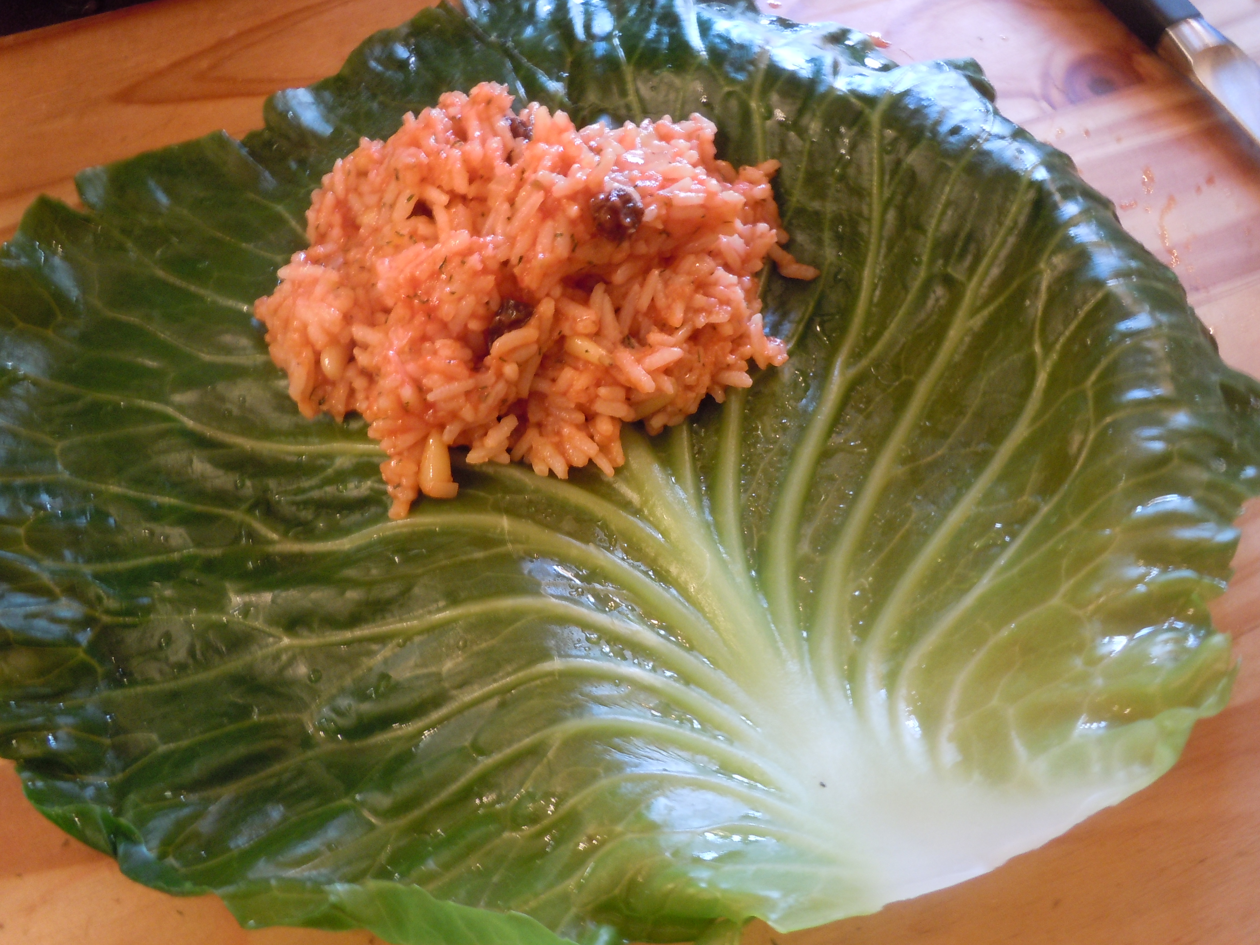Combine the rice the raisins, half the dill and ½ c of the tomato sauce with the onion/garlic/pinenuts. Season the mixture with salt and pepper.