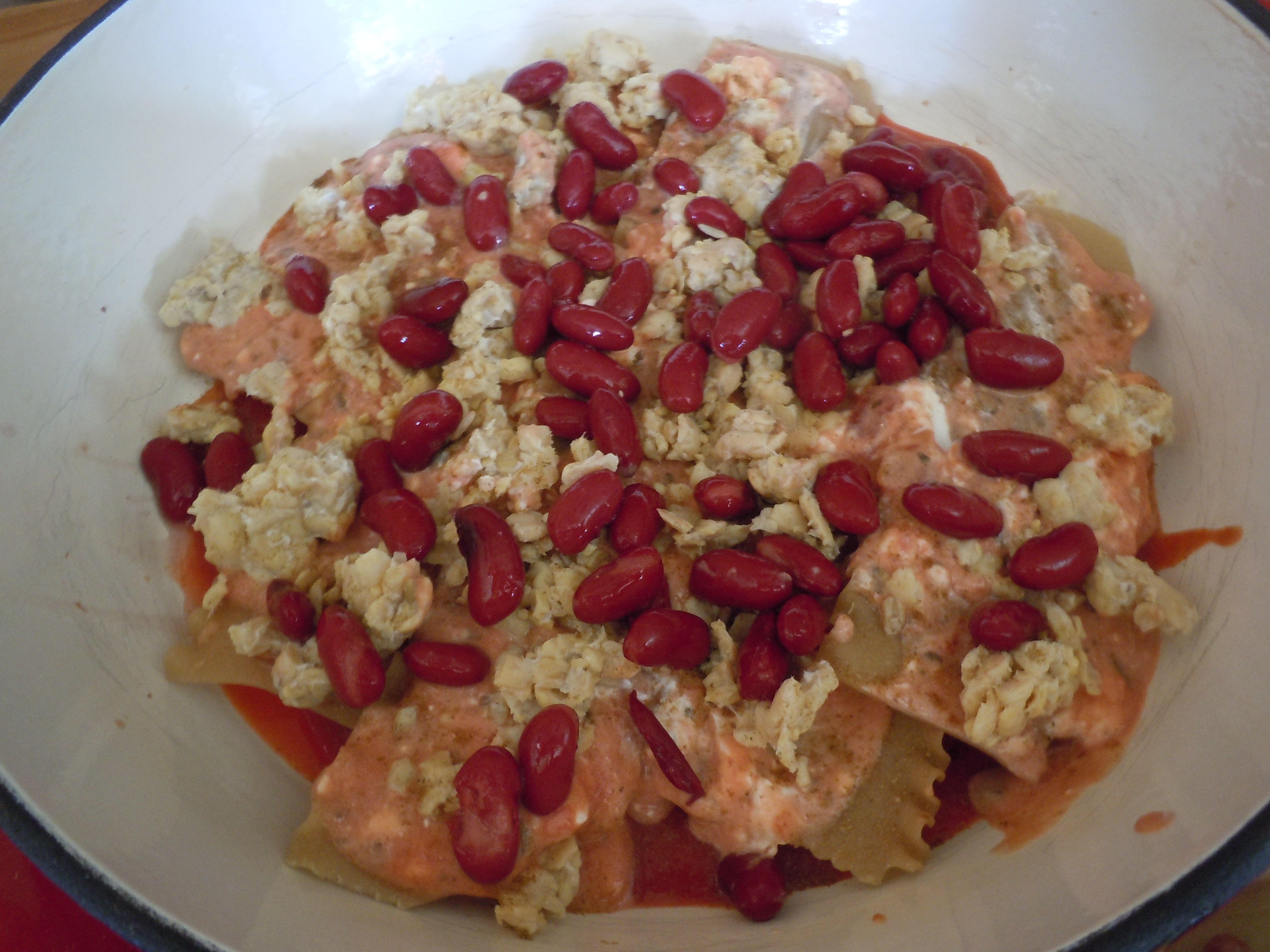In a lightly oiled baking pan, spread 1/3 of the sauce on the bottom. Add half the noodles, topped with half the beans, half the tofu and another third of the sauce. Add the remaining noodles, beans, tofu and sauce. Make sure that the surface of the noodles is completely covered. Cover and bake at 350 for one hour.