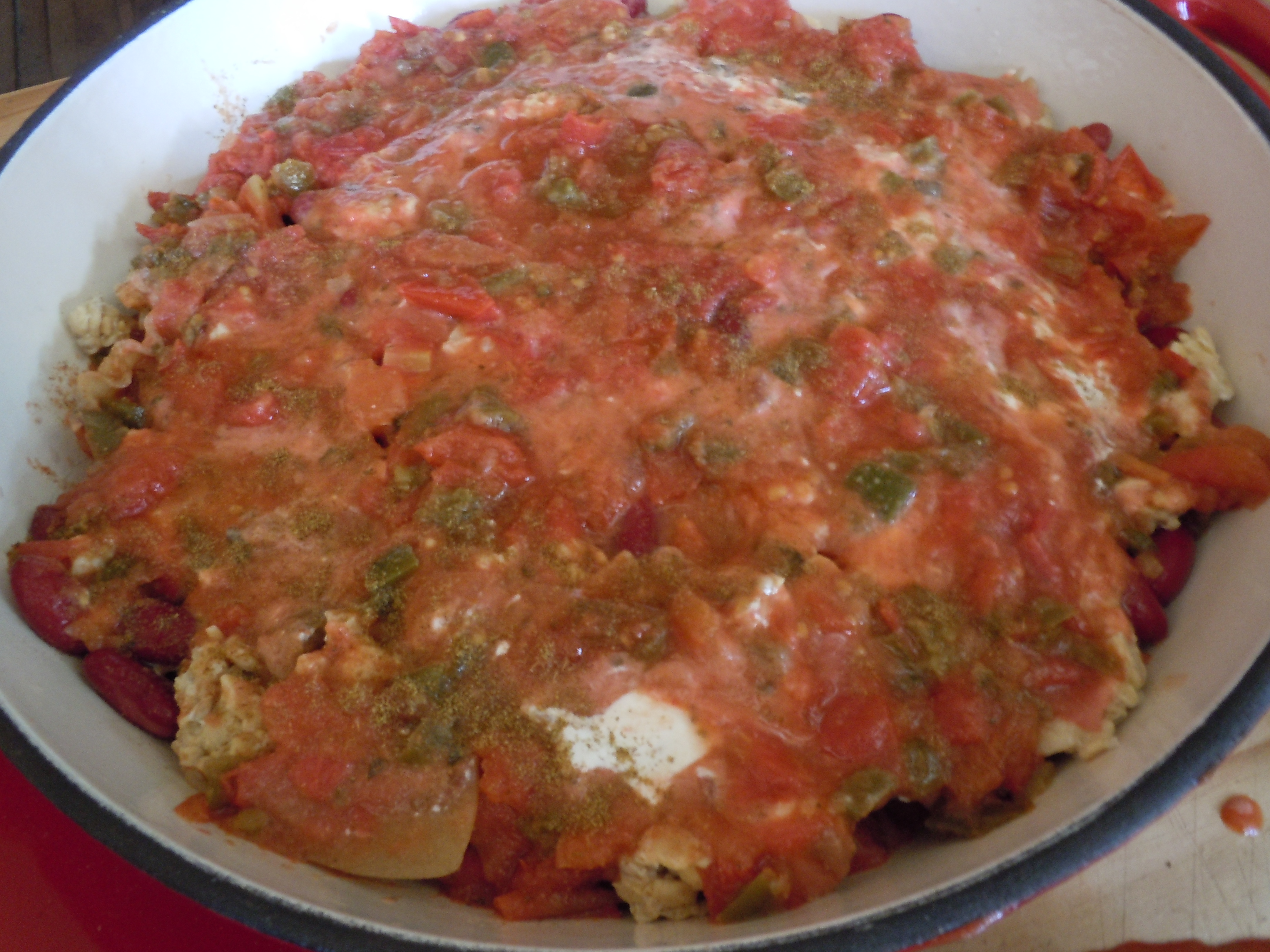 Combine the crushed tomatoes with the spices. Stir in the salsa and the vegan sour cream.