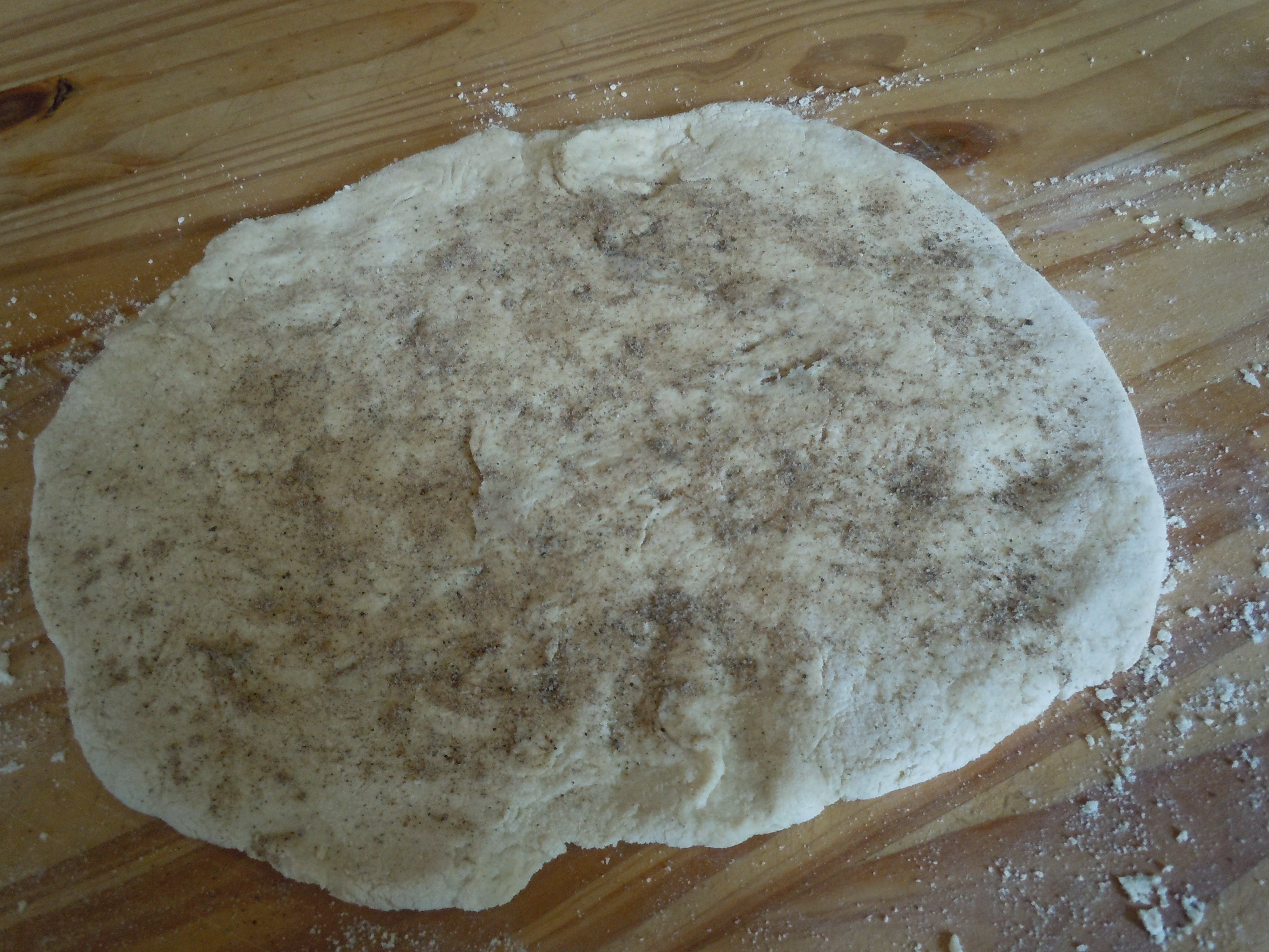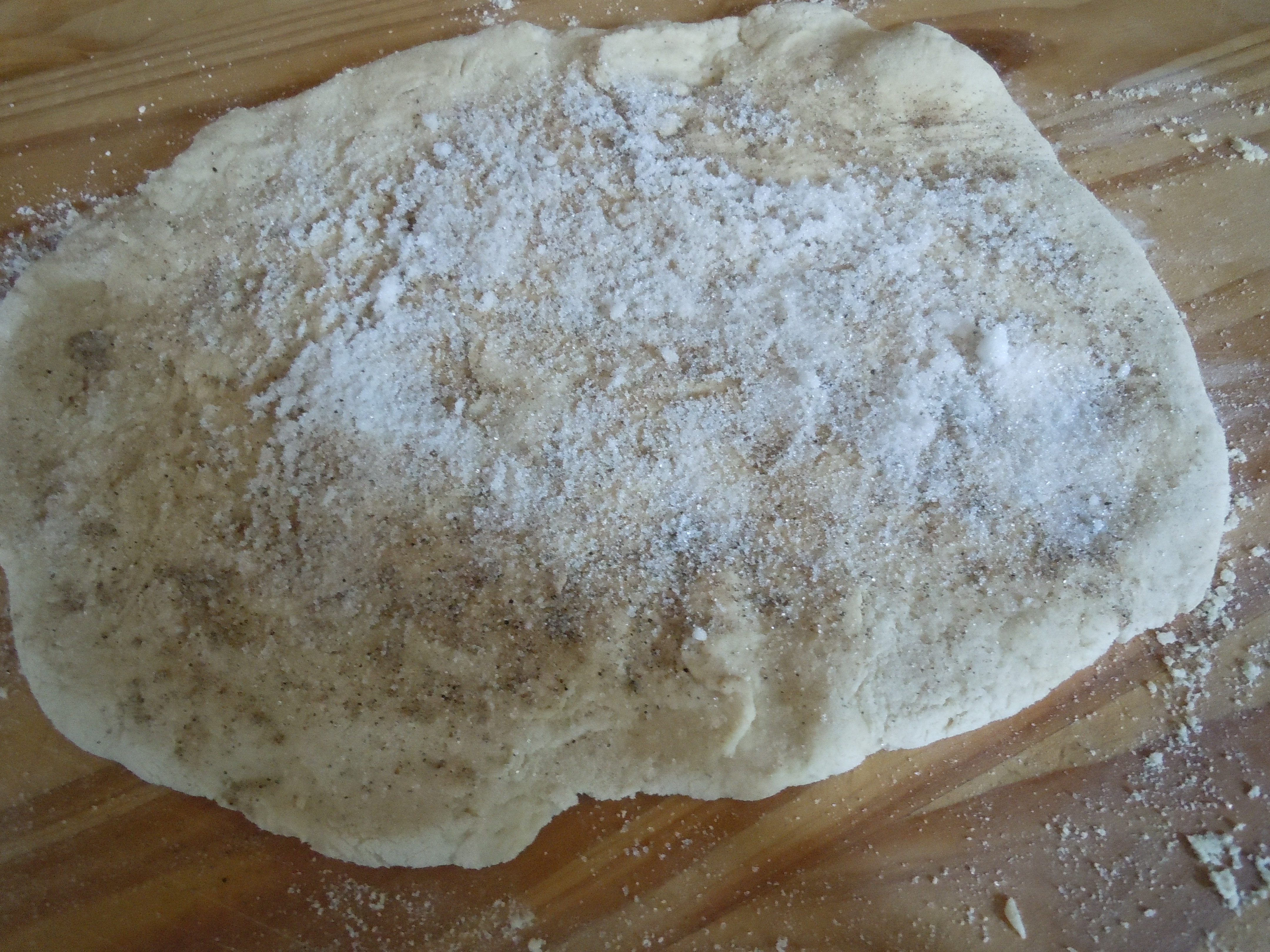 Flatten the prepared pizza dough. Sprinkle with the sugar and cardamom and fold over, kneading gently to combine and adding flour as need to make a soft, manageable dough. Divide the dough into eight pieces and place on a non-stick cooking sheet. Sprinkle lightly with additional sugar. Bake at 425 for 15 minutes or until risen and golden brown. Cool.