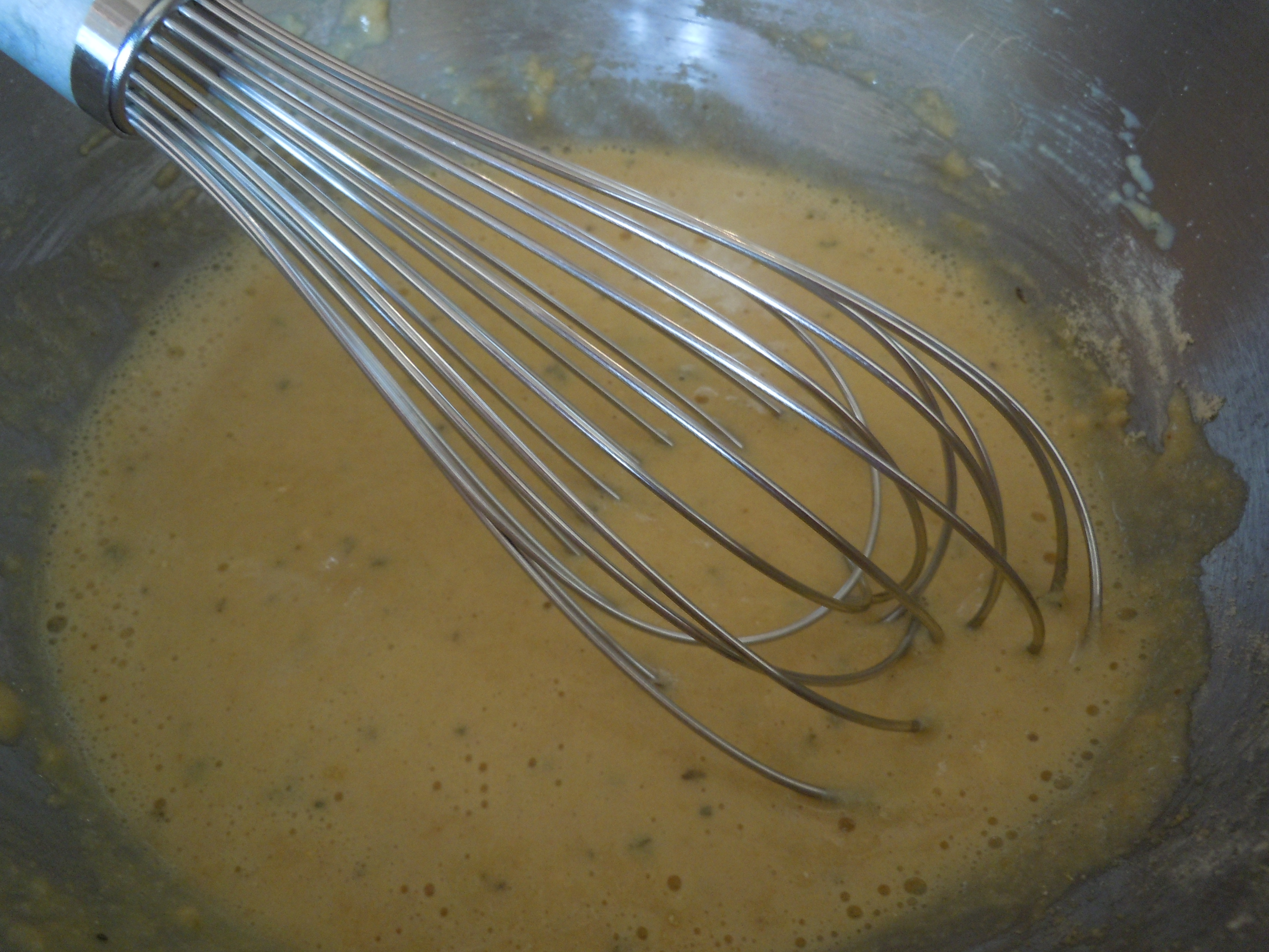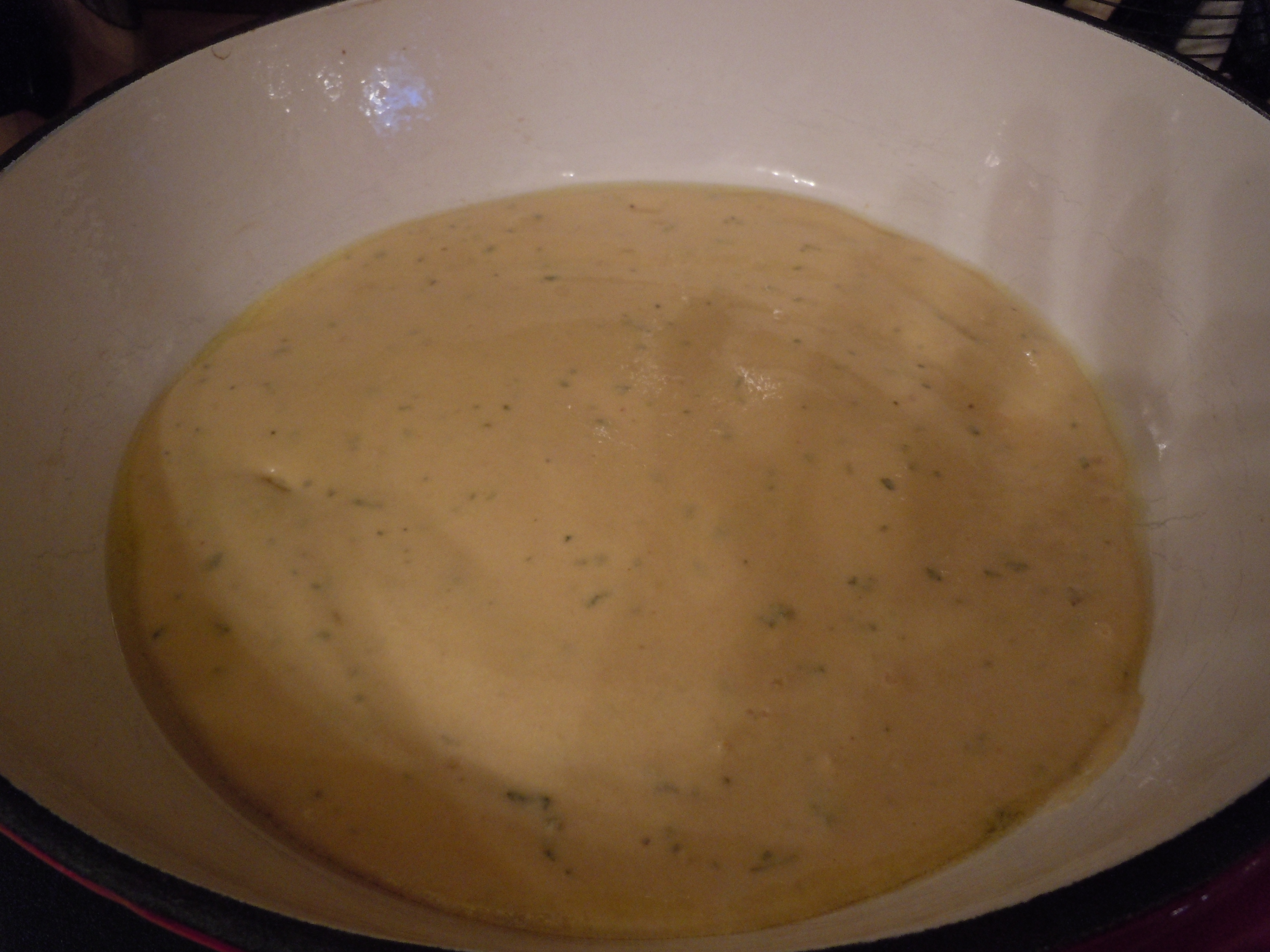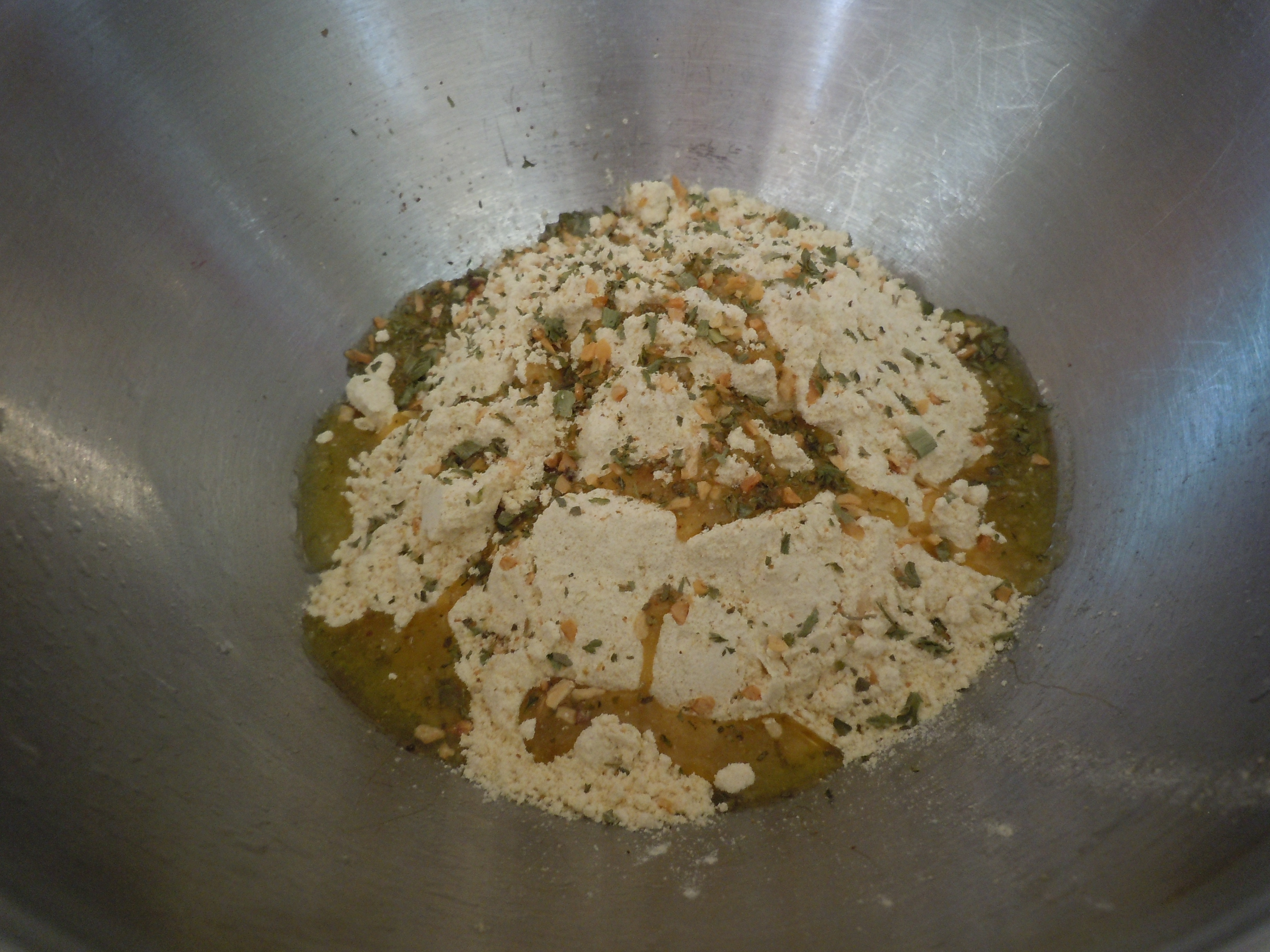 So, I spent a very happy hour this afternoon looking at recipes and blogs for a way to make these flatbreads. All the recipe seem to be pretty standard (equal parts water and garbanzo bean flour). It’s up to you how to mix the batter, how long to let it sit and whether to add salt, oil or herbs. I even saw one site that added parmesan cheese. It’s also really great that everyone seems to have a different way of cooking them. They can be as thin as individual crepes, or slightly thicker pancakes, or even as a flat cake-like. And they can be prepared in an oven, or a broiler or on top of the stove — with or without turning. I chose to cook these first in the oven, then under the broiler in a pre-heated lightly oiled cast iron casserole. I also added oil, salt and herbs de Provence. The cooking technique I decided on is from Yum Universe by Heather Crosby. (http://yumuniverse.com/gluten-free-dairy-free-herbed-chickpea-flatbread/) which, by the way, is a terrific plant-based, gluten-free website. Thanks, Heather!