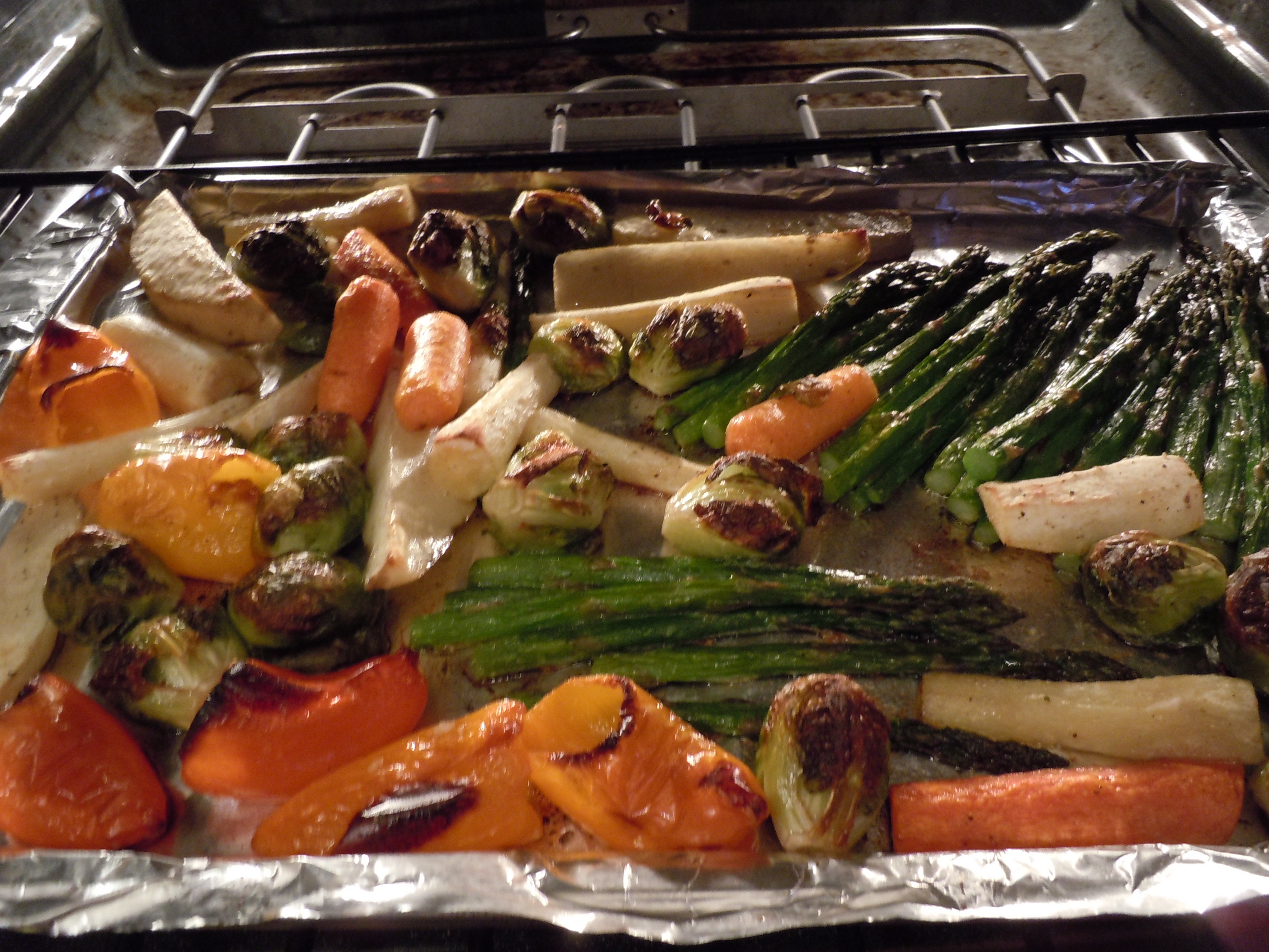 Marinate an assortment of vegetables in ¼ c olive oil, lightly seasoned with salt, pepper, onion powder and garlic powder. This works best if the veggies are of an approximate thickness. I used what I had on hand: Brussels sprouts, carrots, parsnips, potatoes, sweet peppers, and asparagus. Roast at 425F for 20-25 minutes or until browned to your preference. Serve with the Tuscan Bean Sauce.