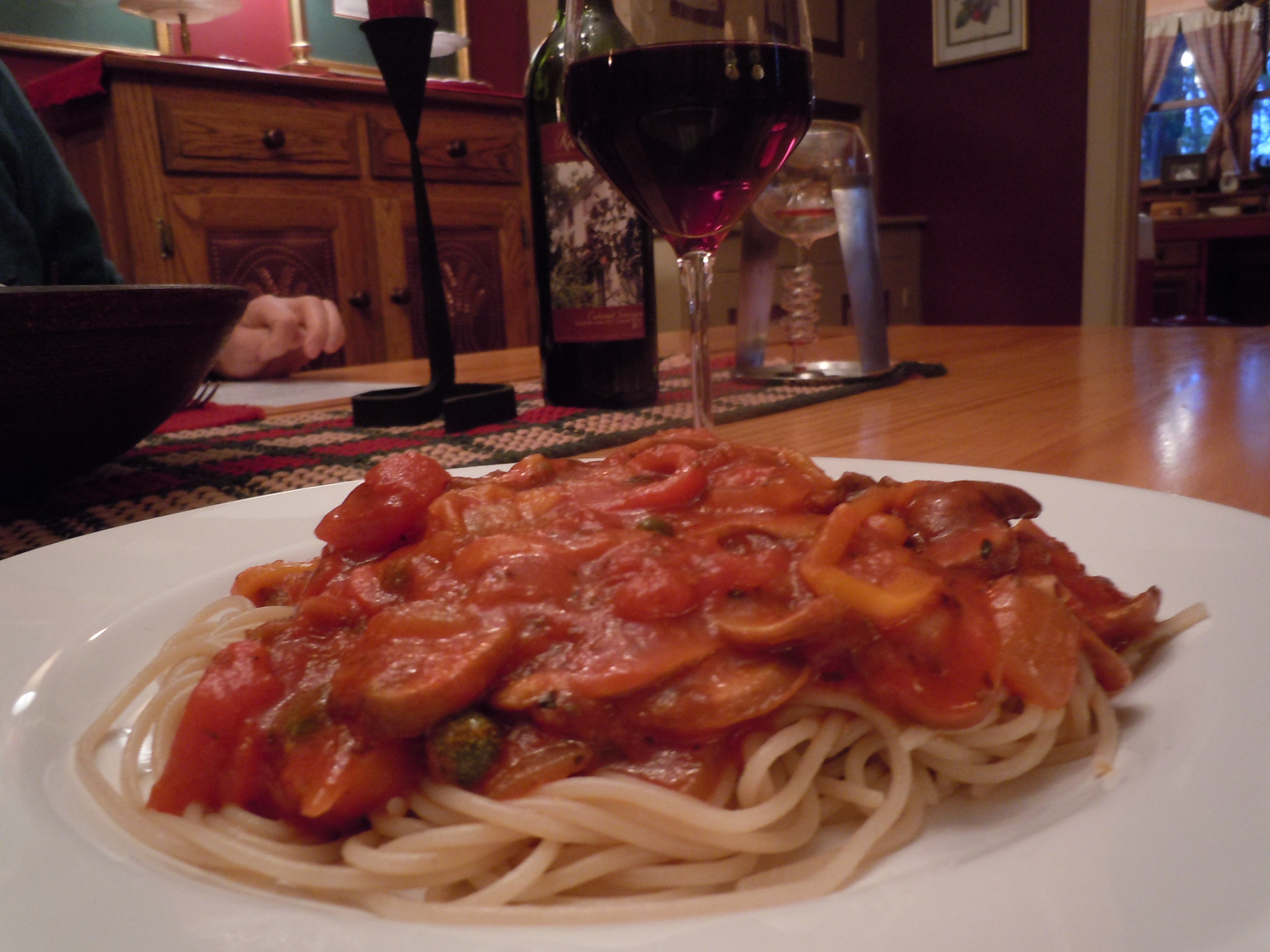 Saute the peppers, mushrooms, garlic and onion in the olive oil. Stir in the oregano, marjoram, basil, bay leaf, cinnamon and diced tomatoes. Add the water and the tomato paste. Stir well, season with salt and red pepper and simmer for 20-30 minutes while you prepare the pasta.