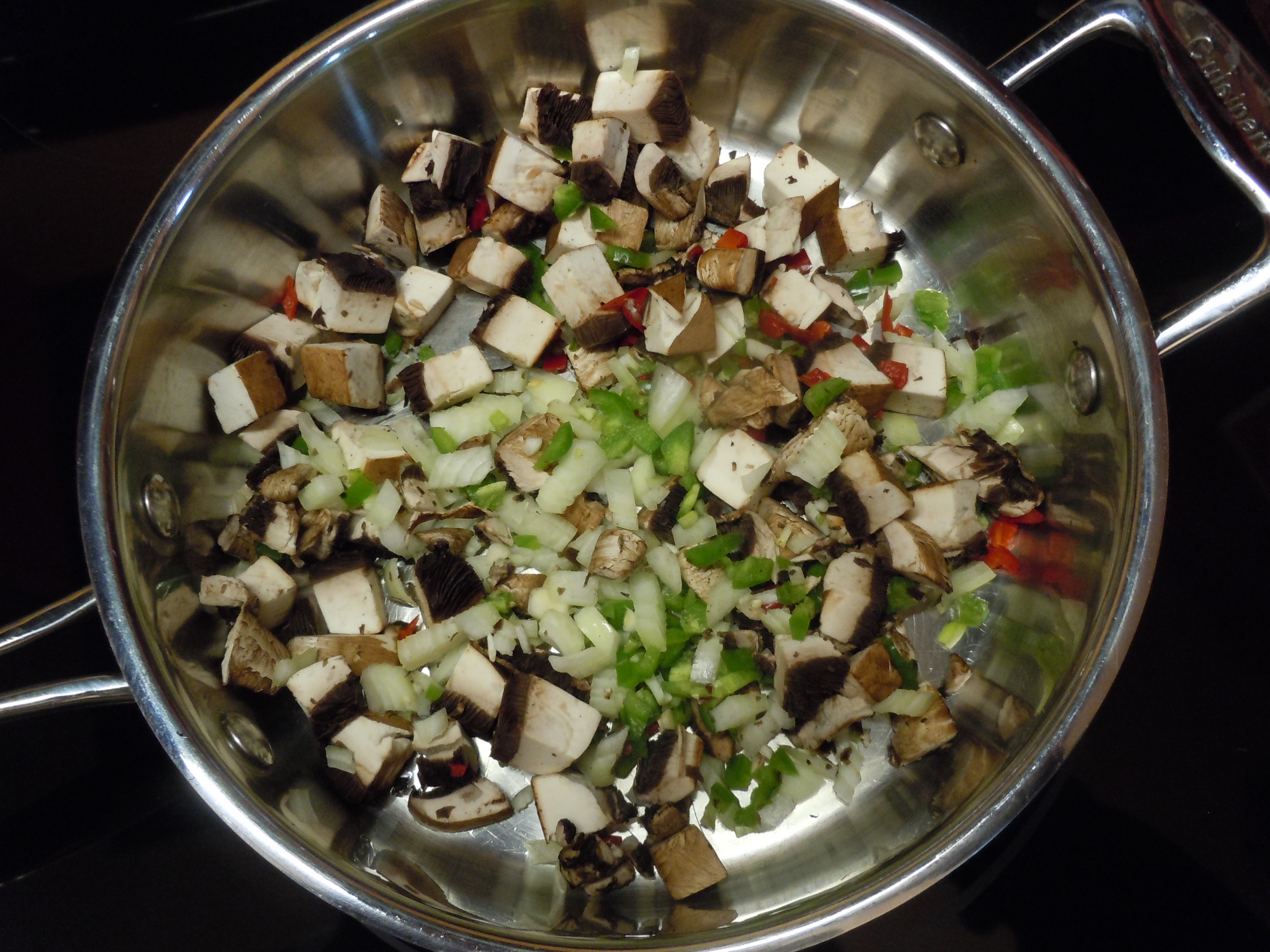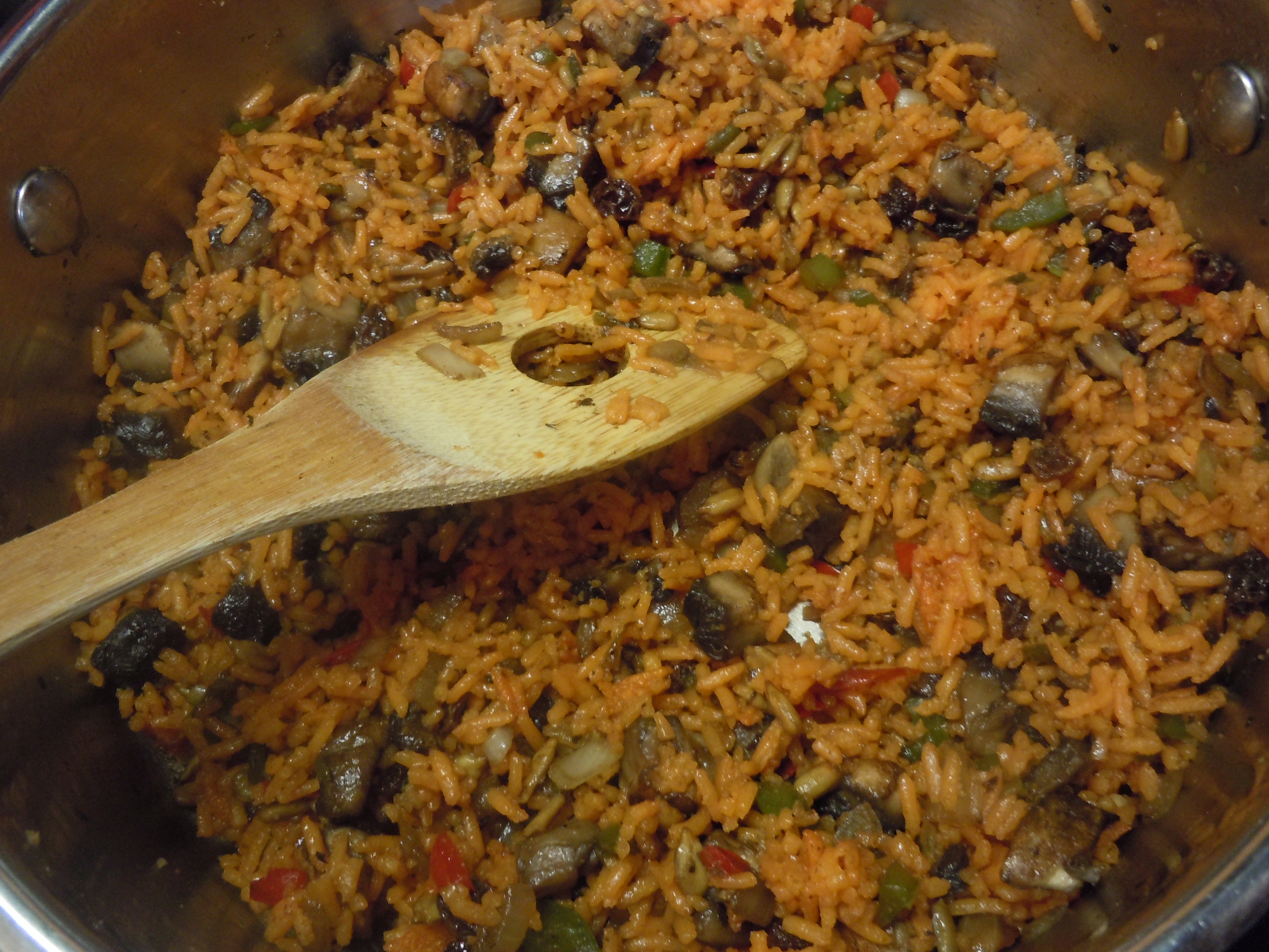 Meanwhile, saute the onion, garlic, peppers and mushrooms in the olive oil and add to the cooked rice.