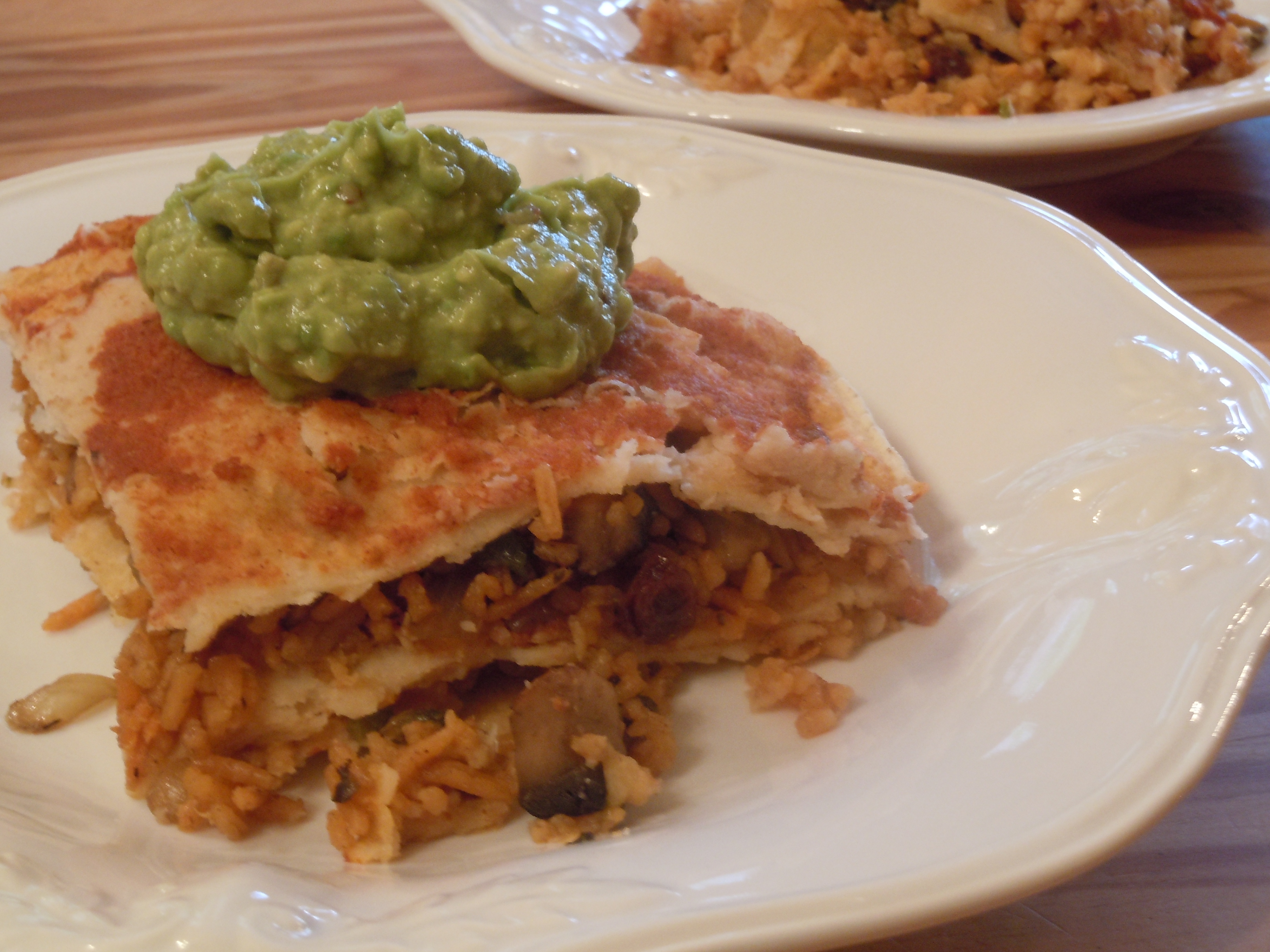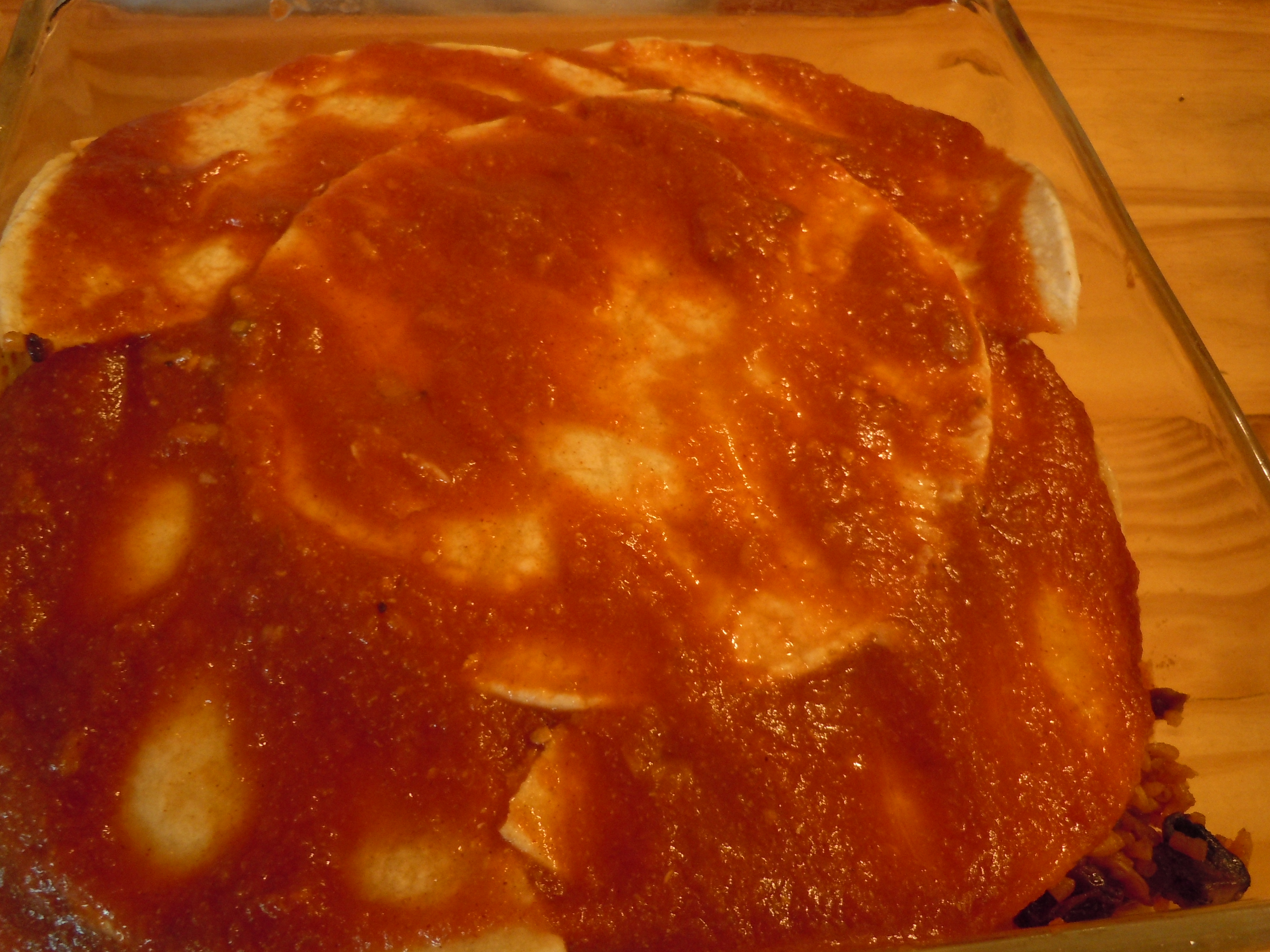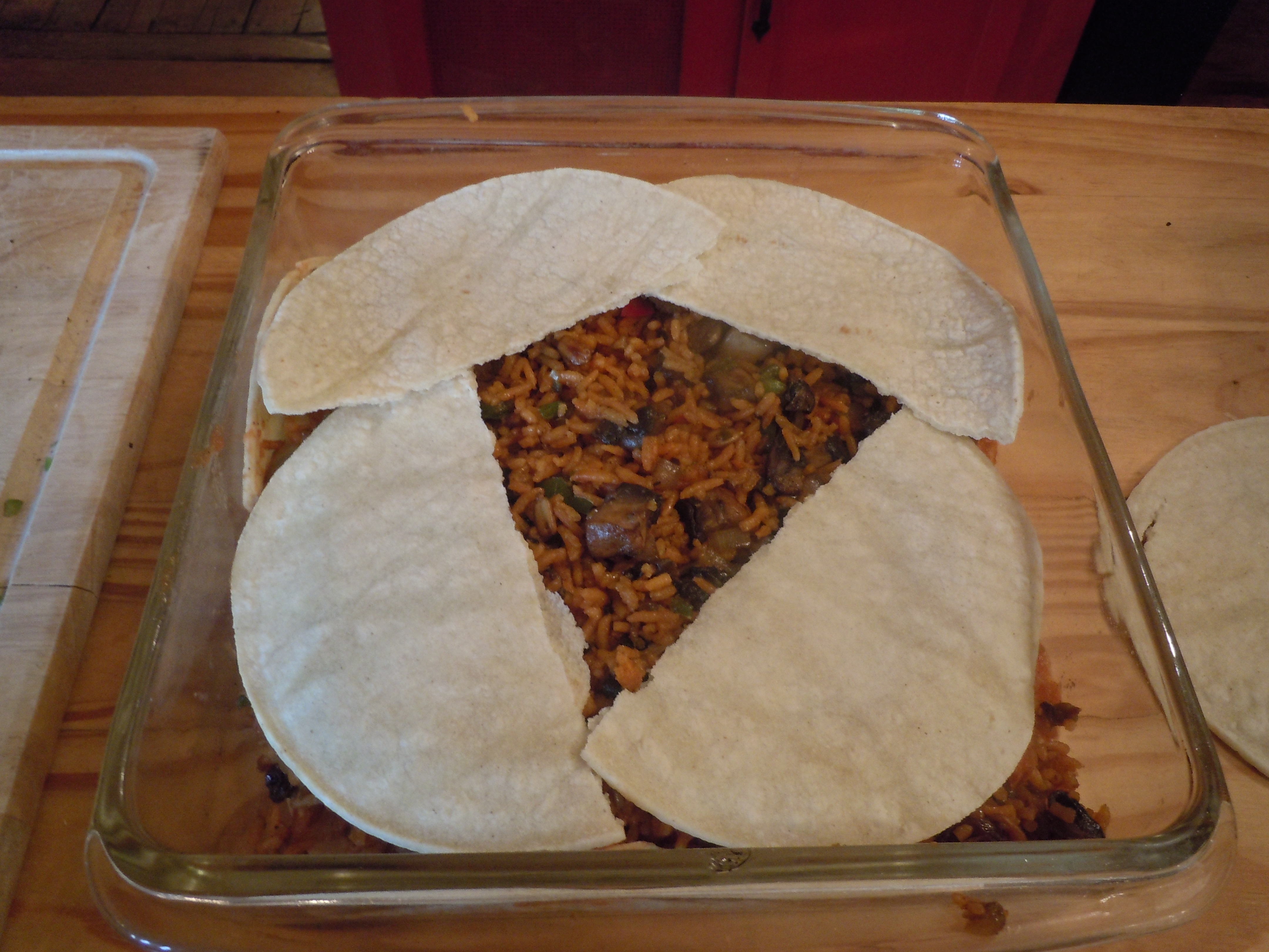 Place three tortillas in the bottom of an oiled 9” baking dish. Add half the rice mixture.