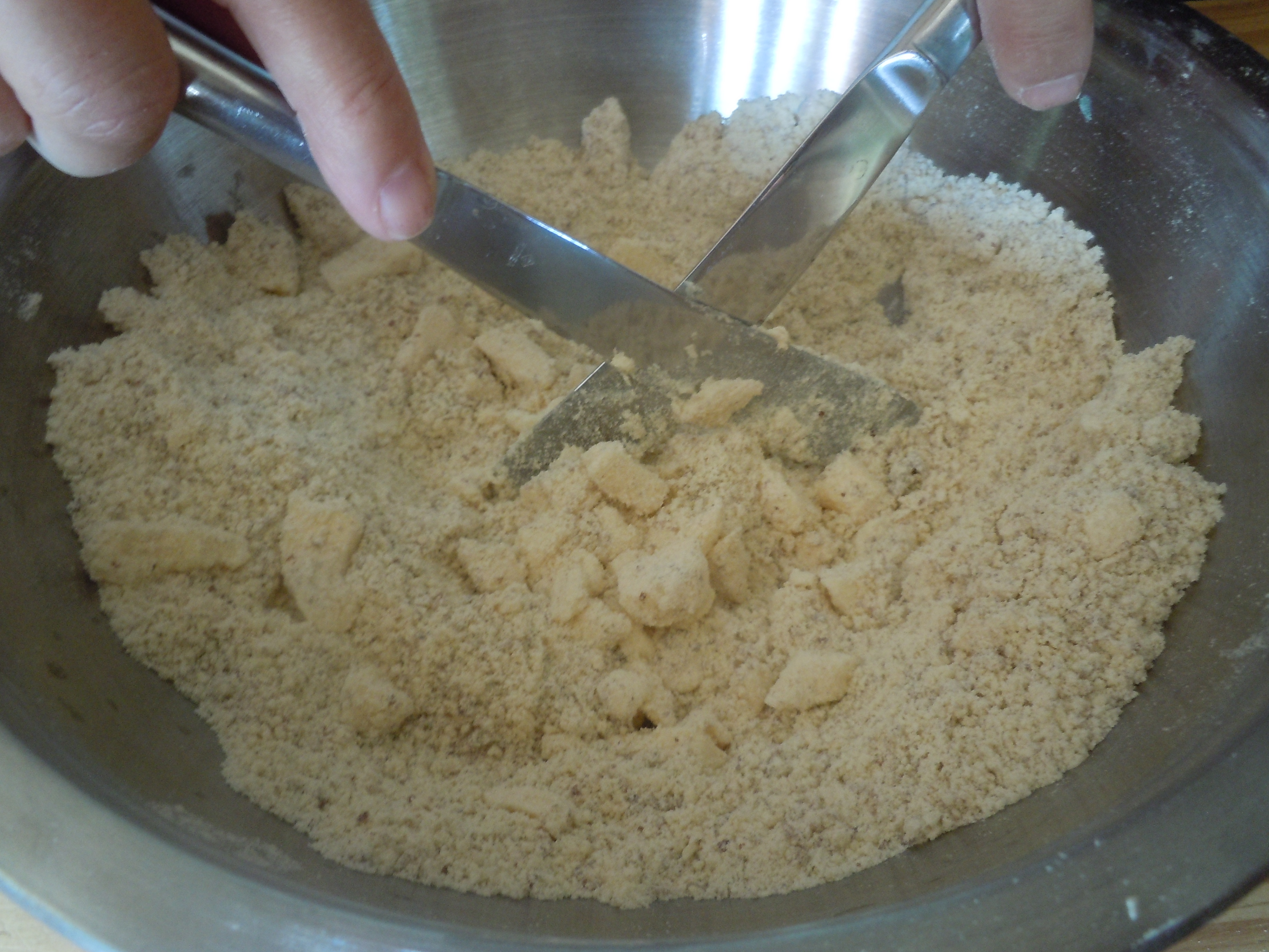 3 Cut in the vegan butter or margarine until lumps are gone and the crumb is fine.