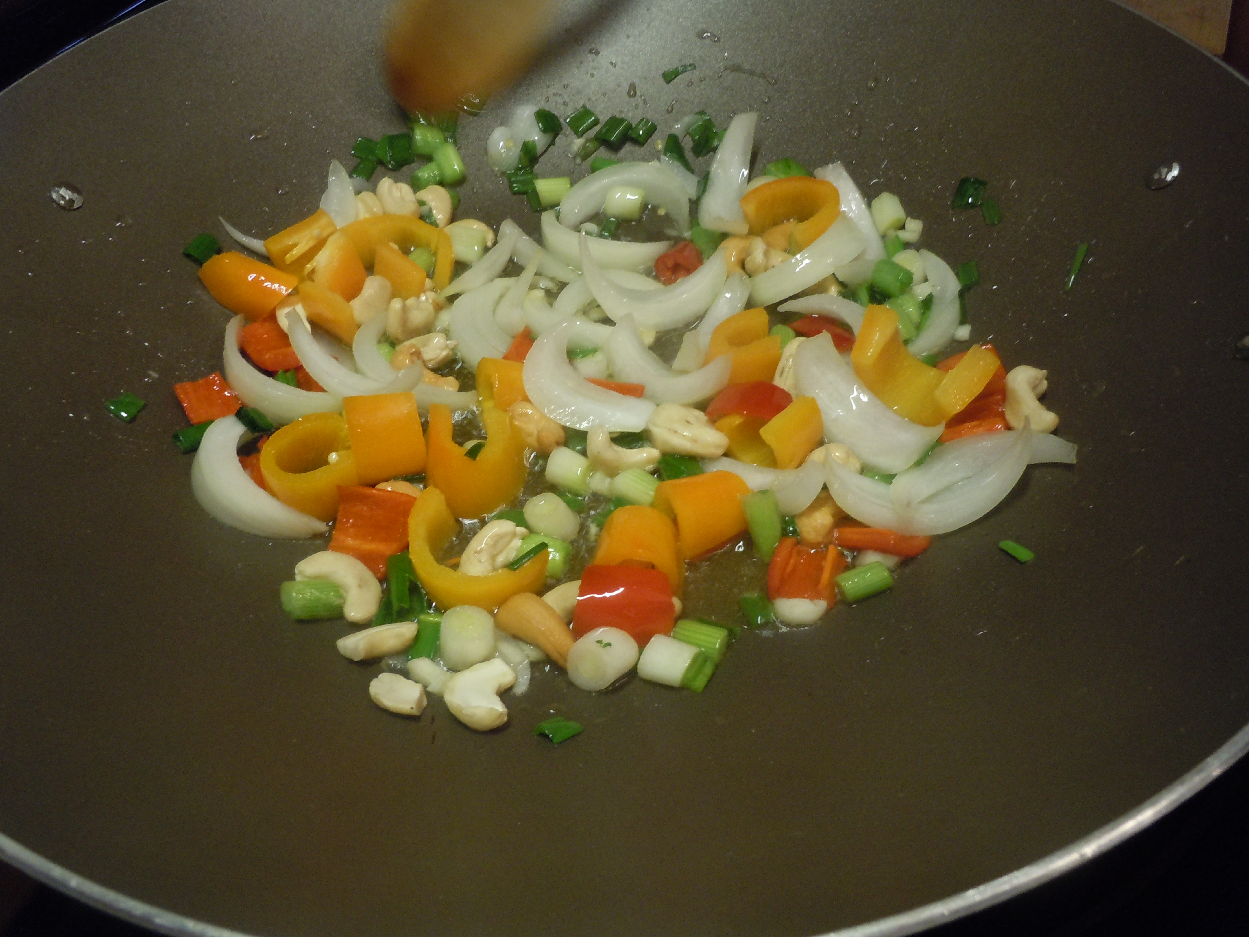 4. Stir fry the onions, peppers, garlic and cashews.