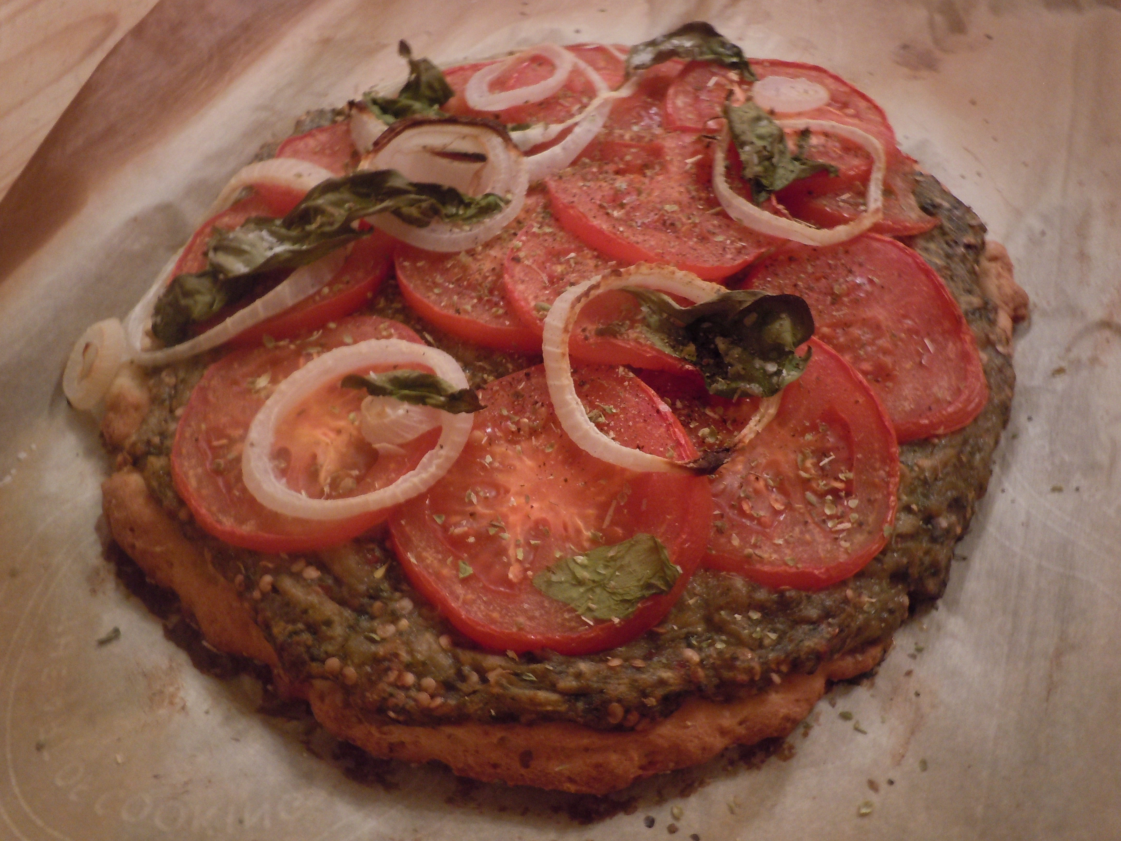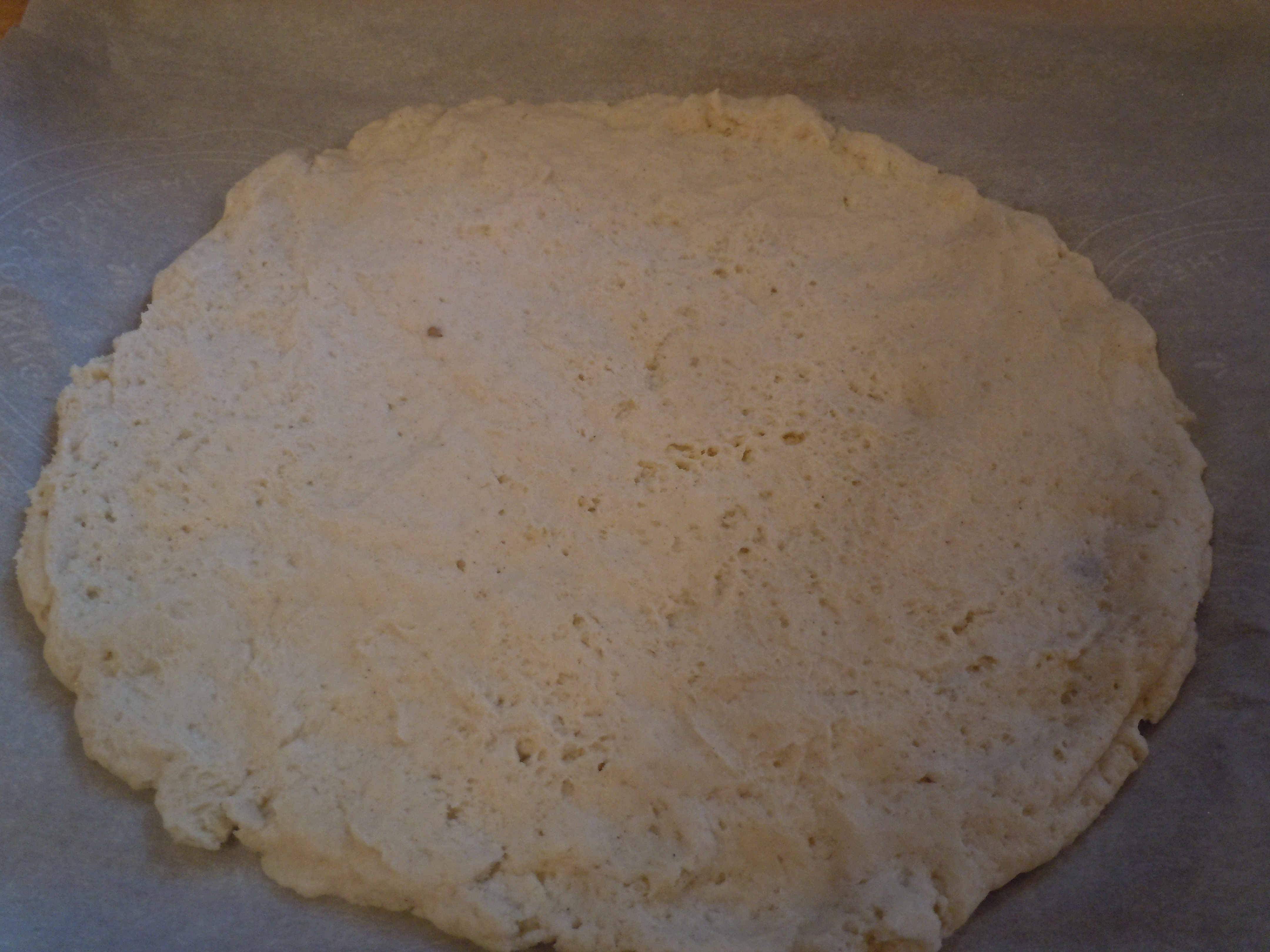 4. When the dough has risen, use your hands to spread it to a 12″ round.