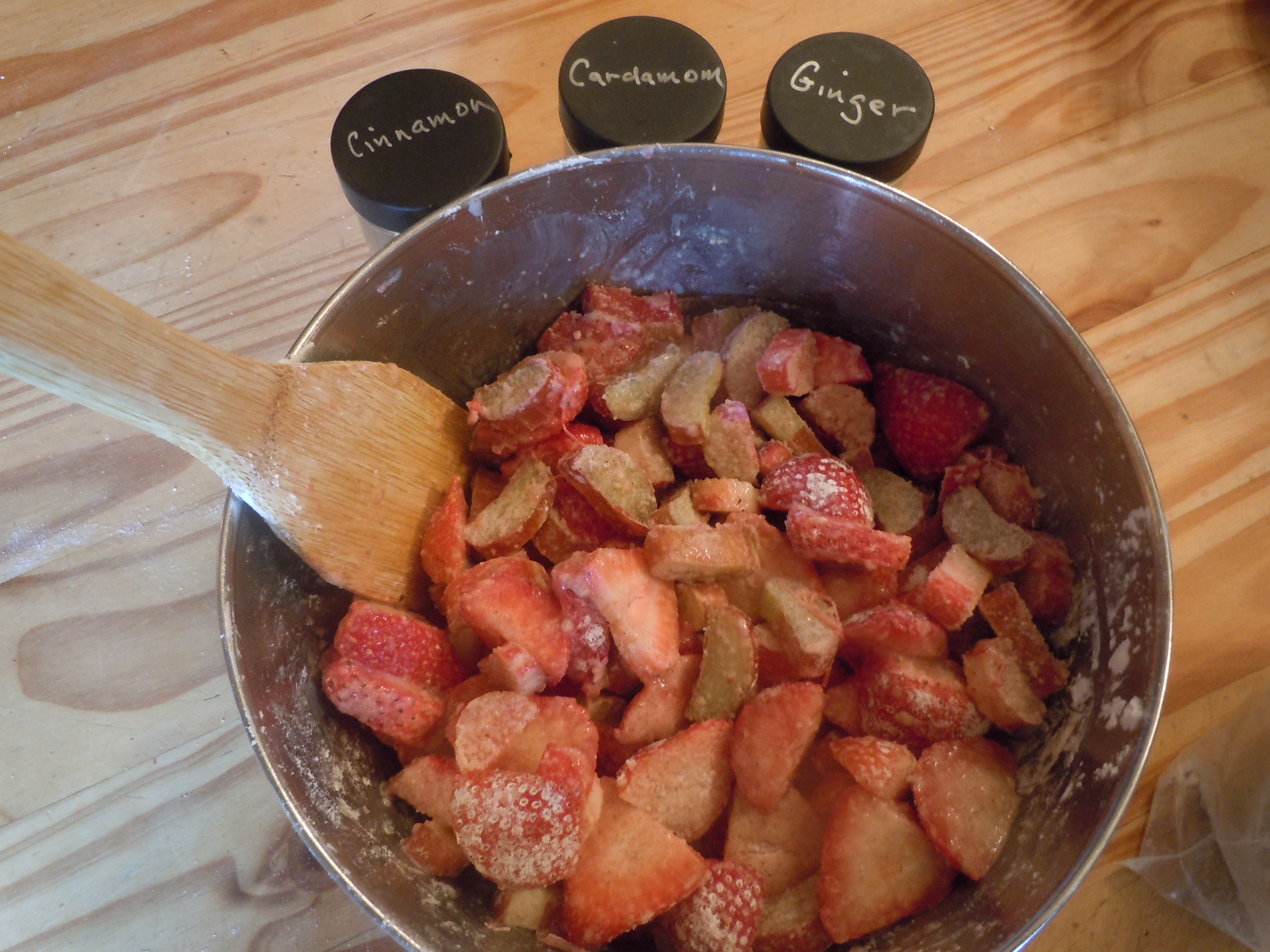 4 Combine with the strawberries and rhubarb, mix well and let sit while you make the pastry.