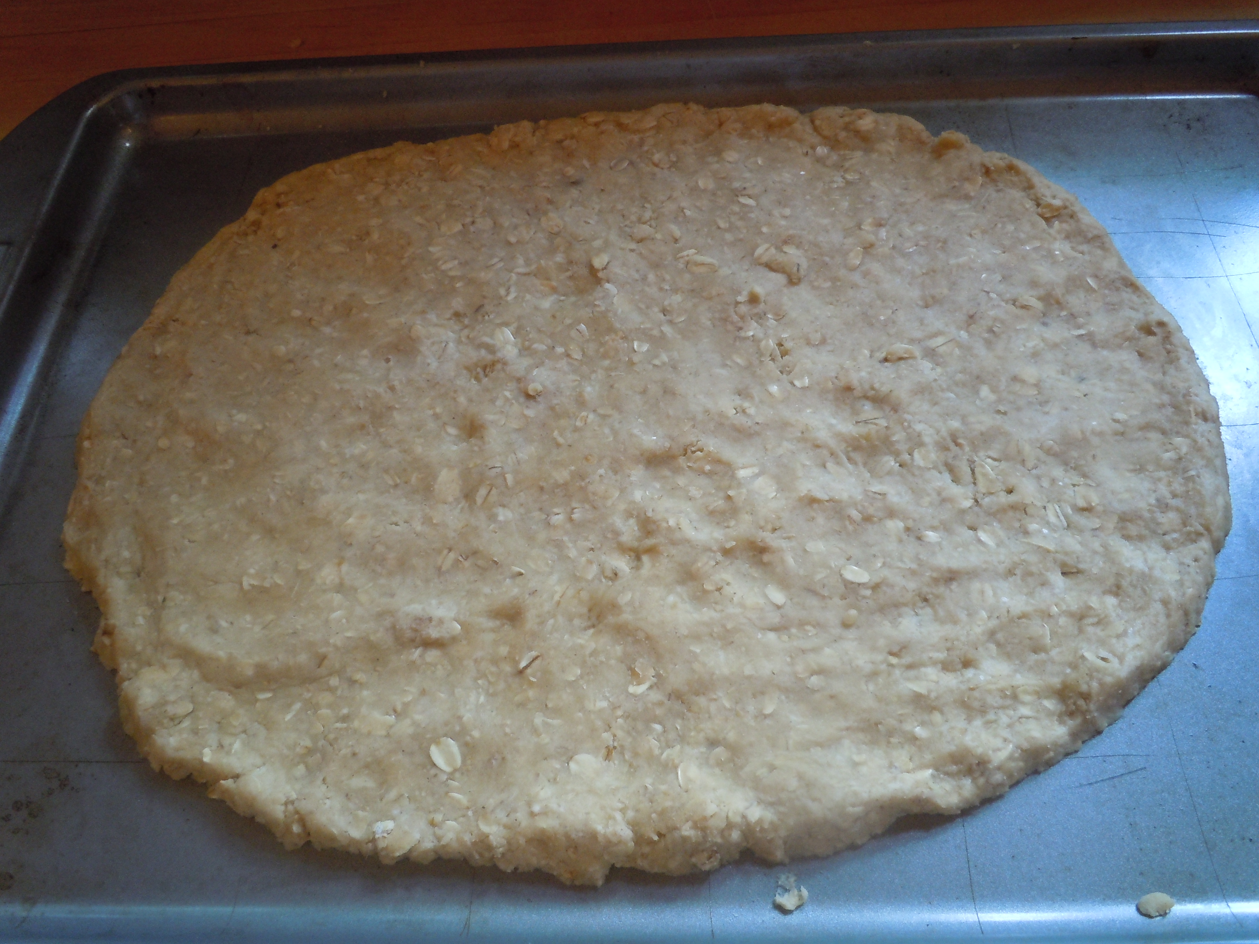 8 Press the dough onto an ungreased baking sheet into a 12″ oval or round.
