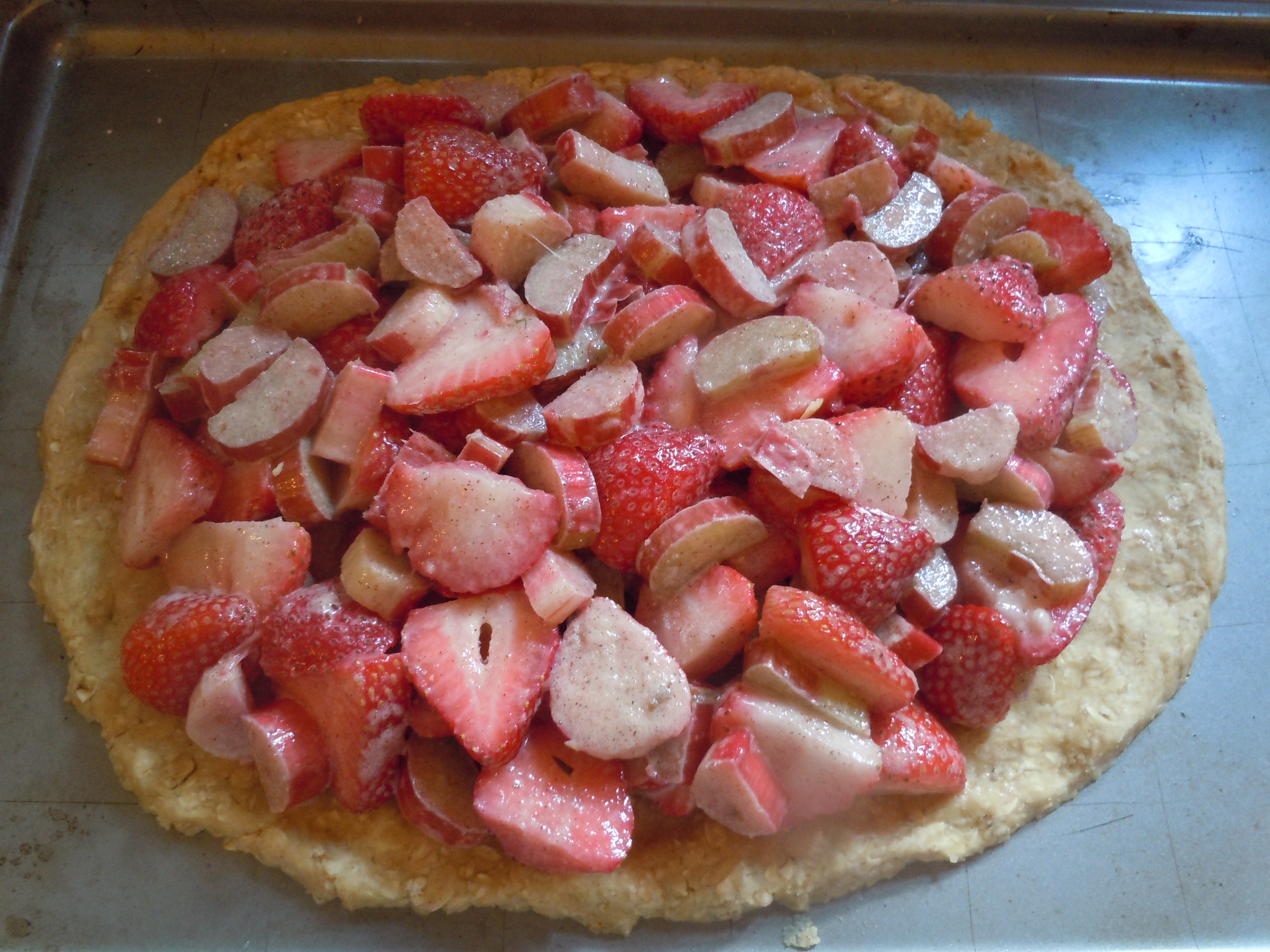 9 Spoon the rhubarb strawberry mixture over the crust, leaving at least 1/2″ from the edges clear of topping.