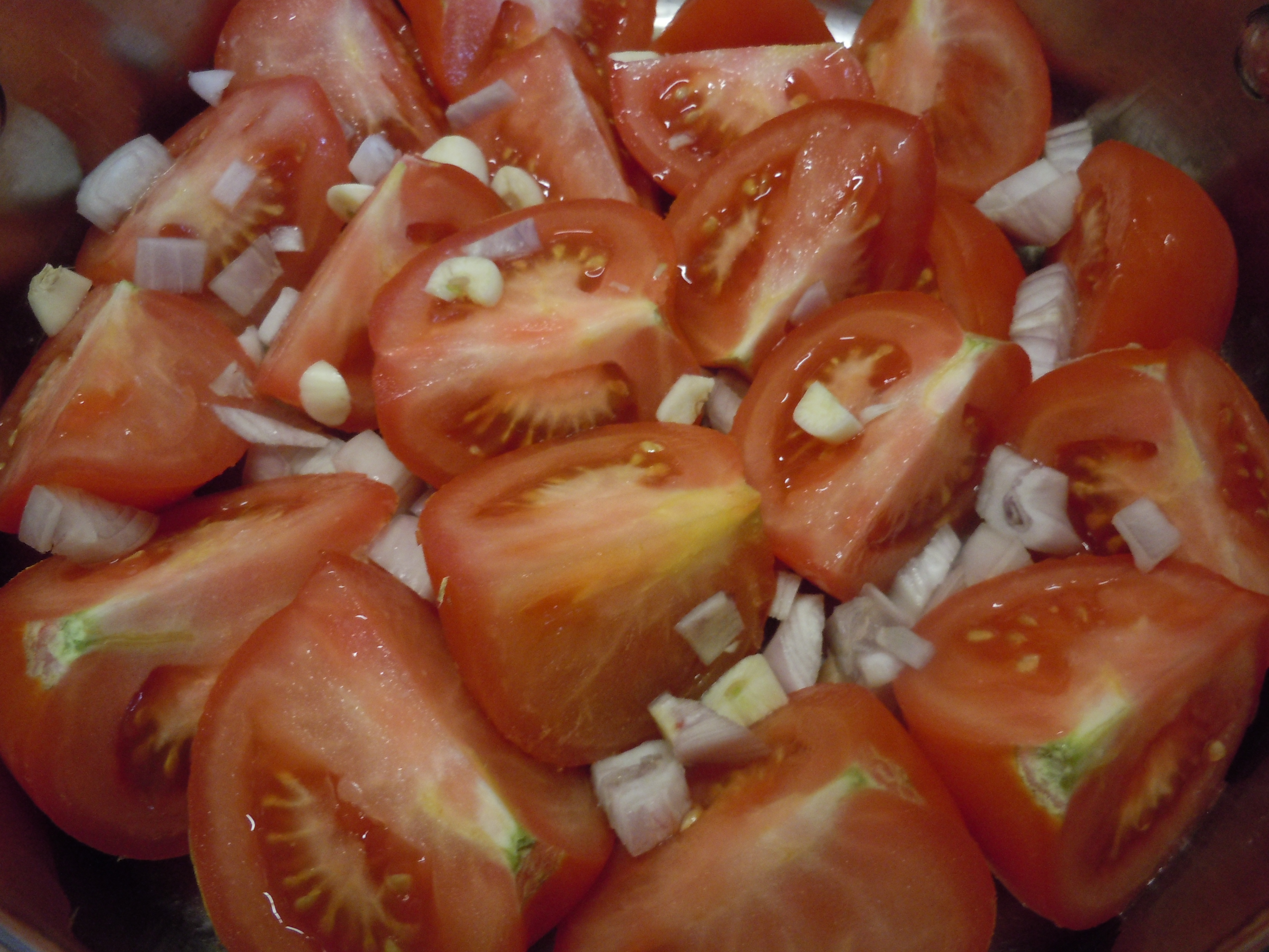 1 Quarter the tomatoes and chop the shallots and garlic.