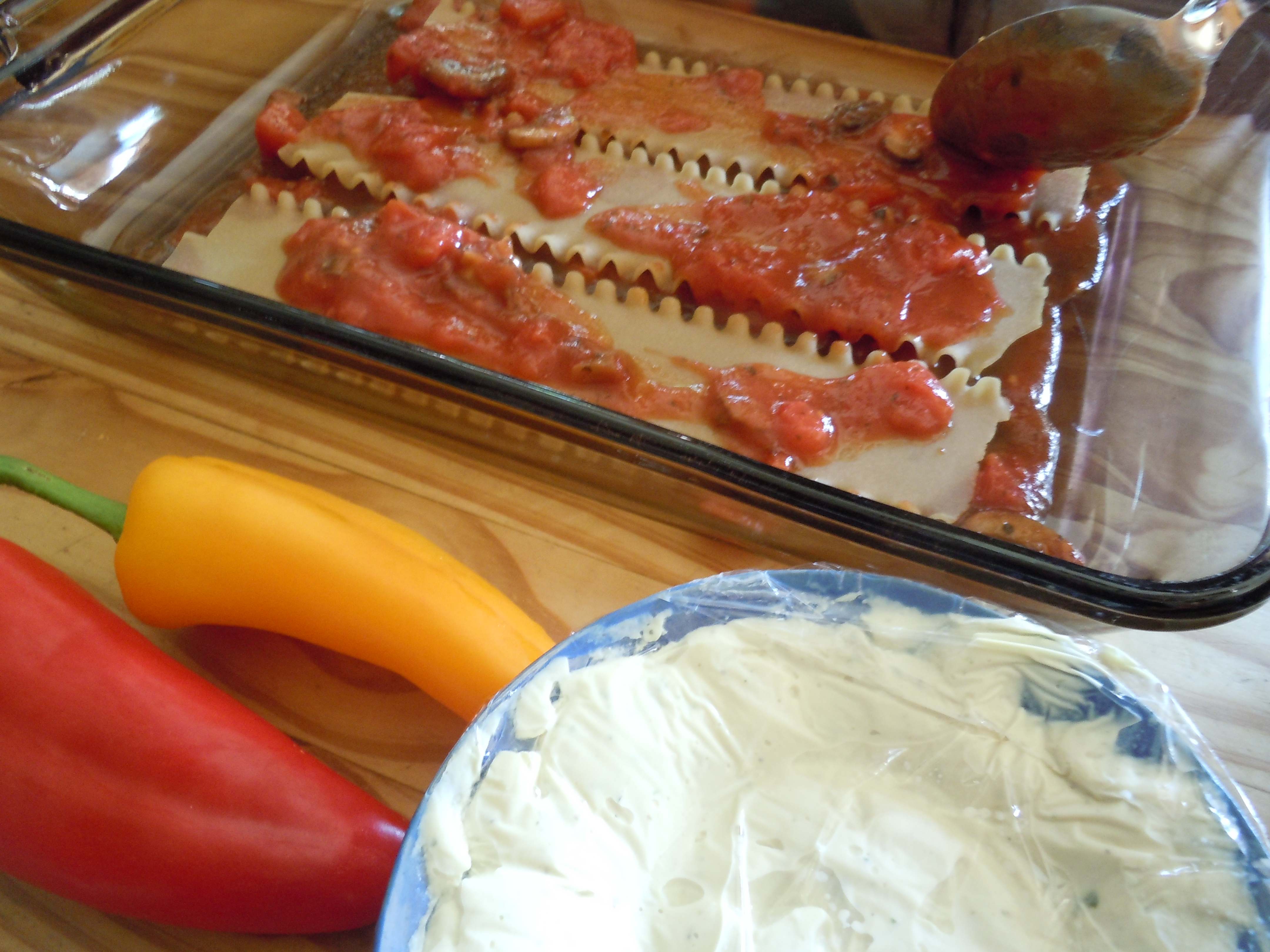 11 Evenly spread the remaining marinara sauce over the noodles.