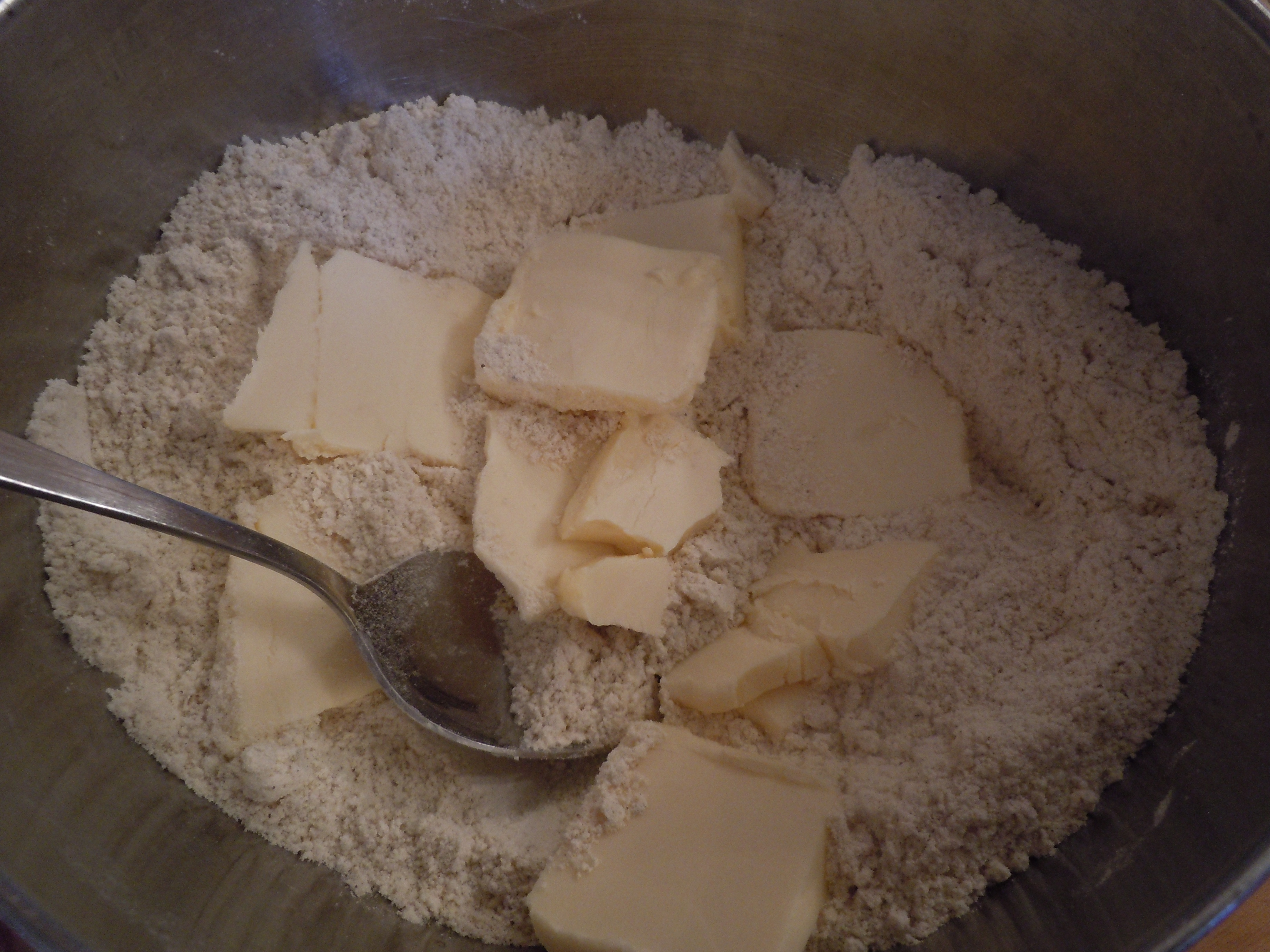 3 Cut in the margarine until a crumbly dough is achieved.