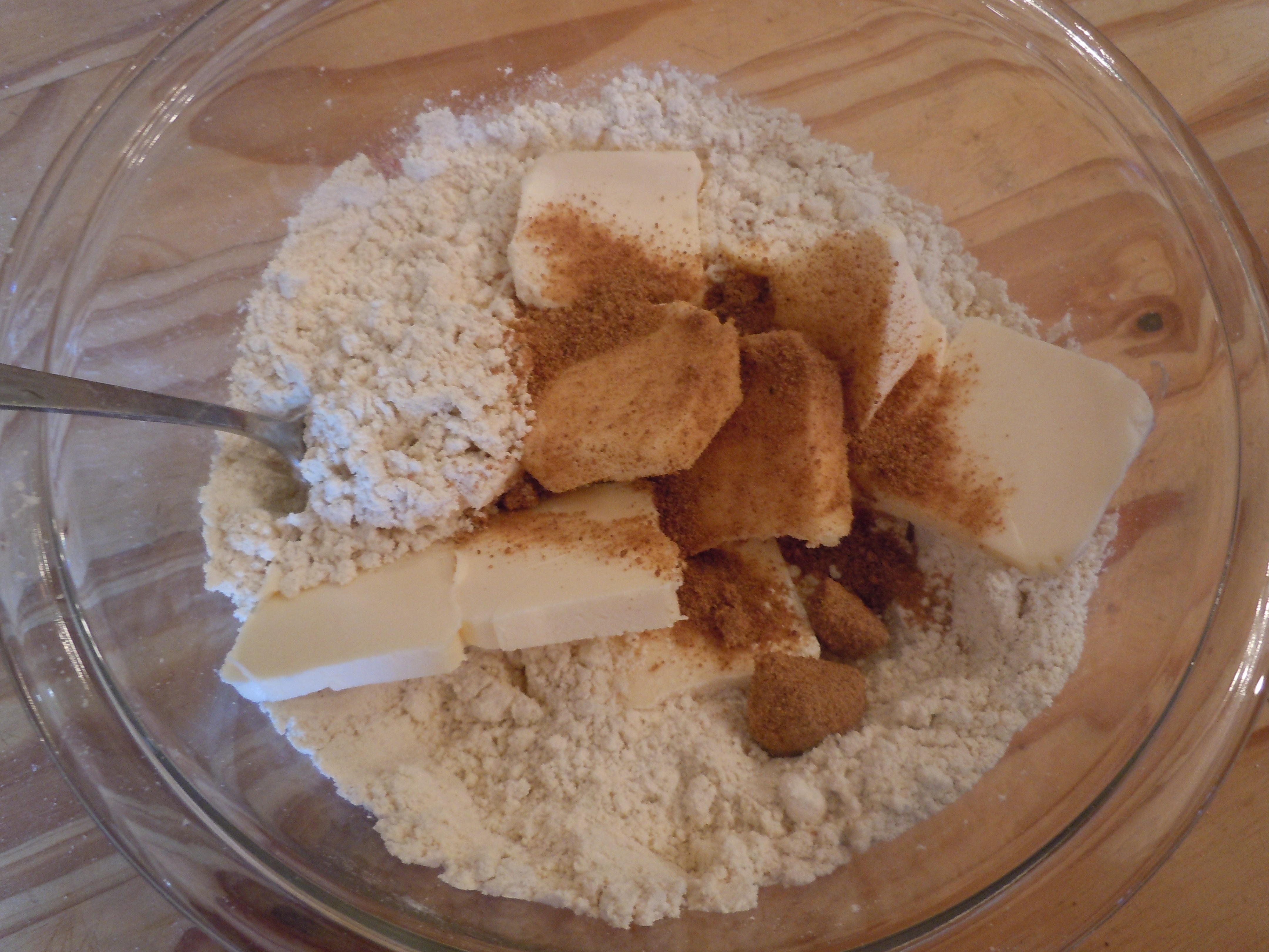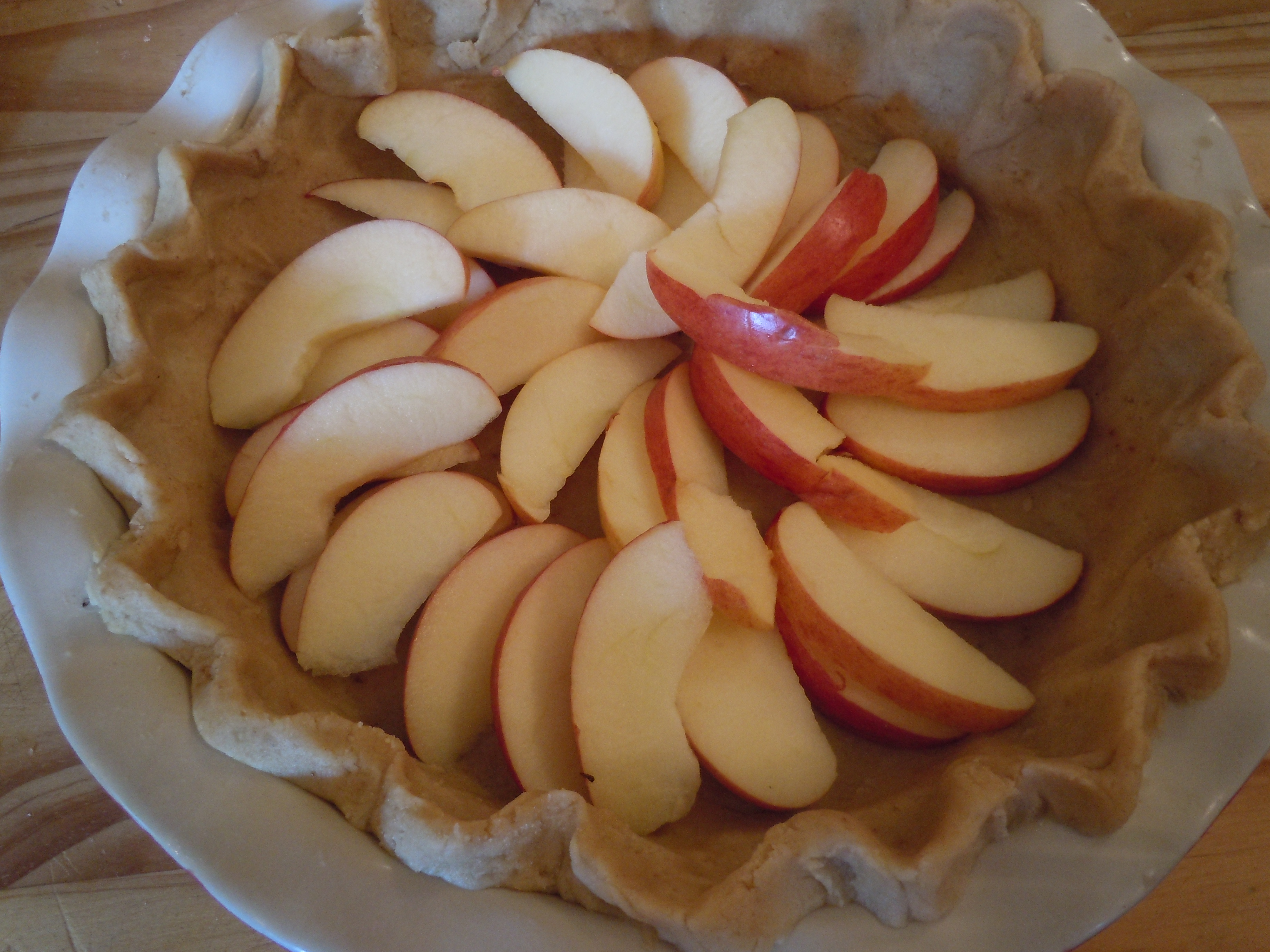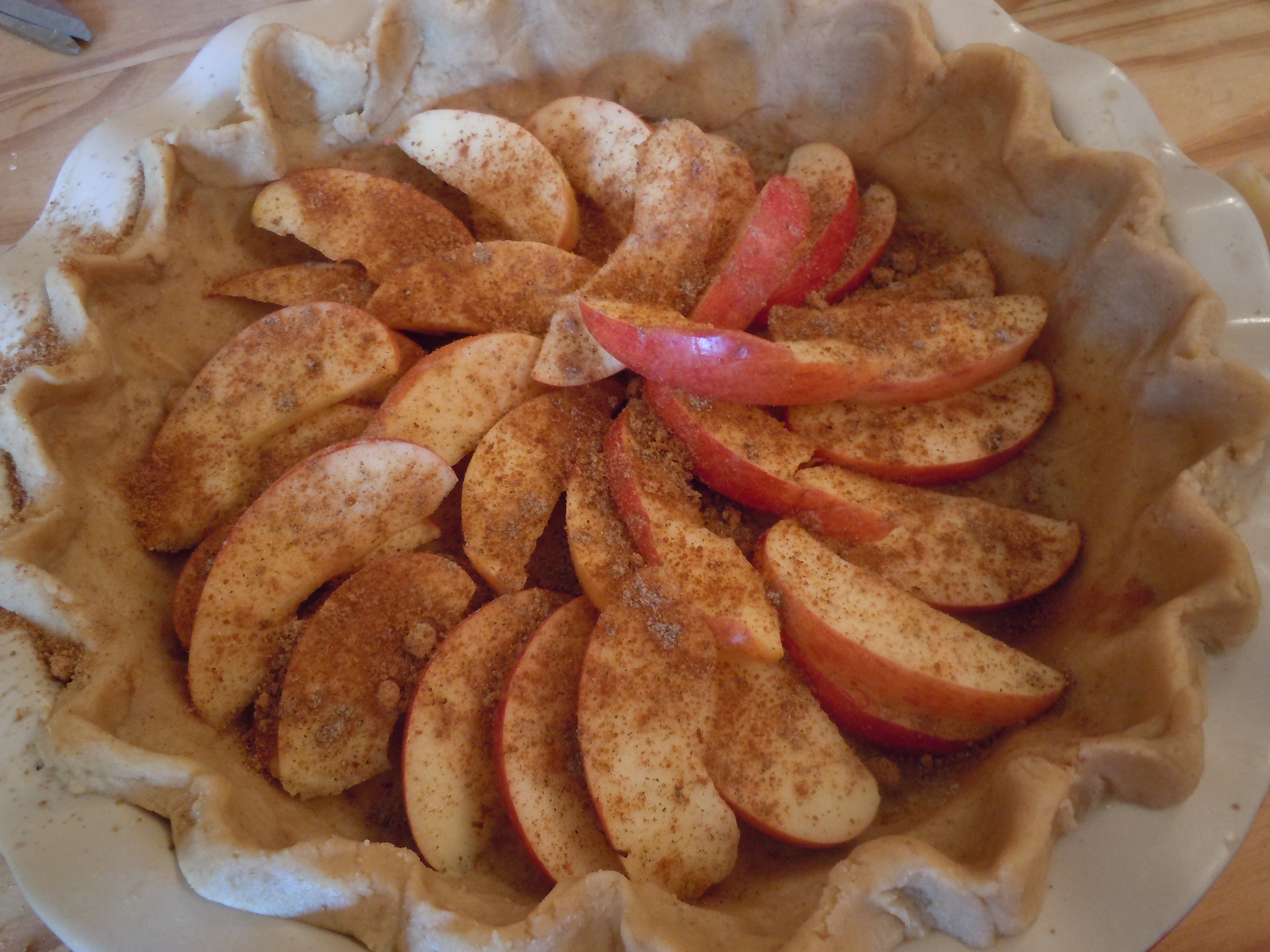 1 Arrange the sliced apples in the bottom of the pie pan. Sprinkle with half the sugar, cinnamon, and cardamom.