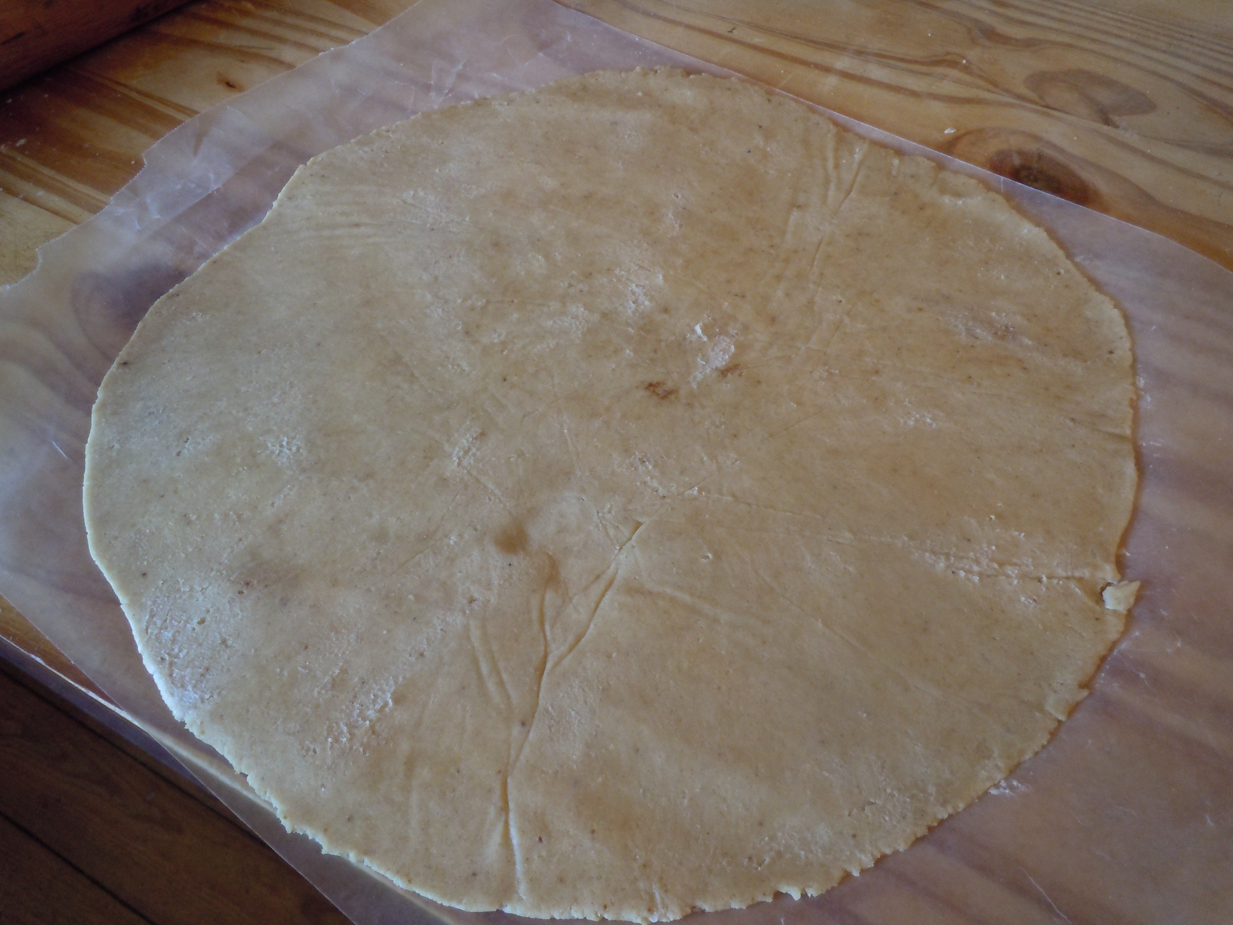 4 Roll the dough into a 10-11″ round between sheets of waxed paper.