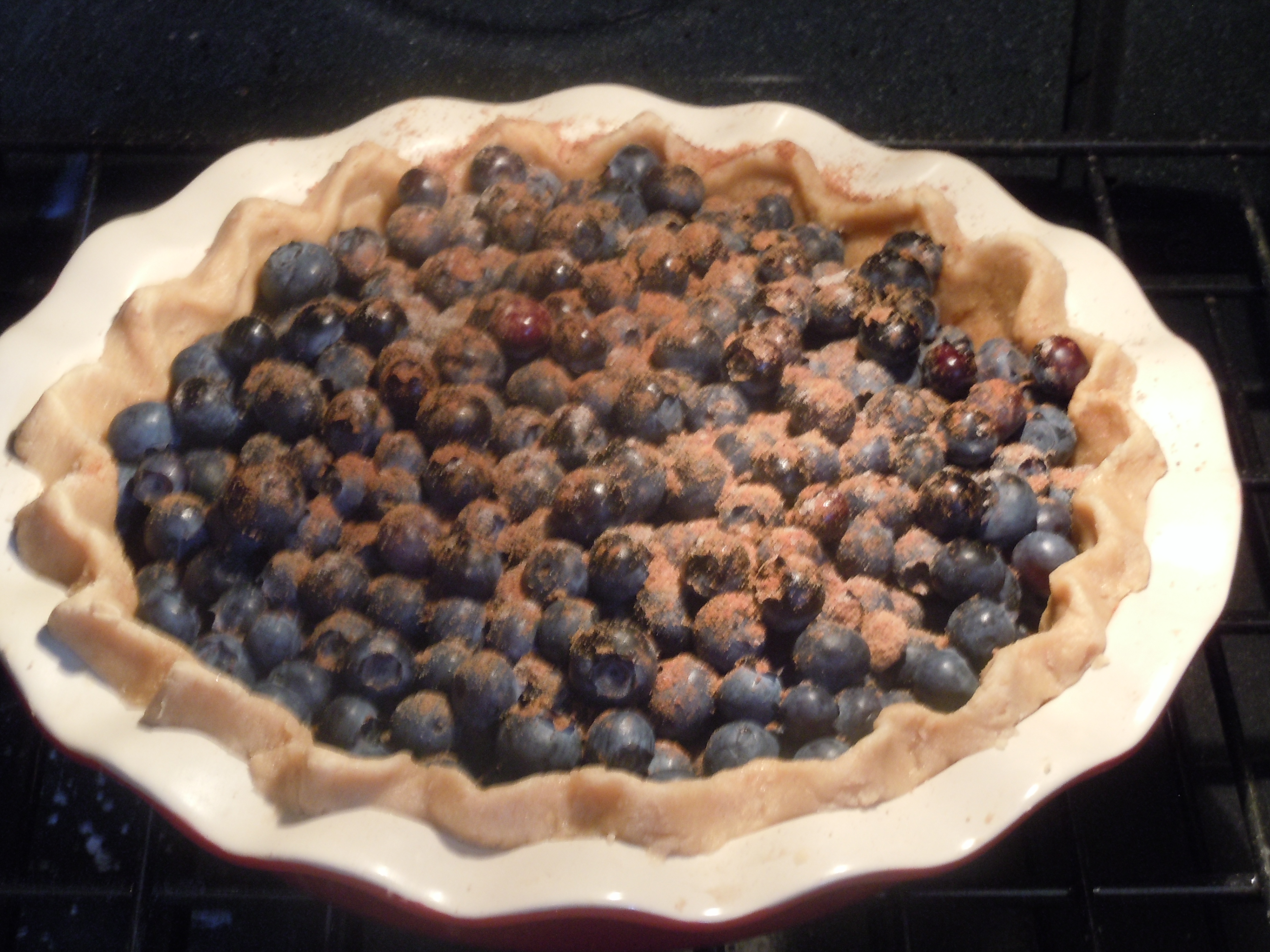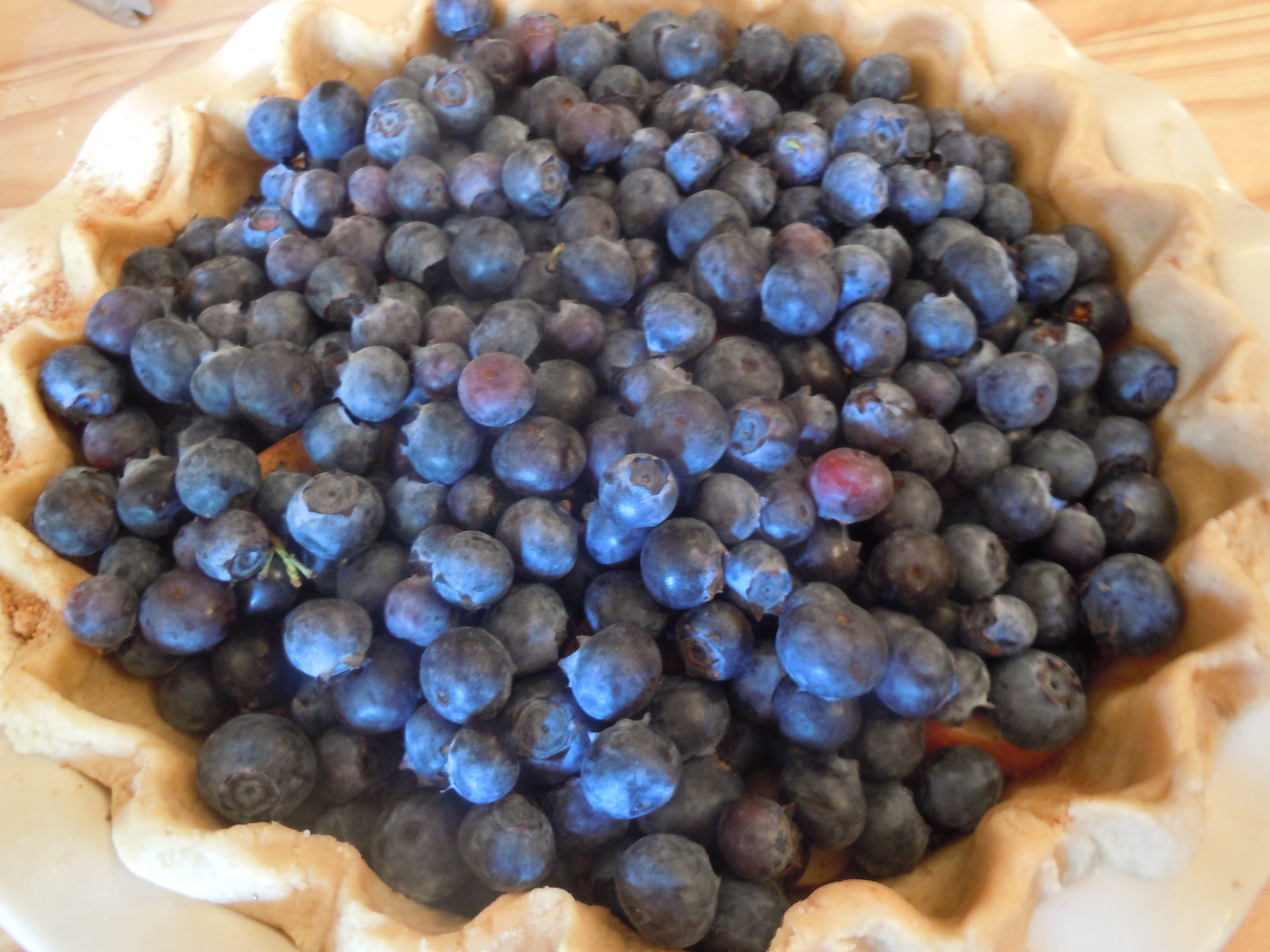 When blueberries are in season and at an affordable price, splurge on a berry pie! Add sliced apples to reduce the need for additional sugar and to provide pectin for setting. The crust is gluten-free, so it is a bit more fragile than pastry normally is, but if you roll it between sheets of wax paper, it is easy enough to transfer to the pie pan. Bake the pie for as long a it takes for the blueberries to burst and for the crust to brown without scorching — 30-45 minutes depending upon your oven. Let it cool to very nearly room temperature before serving. ~ Glyn