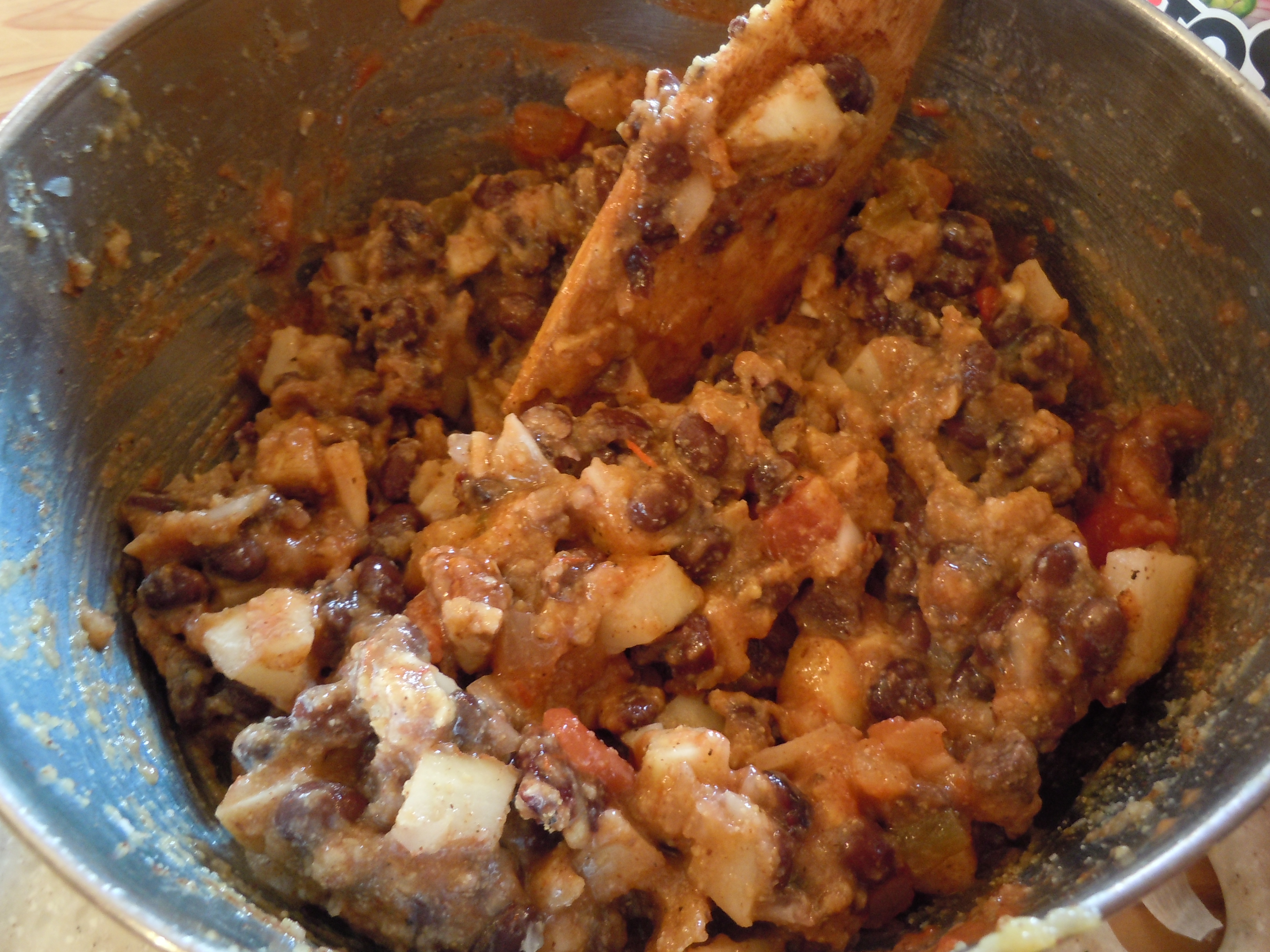 3 combine the diced potatoes, beans, onion, garlic, cranberries, chocolate, nuts, spices and salsa with the cooked cornmeal
