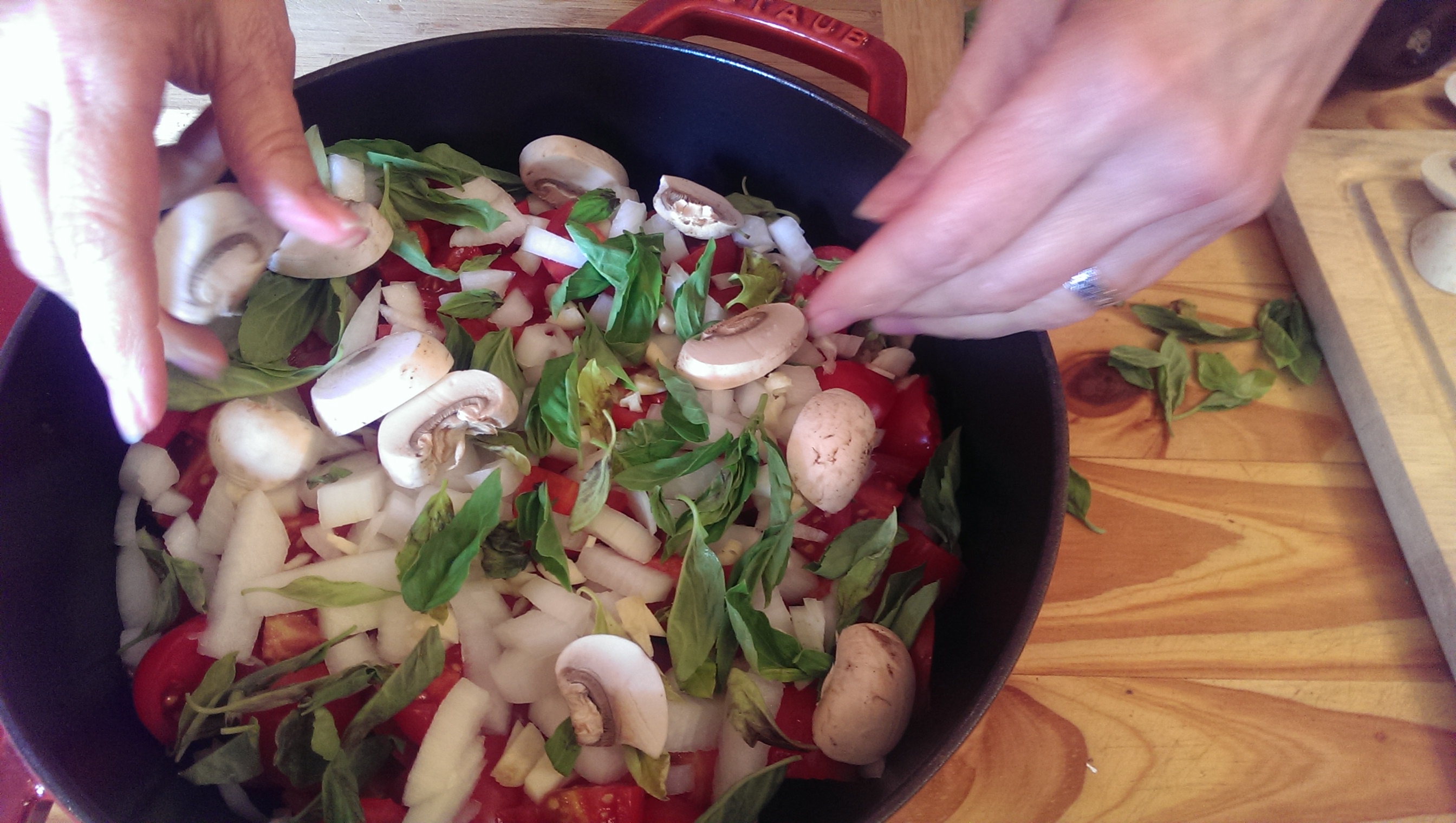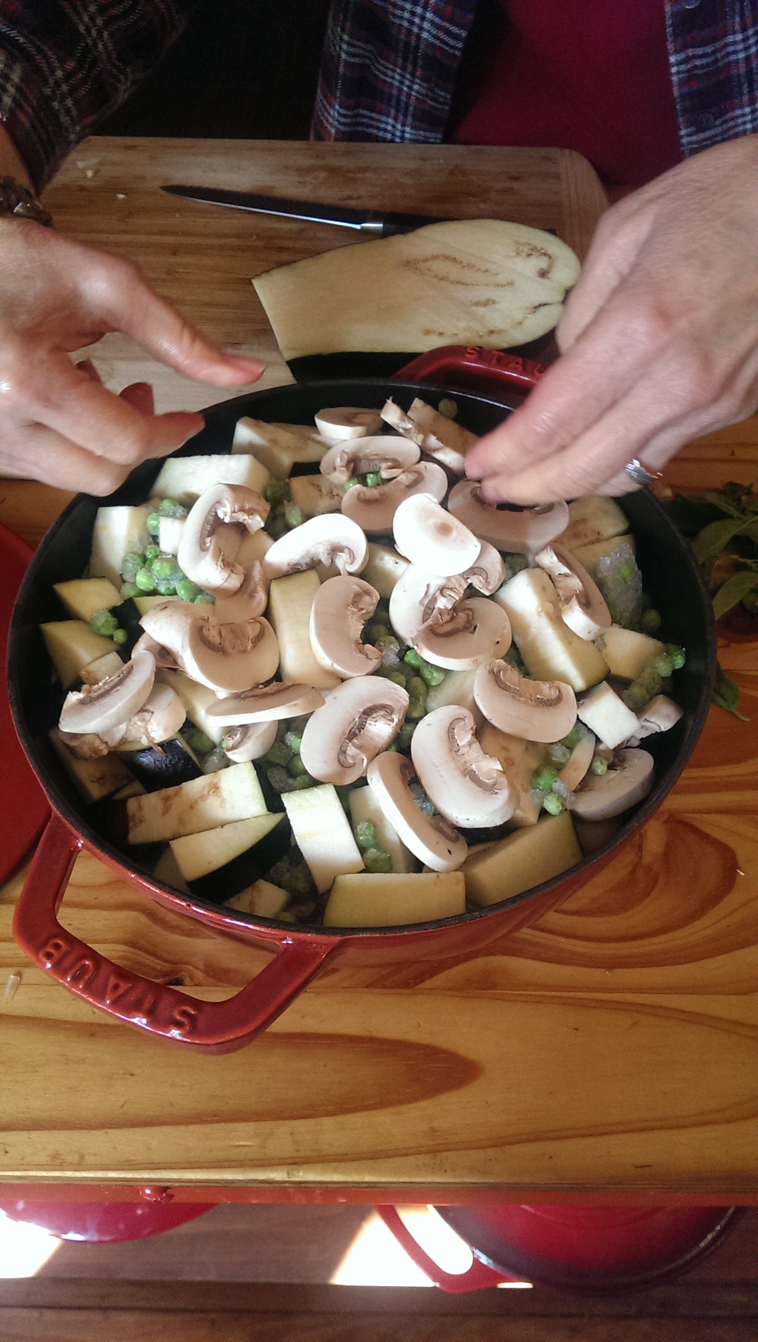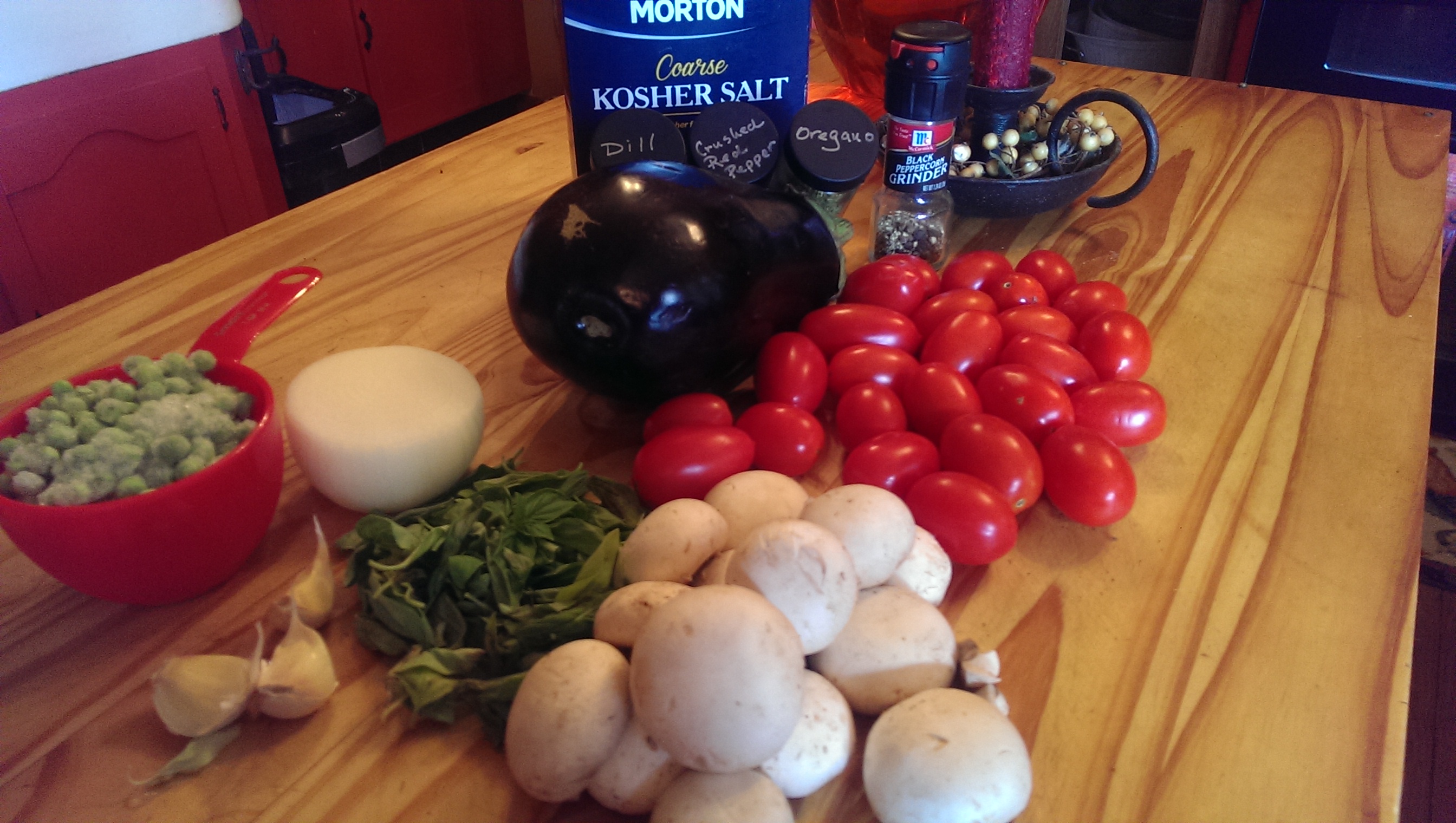 6 add the eggplant, peas, and remaining mushrooms and basil