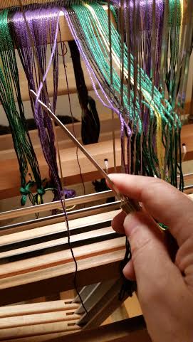 4-3-2-1, 4-3-2-1, 4-3-2-1 . . . black, green, yellow, green, black, purple. The mind is focused not on threading the heddles, but on hooking one specific thread out of 134, and pulling it through the eye of the one specific heddle destined for it. This is my weaving project, right here. The heddle, heddle hook, and purple thread you see in the second picture above. It has to be this way. It has to be this way if that far-off scarf is ever to appear.
