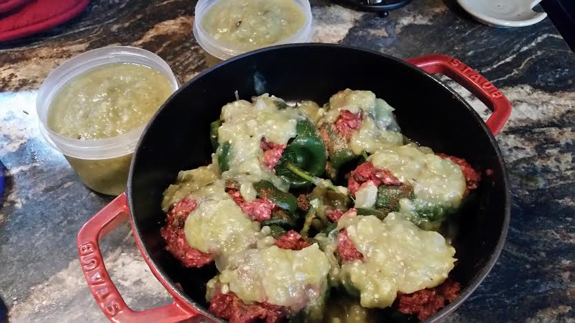Lamb Stuffed Poblanos with Tomatillo Sauce (serves 4 as a main course)